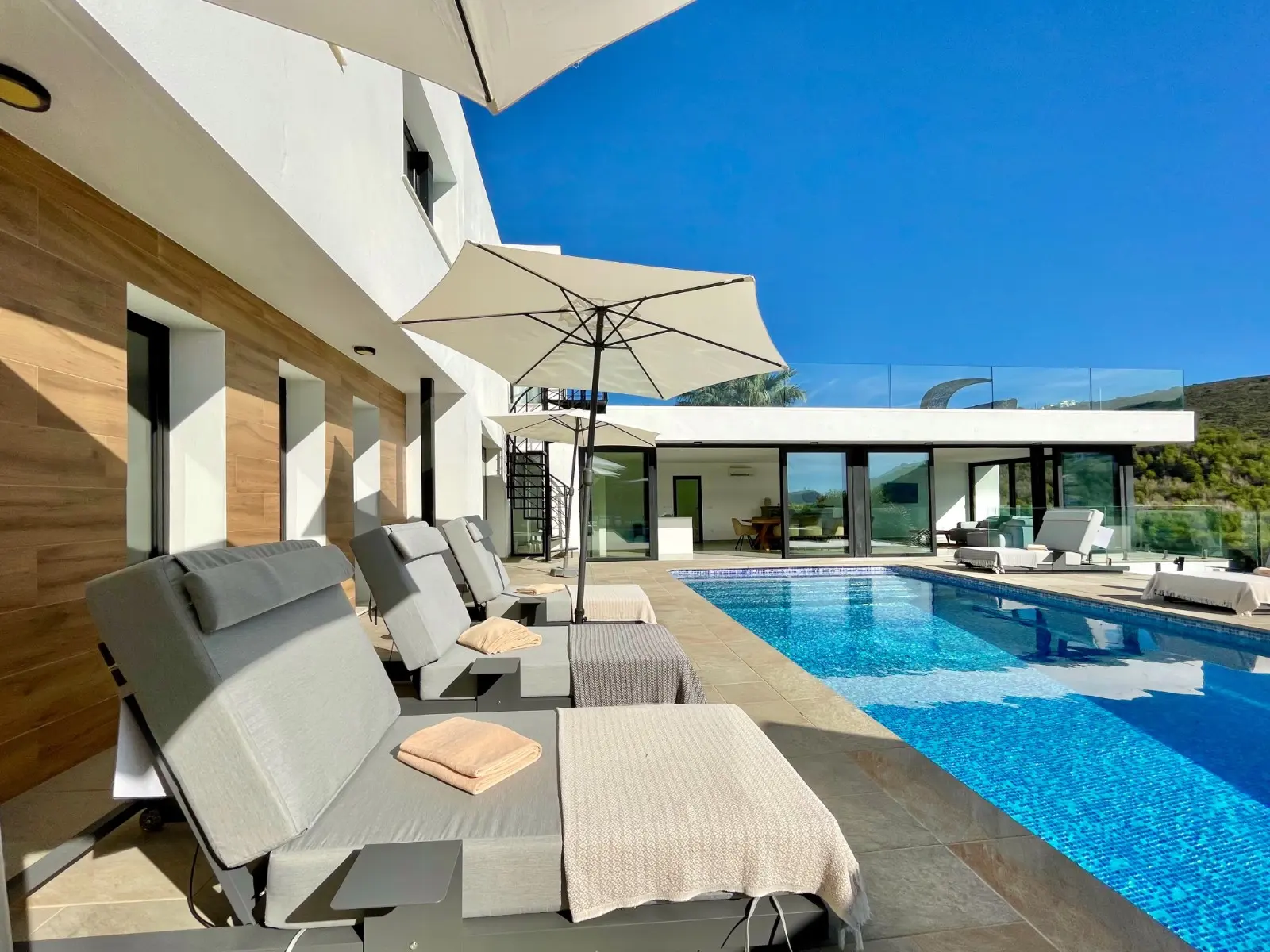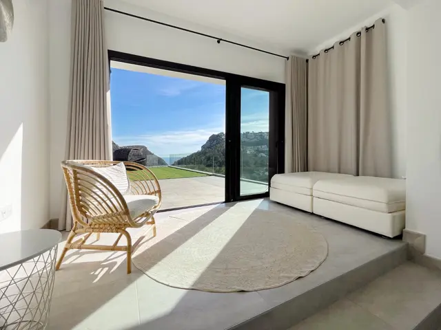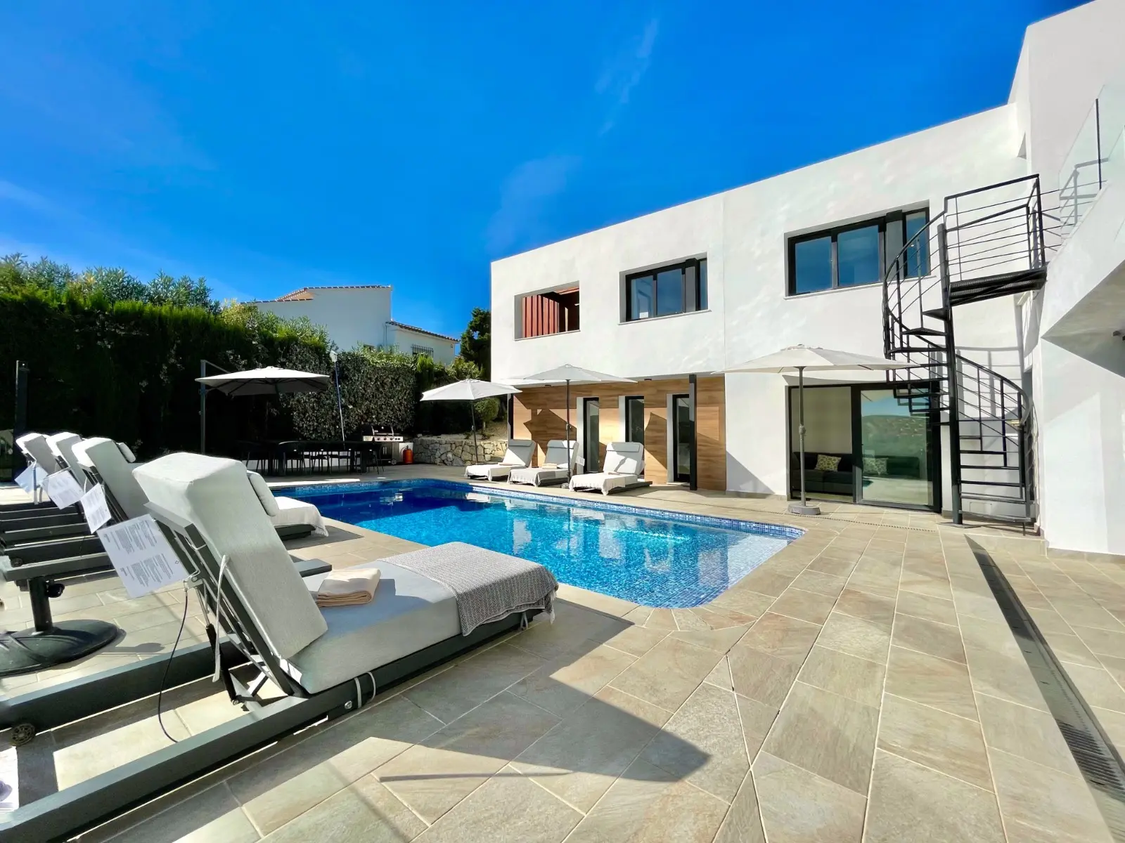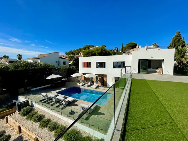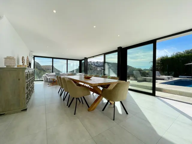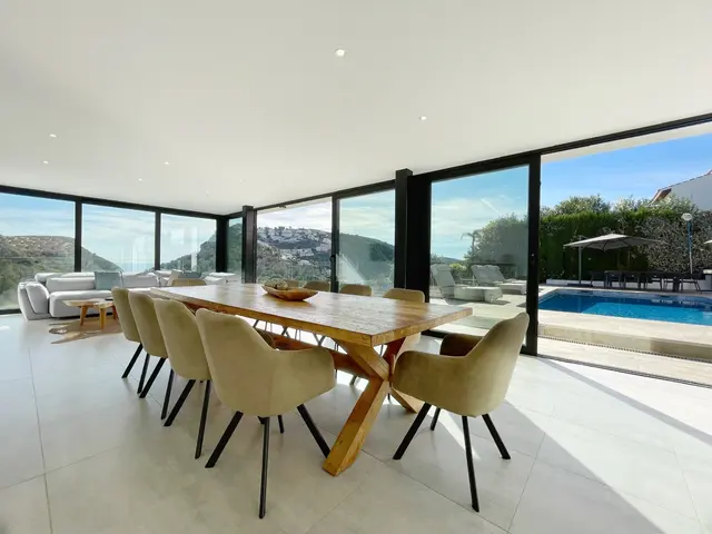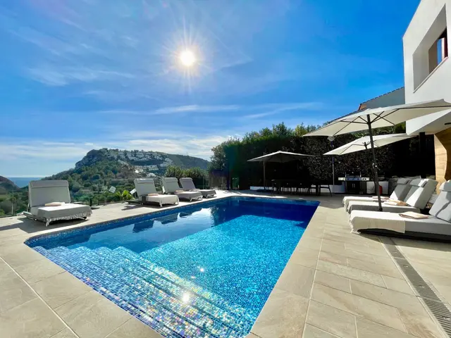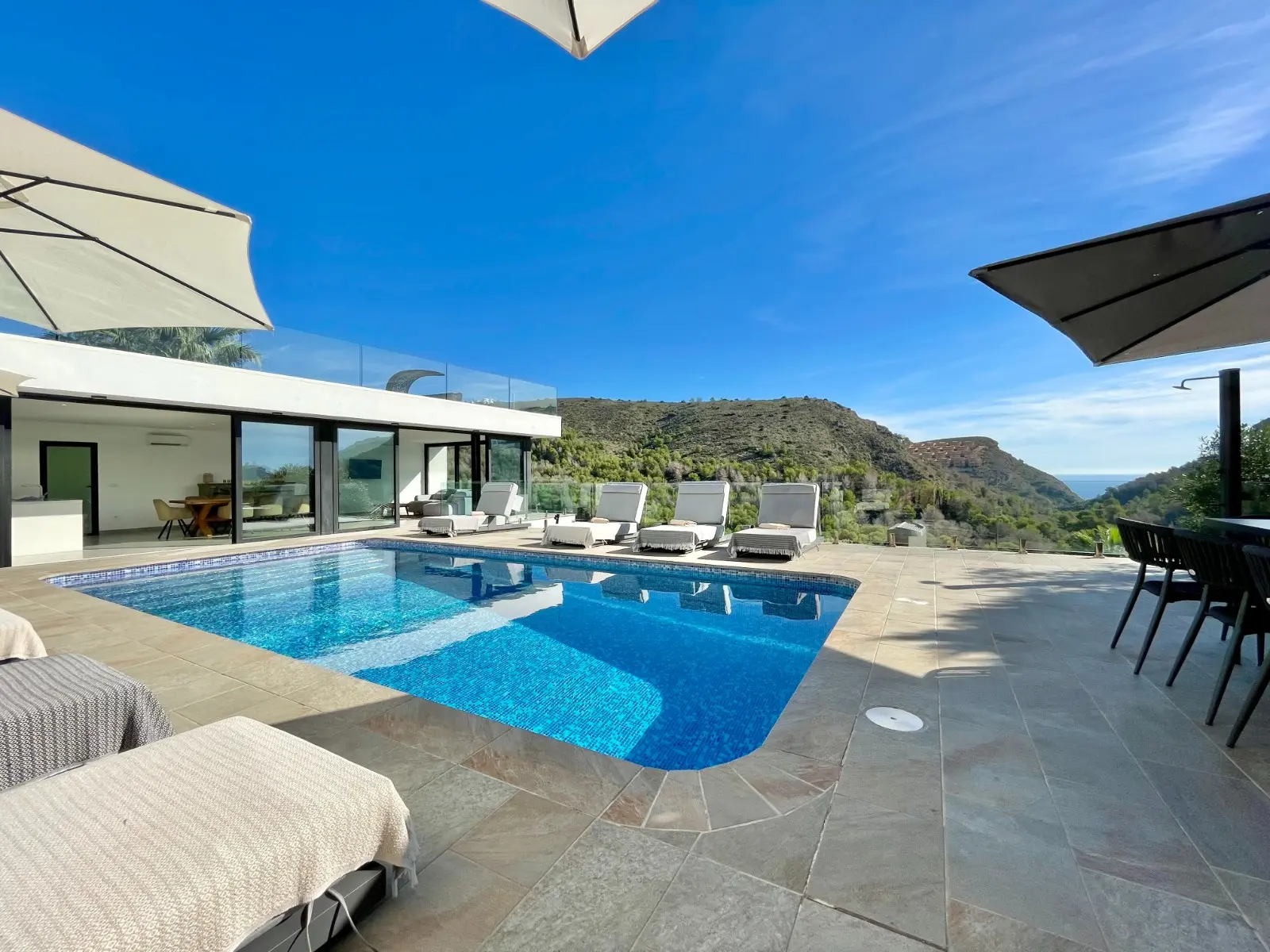 Ontdek deze moderne villa te koop in Moraira, gelegen op een ideale locatie met een fraai uitzicht over de vallei, de Zee en de baai van El Portet. De woning combineert een modern design met optimaal wooncomfort. Ideaal voor wie op zoek is naar een ruime woning aan de Costa Blanca. De woning beschikt over vier ruime slaapkamers en vier moderne badkamers, verdeeld over twee verdiepingen.