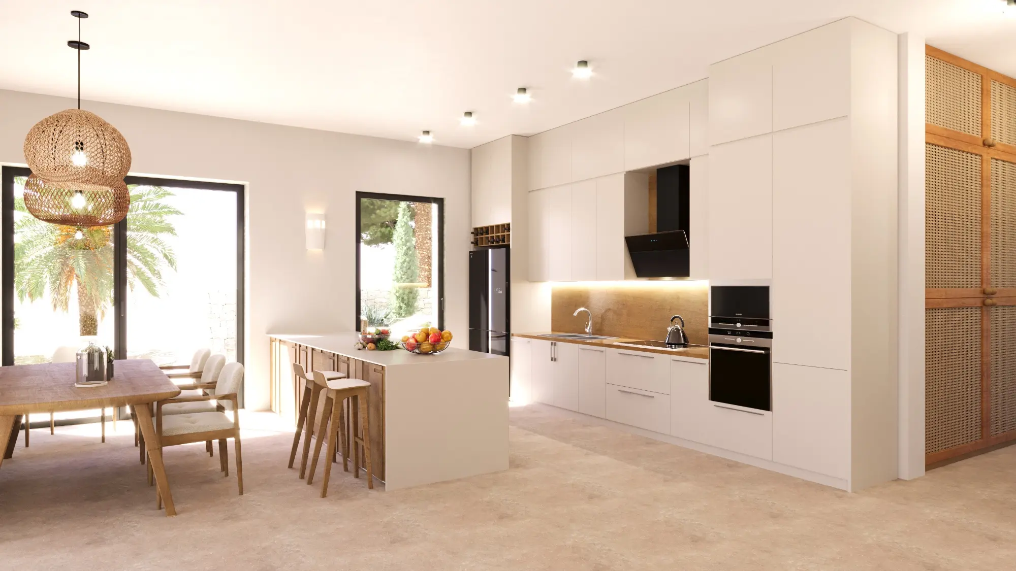 De begane grond bestaat uit een ruime woon/eetkamer, met veel natuurlijk licht, wat de perfecte plek is om te ontspannen, verder is er een open keuken, volledig uitgerust met moderne voorzieningen met uitzicht op het buitenterras.