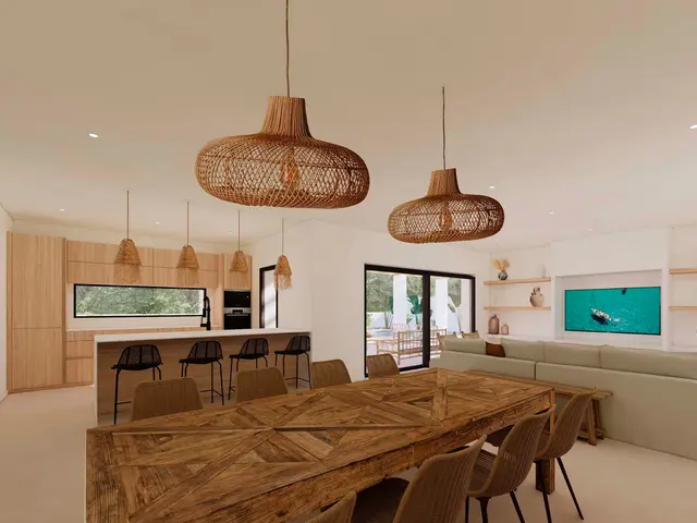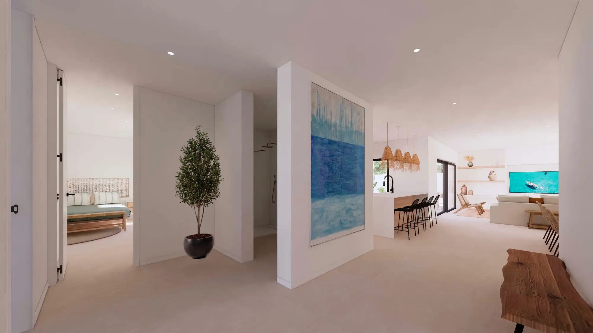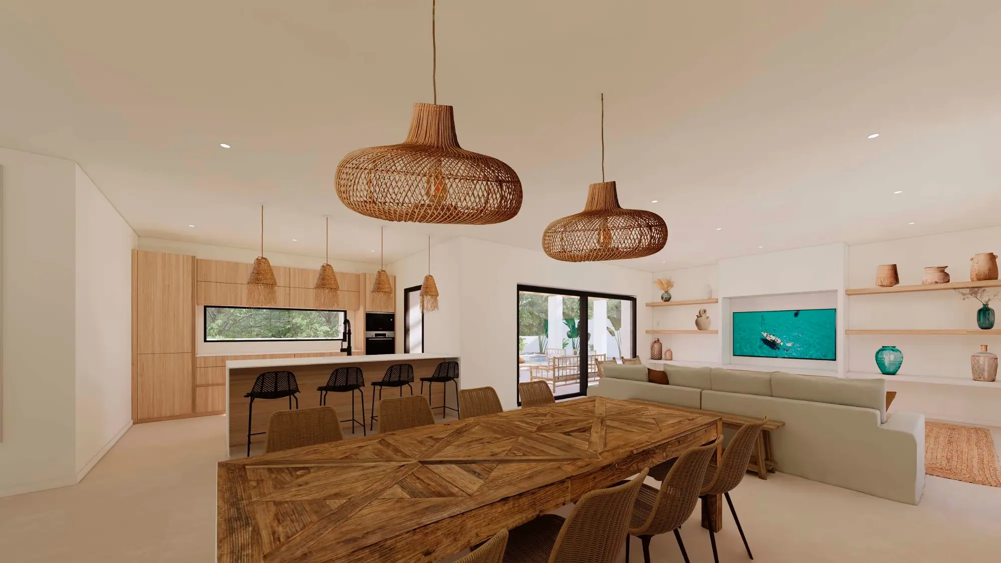 Deze mooie Ibizastijl woning ligt in een rustige urbanisatie in Moraira op korte afstand van het centrum, het strand en alle voorzieningen.De villa bestaat uit een grote woon- en eetkamer met een volledig uitgeruste open keuken, vier slaapkamers, waarvan twee met een en-suite badkamer en een andere individuele familiebadkamer. Alles op één verdieping! Daarnaast is er ook een wasruimte/bijkeuken.