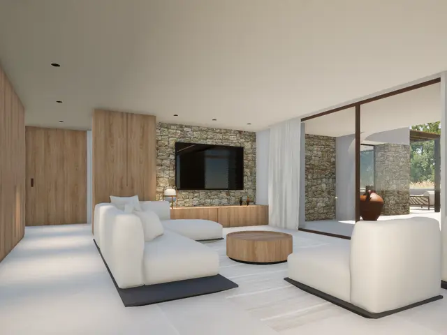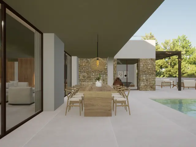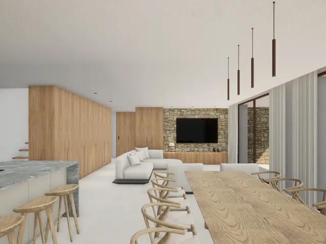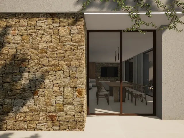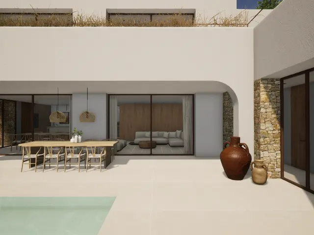 De villa heeft een klein uitzicht op zee, een zuidwestelijke oriëntatie en wordt verdeeld over drie verdiepingen. Op de begane grond (zwembadniveau) is de entree van de villa. We komen binnen in een mooie hal met gastentoilet. Meteen rechts komen we in de ruime open woon-eetkamer met de keuken en bijkeuken. Op deze zelfde verdieping bevindt zich de hoofdslaapkamer. Deze kamer heeft een ruime badkamer en-suite en een eigen kleedkamer. Tot slot is er nog een tweede slaapkamer en-suite. Via de trap of een lift gaan we naar de bovenverdieping waar zich nog twee slaapkamers en-suite bevinden. Beide hebben directe toegang tot een privéterras. In de onderbouw is een grote, multifunctionele ruimte, apart toilet, fitnessruimte, bioscoop en wasruimte. Op dit niveau vinden we ook de garage. Door de ramen van vloer tot plafond heeft de villa veel natuurlijk licht.