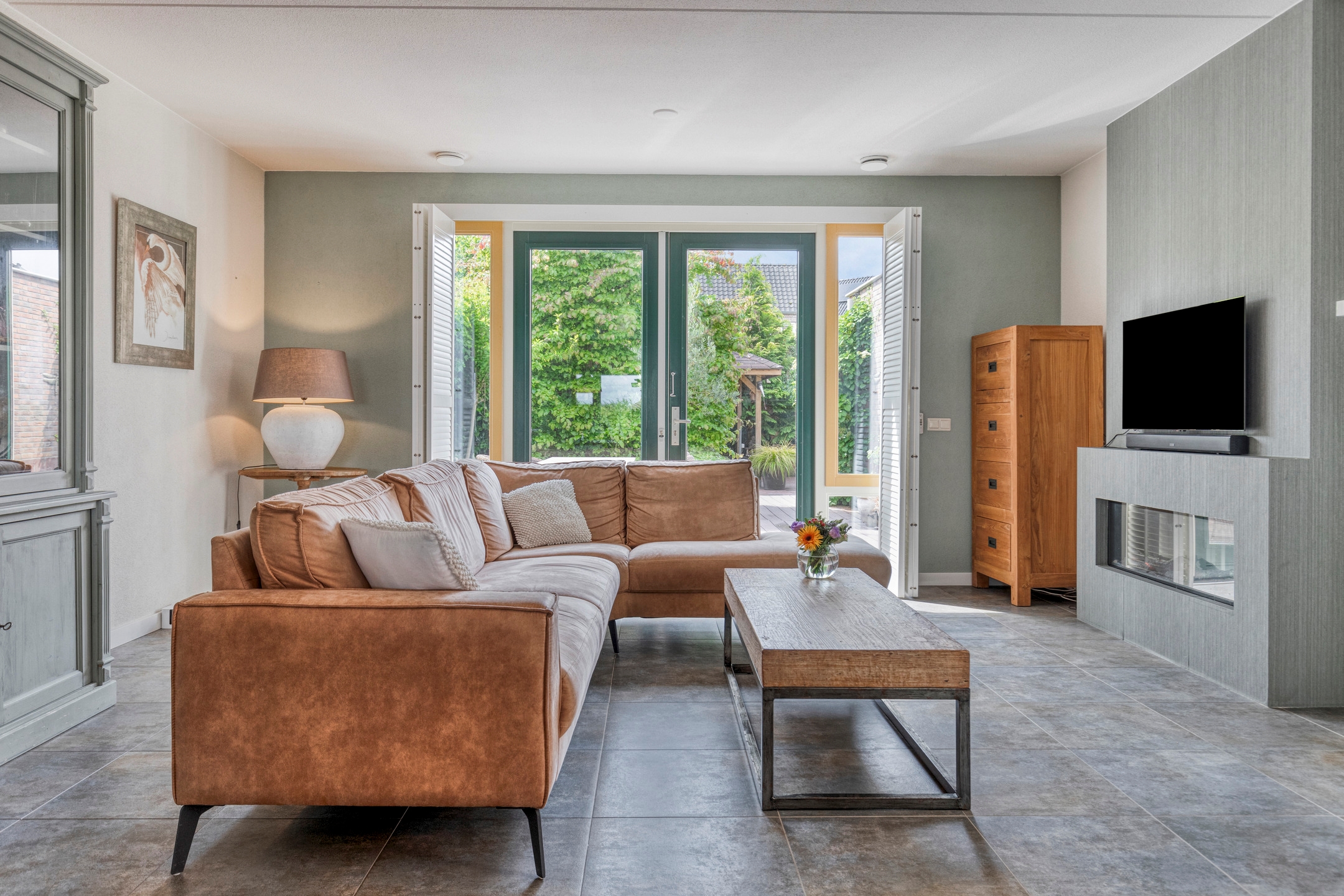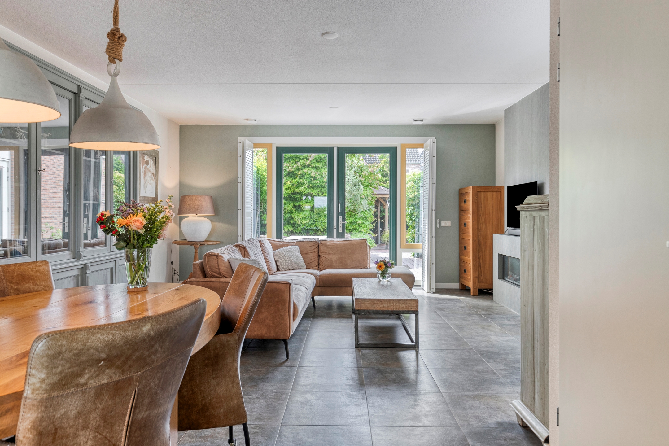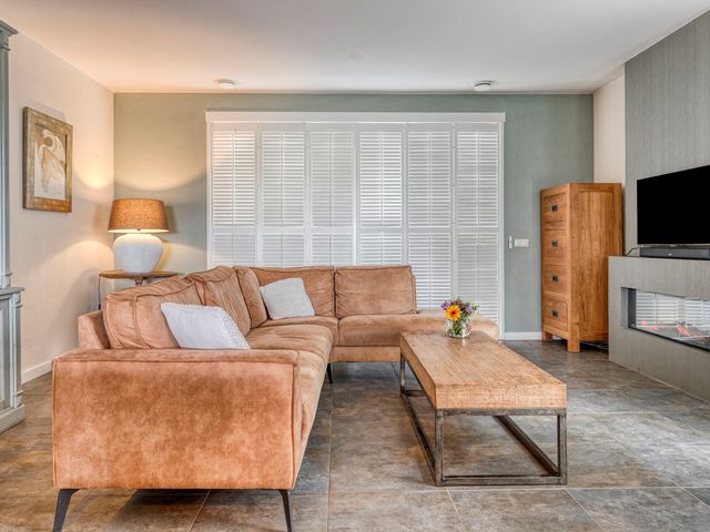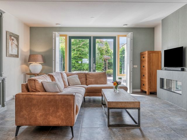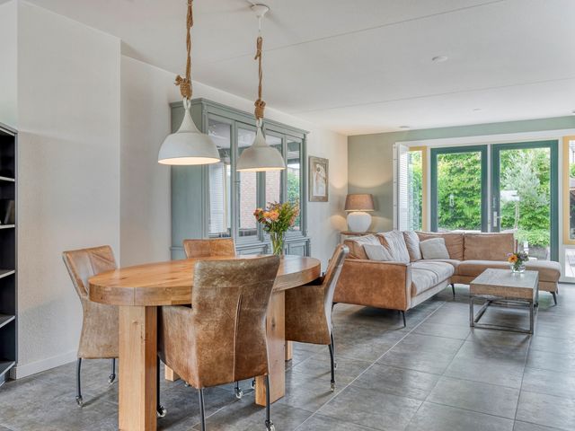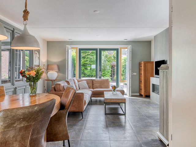 De royale en lichte woonkamer is voorzien van een knusse sfeerhaard en een vaste kast. Vanuit de woonkamer kunt u middels tuindeuren, die zijn voorzien van afsluitbare luiken, naar de achtertuin.