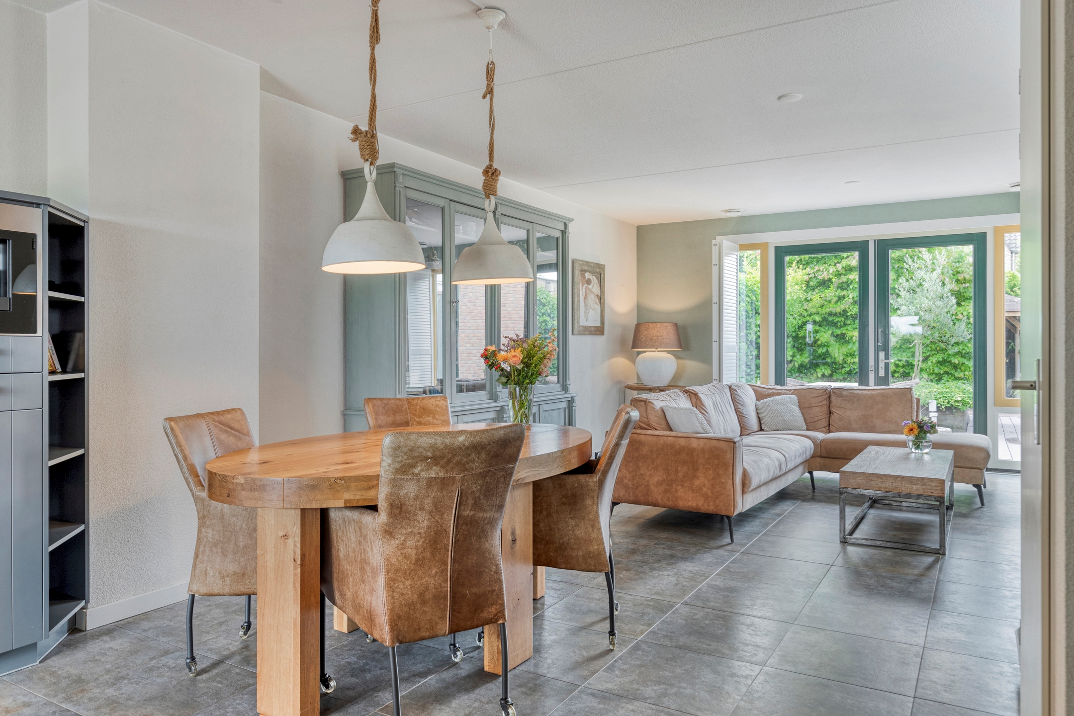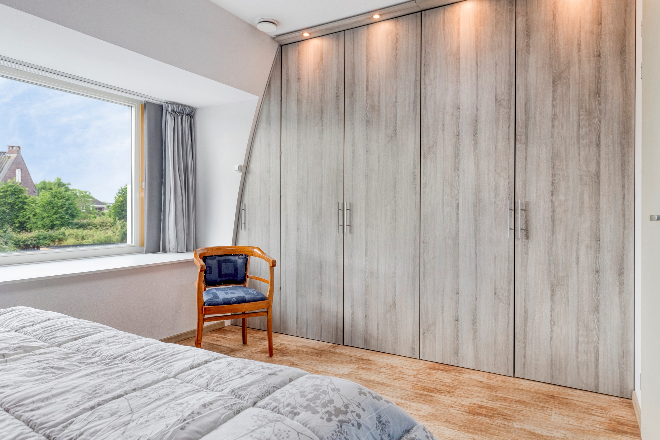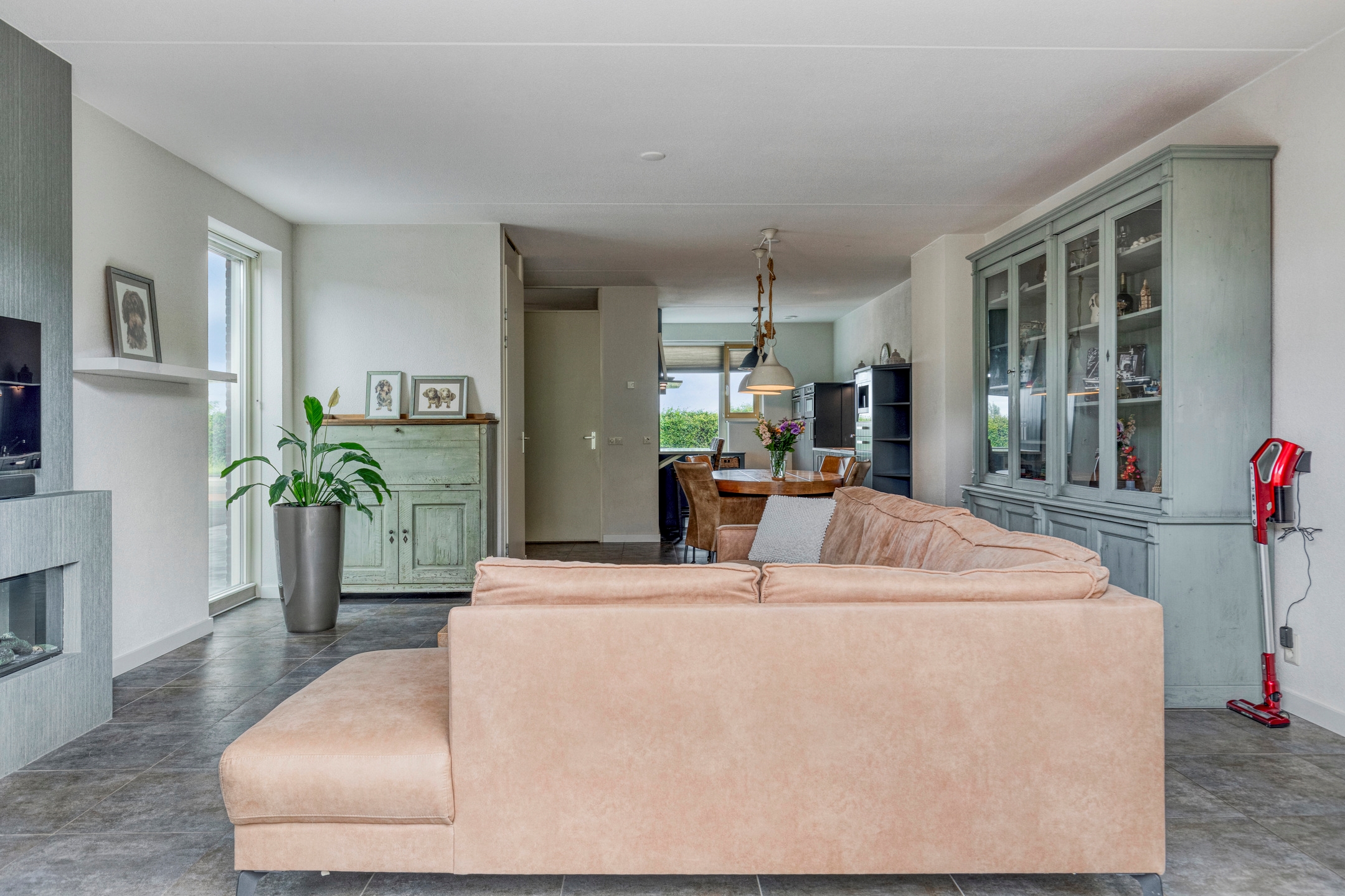 De royale en lichte woonkamer is voorzien van een knusse sfeerhaard en een vaste kast. Vanuit de woonkamer kunt u middels tuindeuren, die zijn voorzien van afsluitbare luiken, naar de achtertuin.