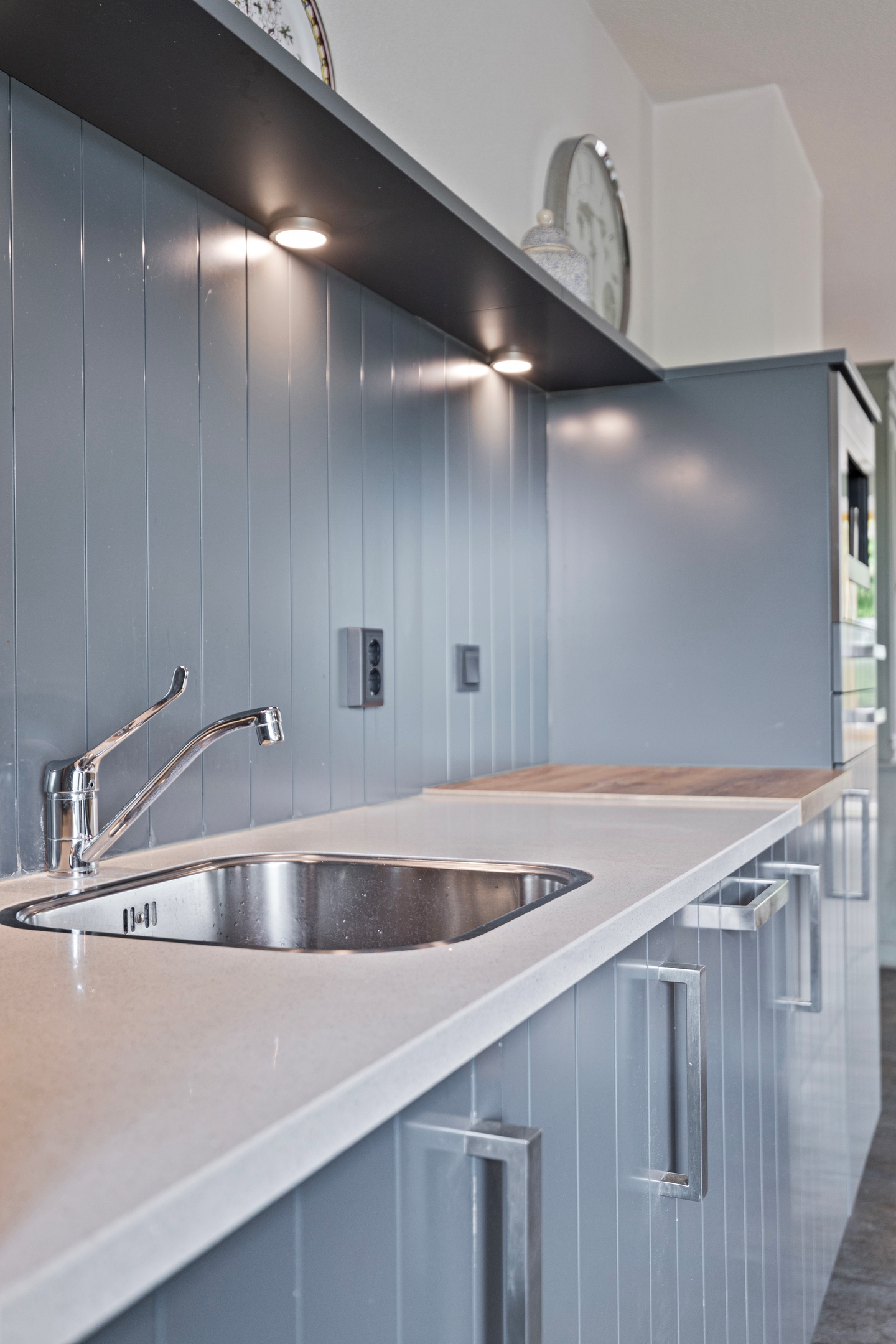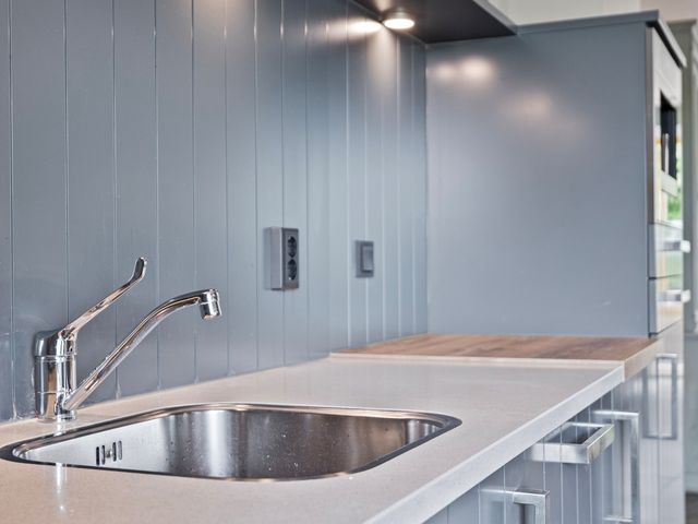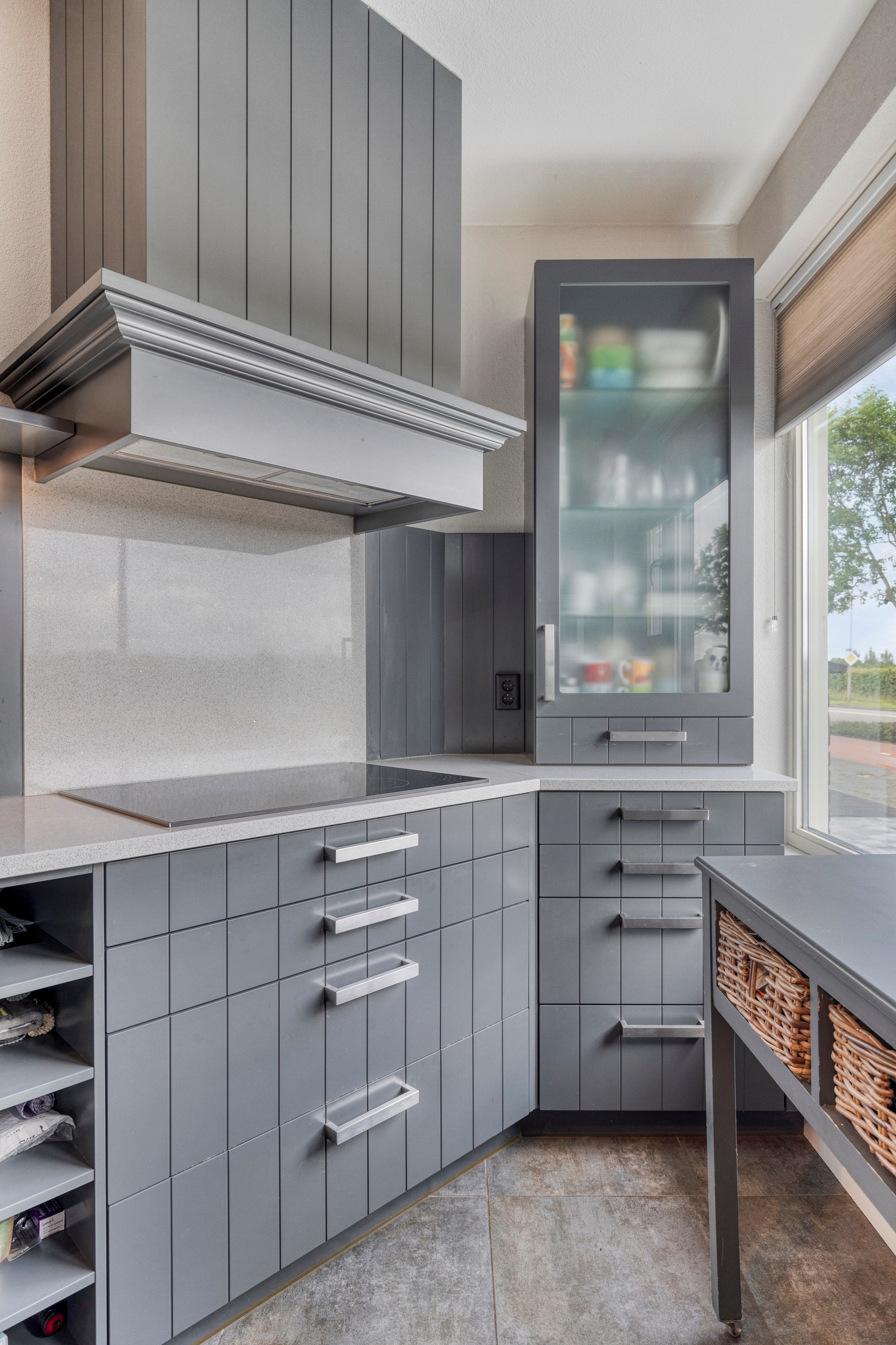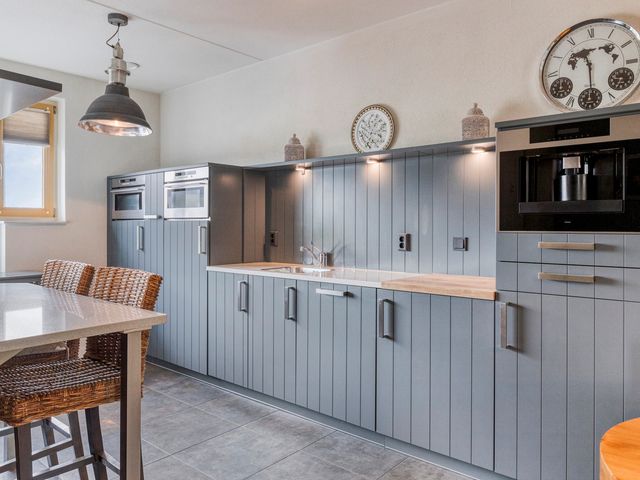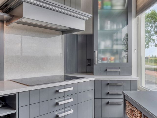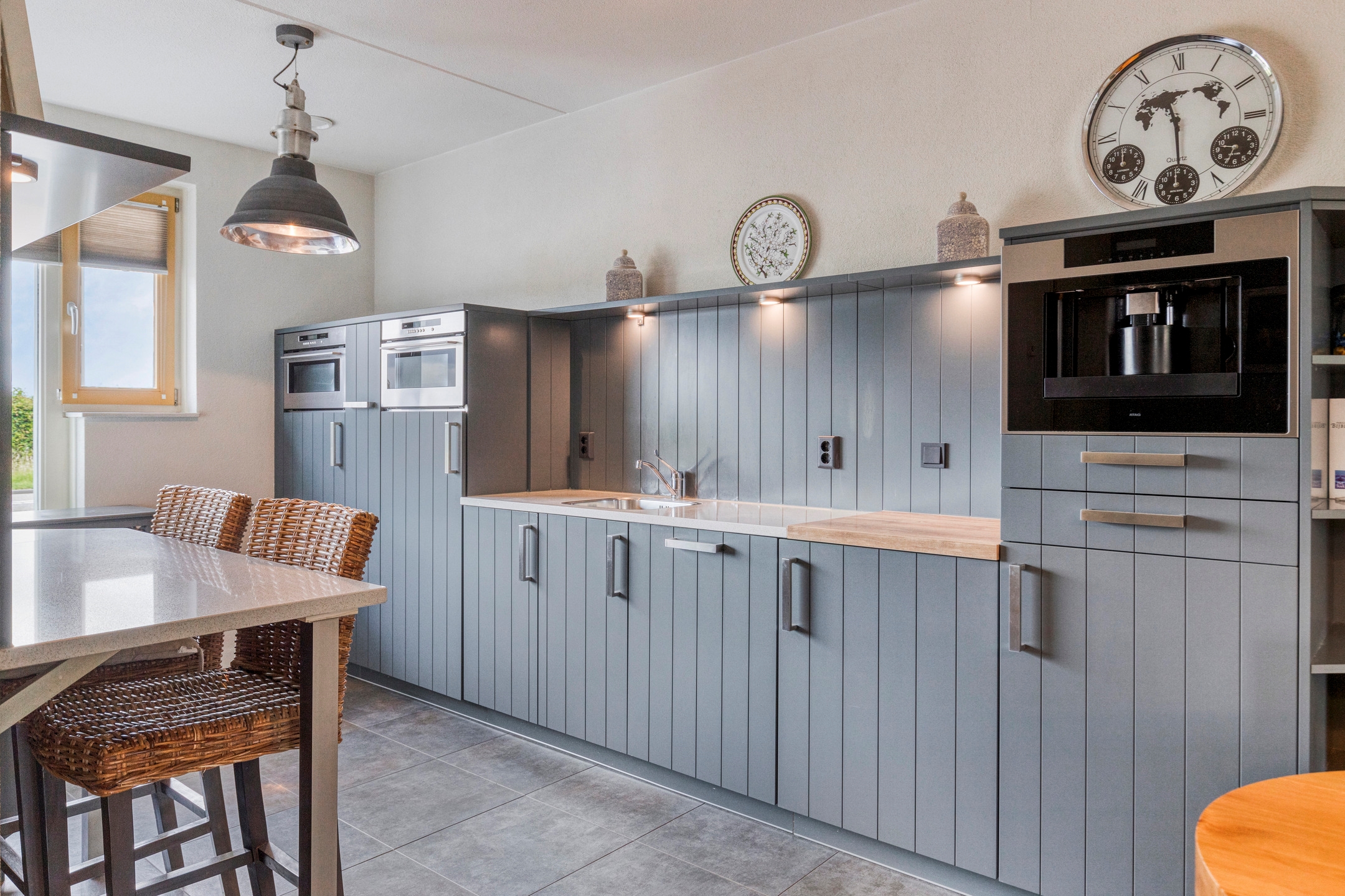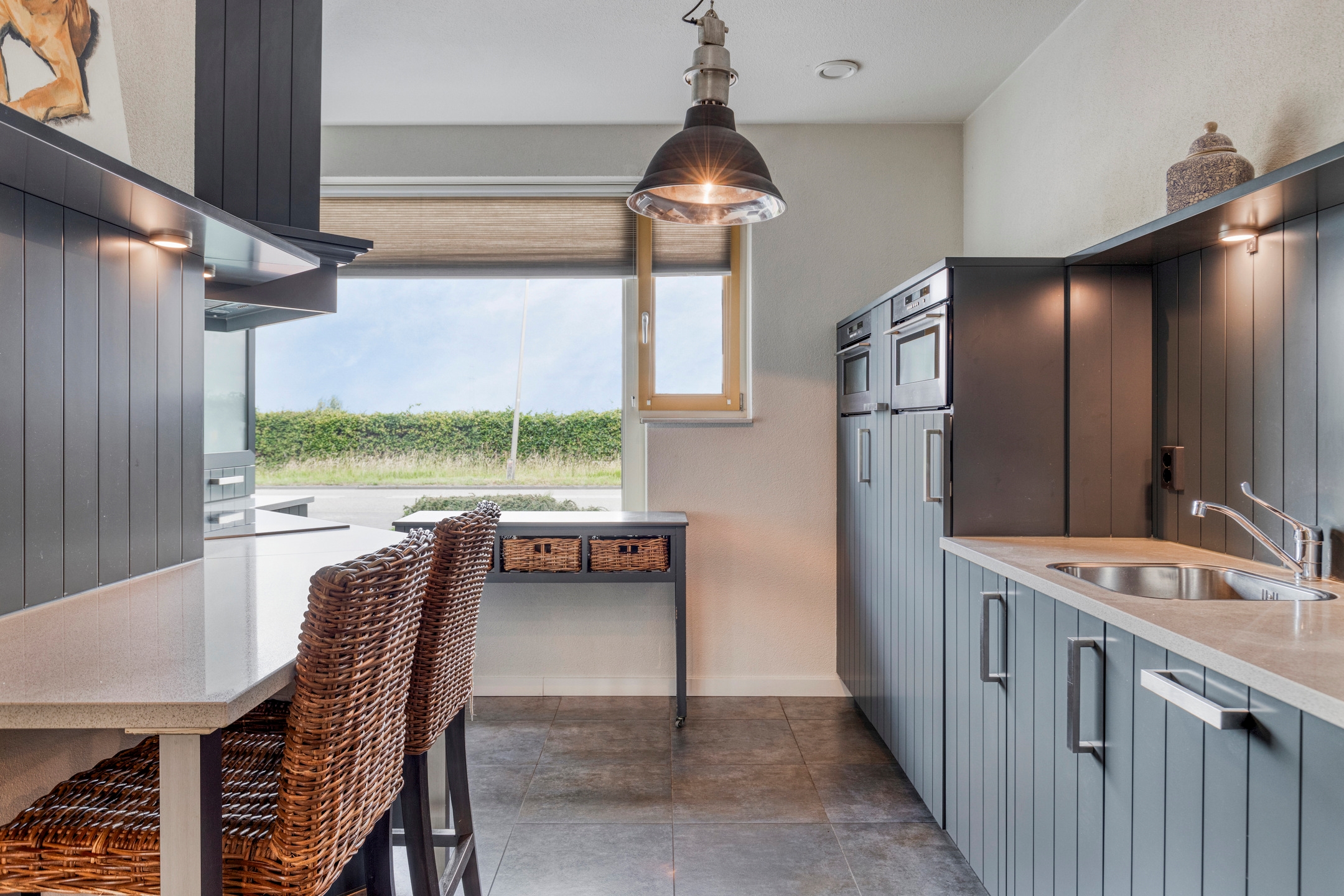 De keuken staat in semi-open verbinding met de woonkamer en is gelegen aan de voorzijde van de woning. De keuken is voorzien van een wandopstelling met een composiet aanrechtblad, de keuken is voorzien van boven- en onderkasten, inductiekookplaat met afzuigkap, een vaatwasser, oven, magnetron en een ingebouwde koffiemachine.