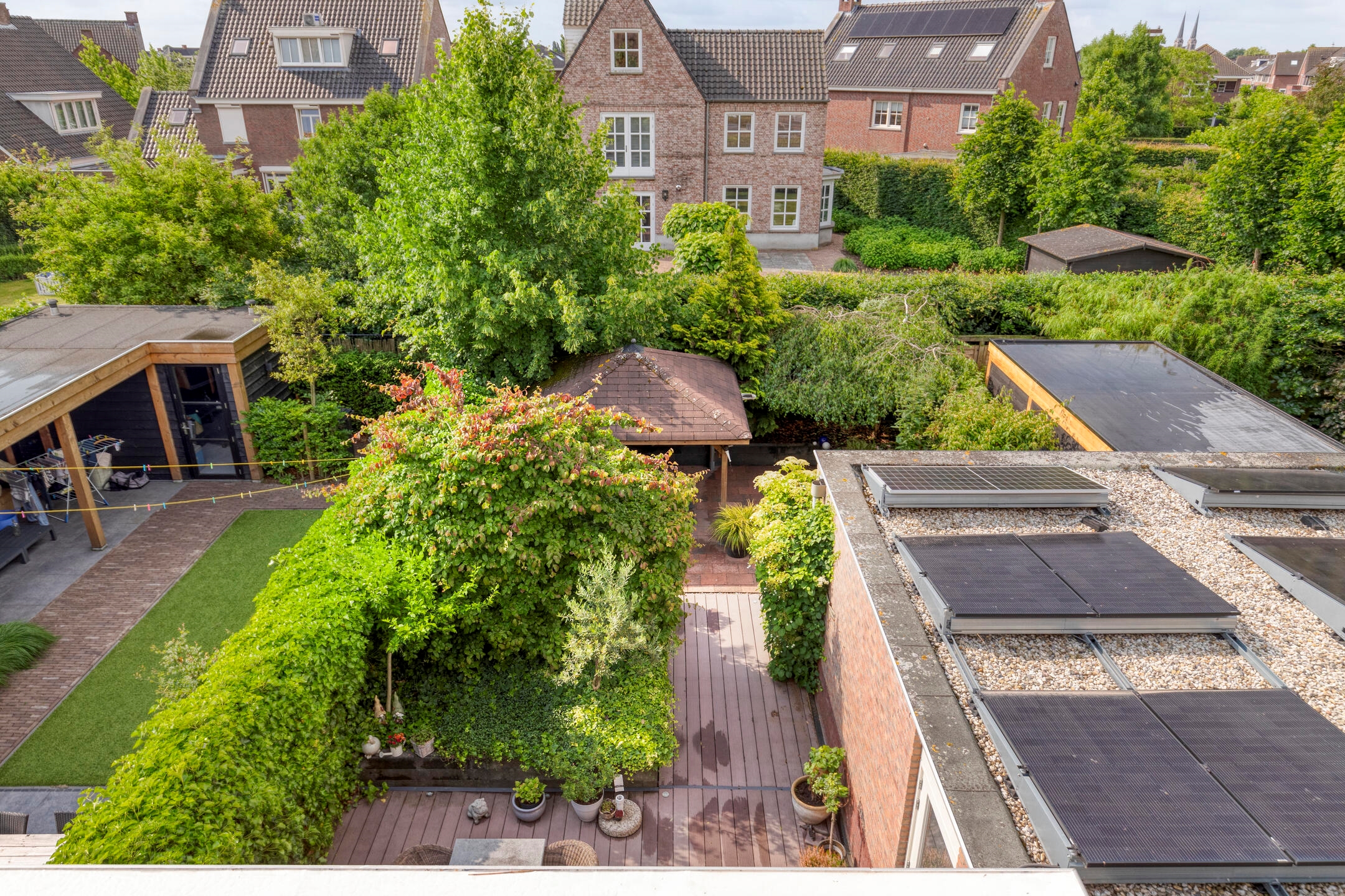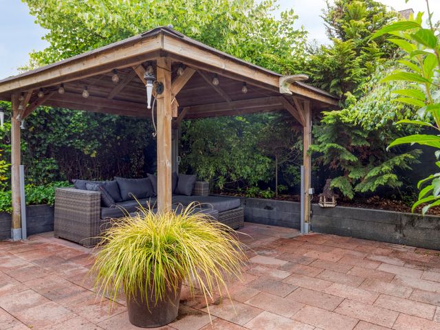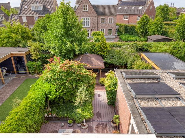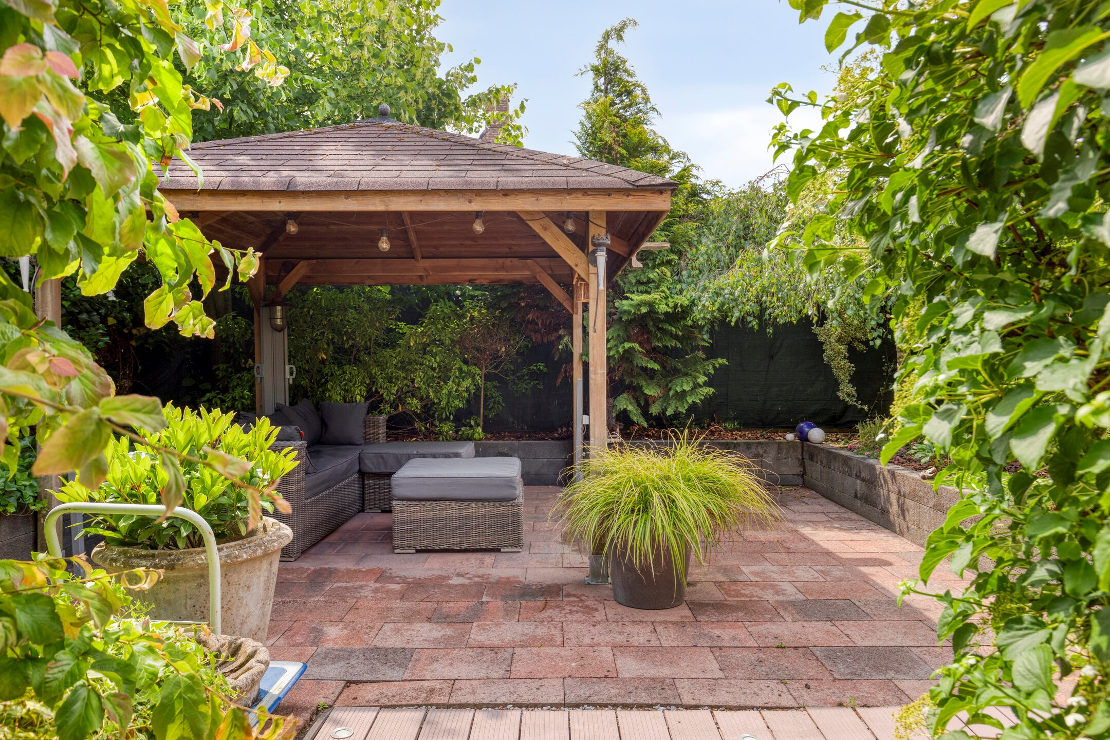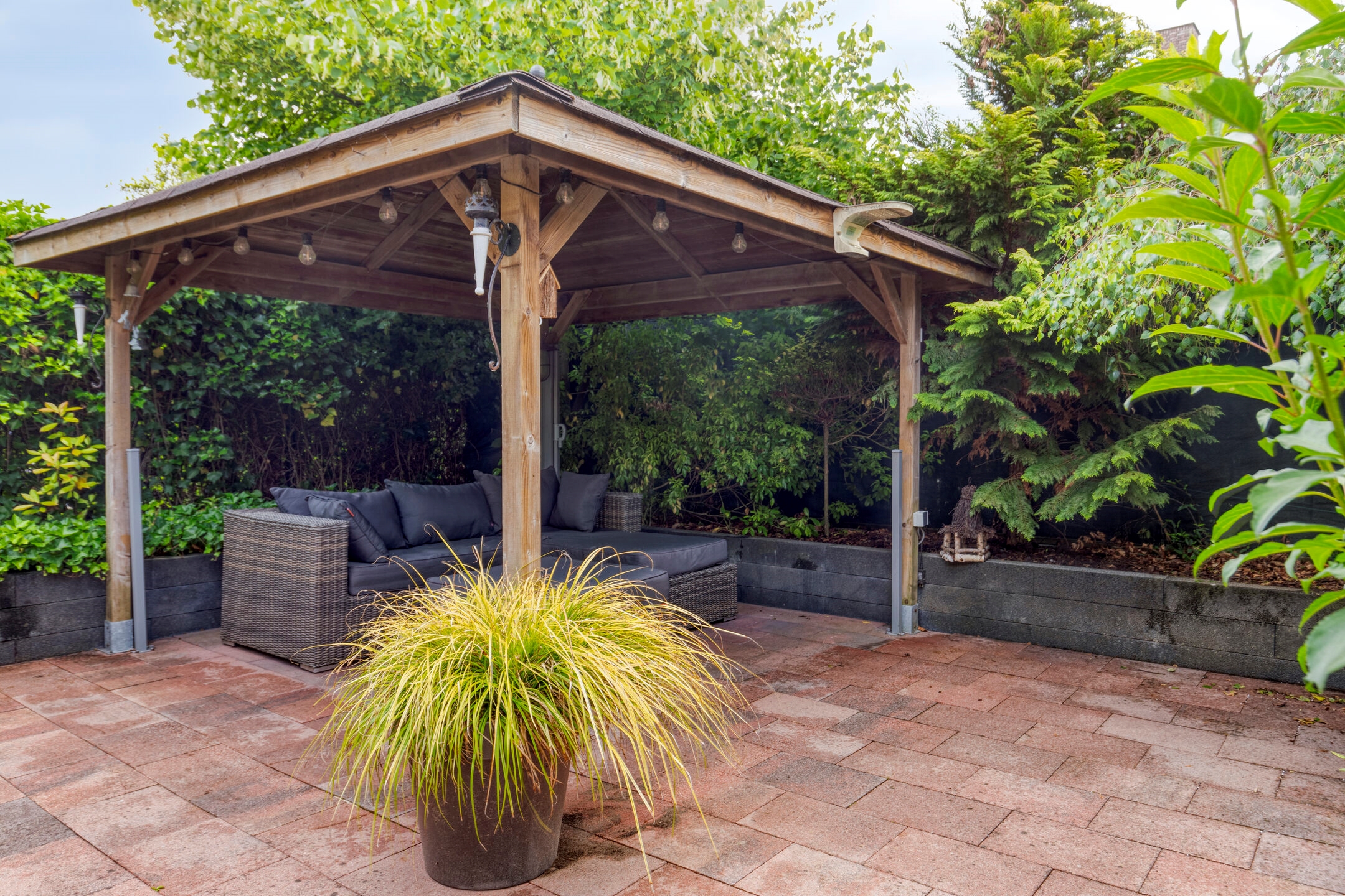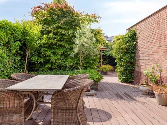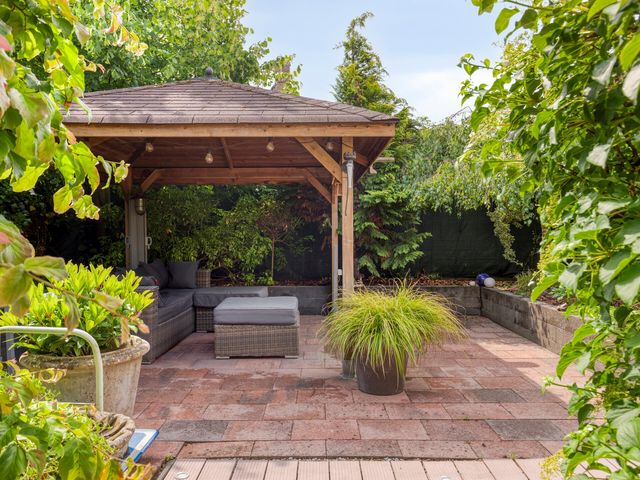 De diepe en zonnige achtertuin is gelegen op het zuiden en voorzien van sierbestrating, vlonder, grind, vaste planten en een fraaie overkapping omringd met een verhoogde border.