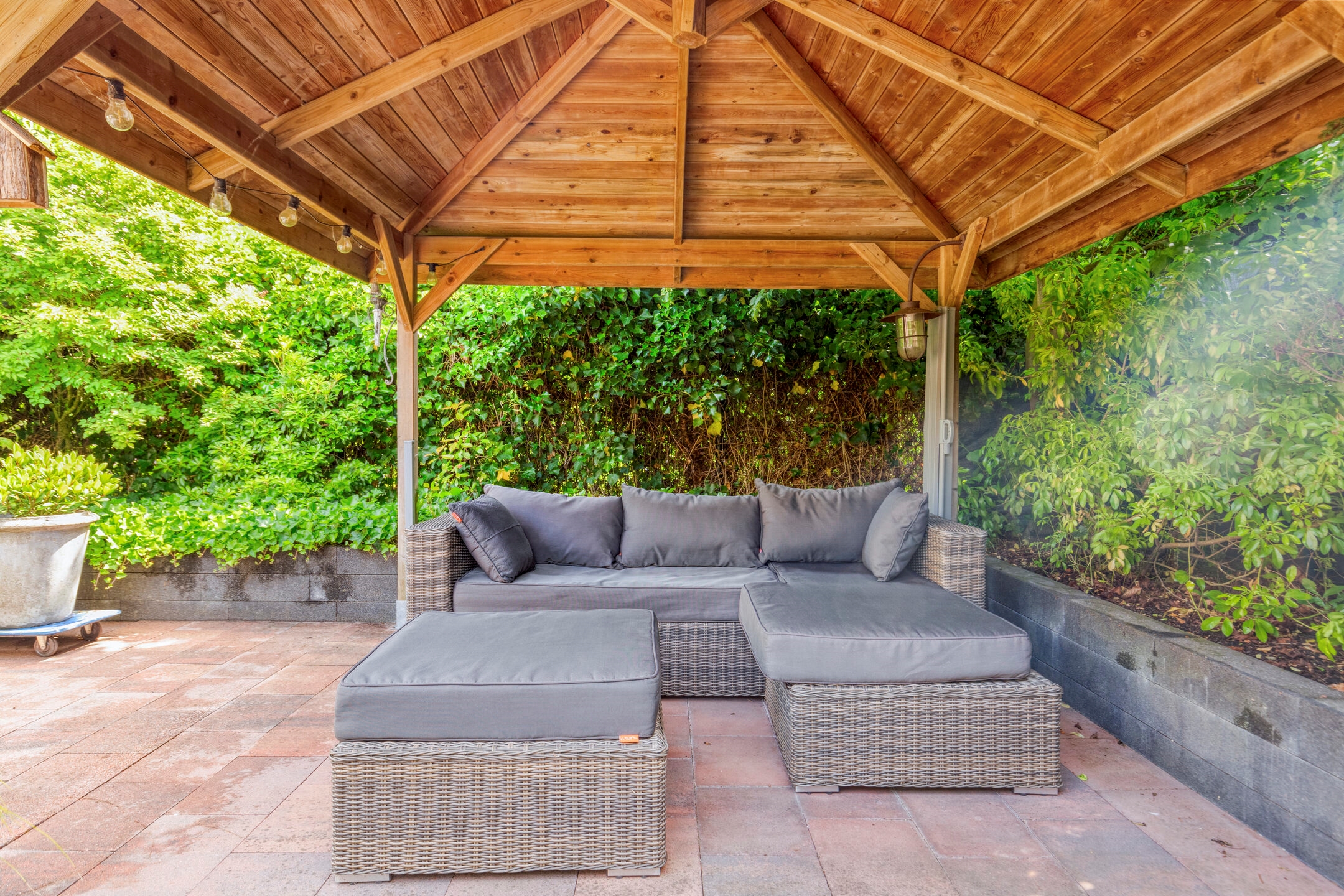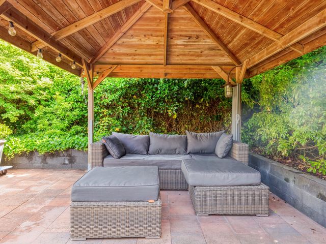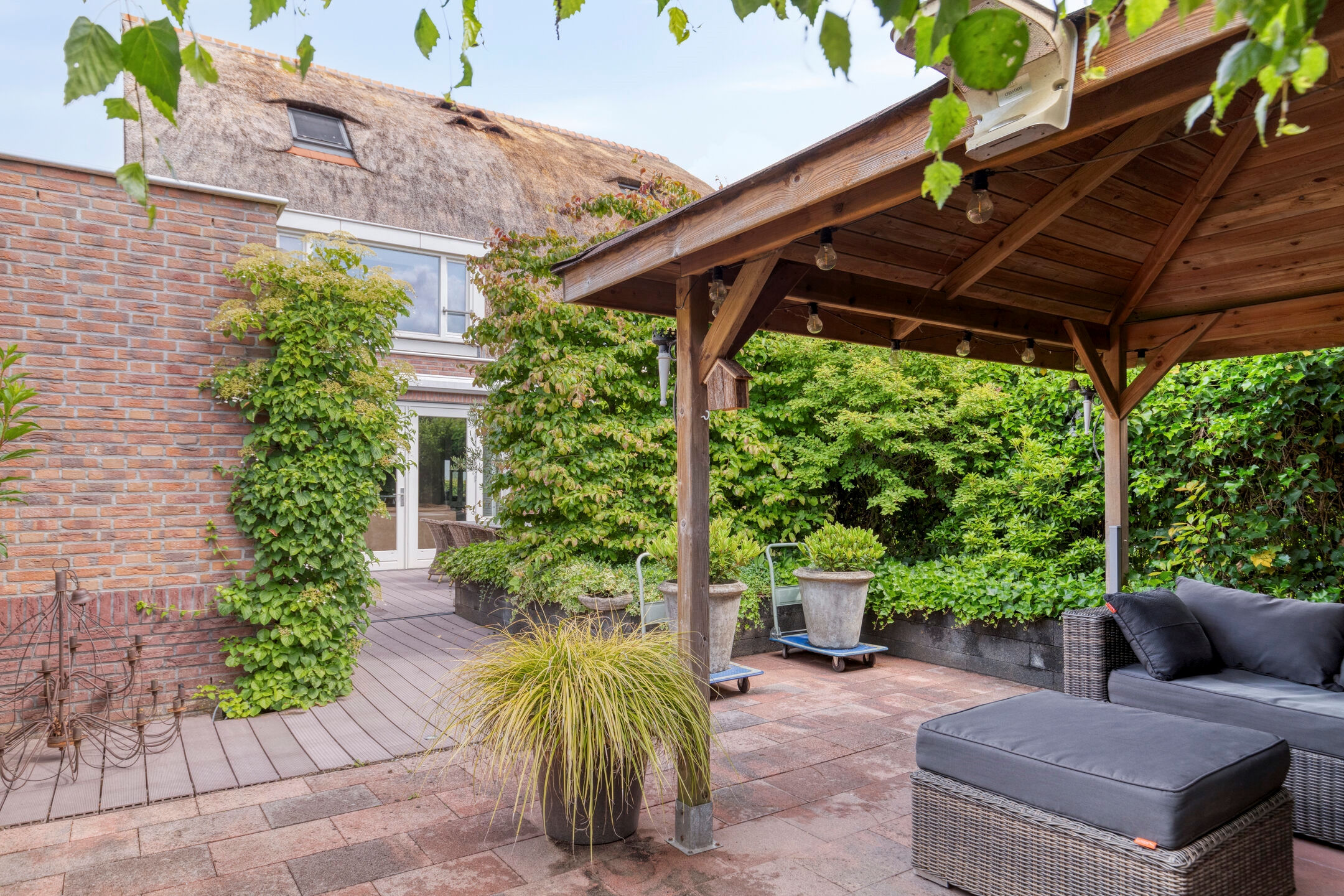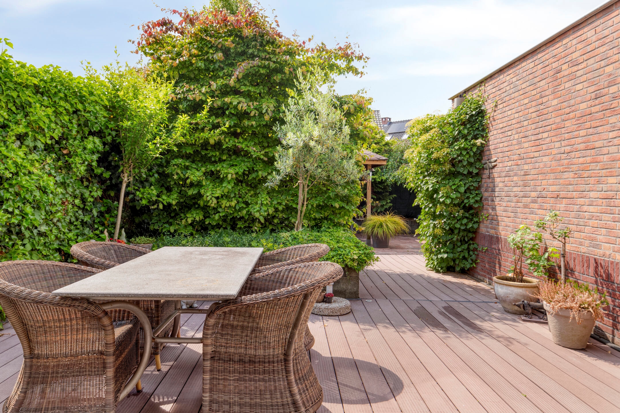 De diepe en zonnige achtertuin is gelegen op het zuiden en voorzien van sierbestrating, vlonder, grind, vaste planten en een fraaie overkapping omringd met een verhoogde border.