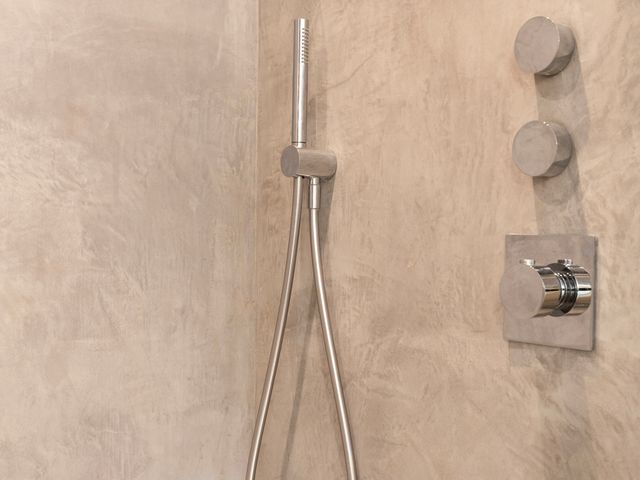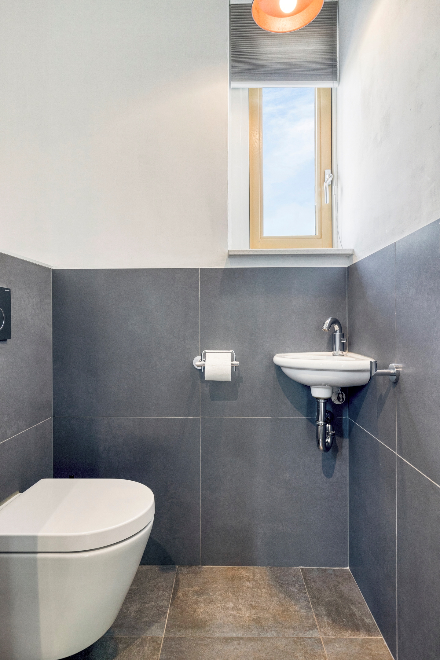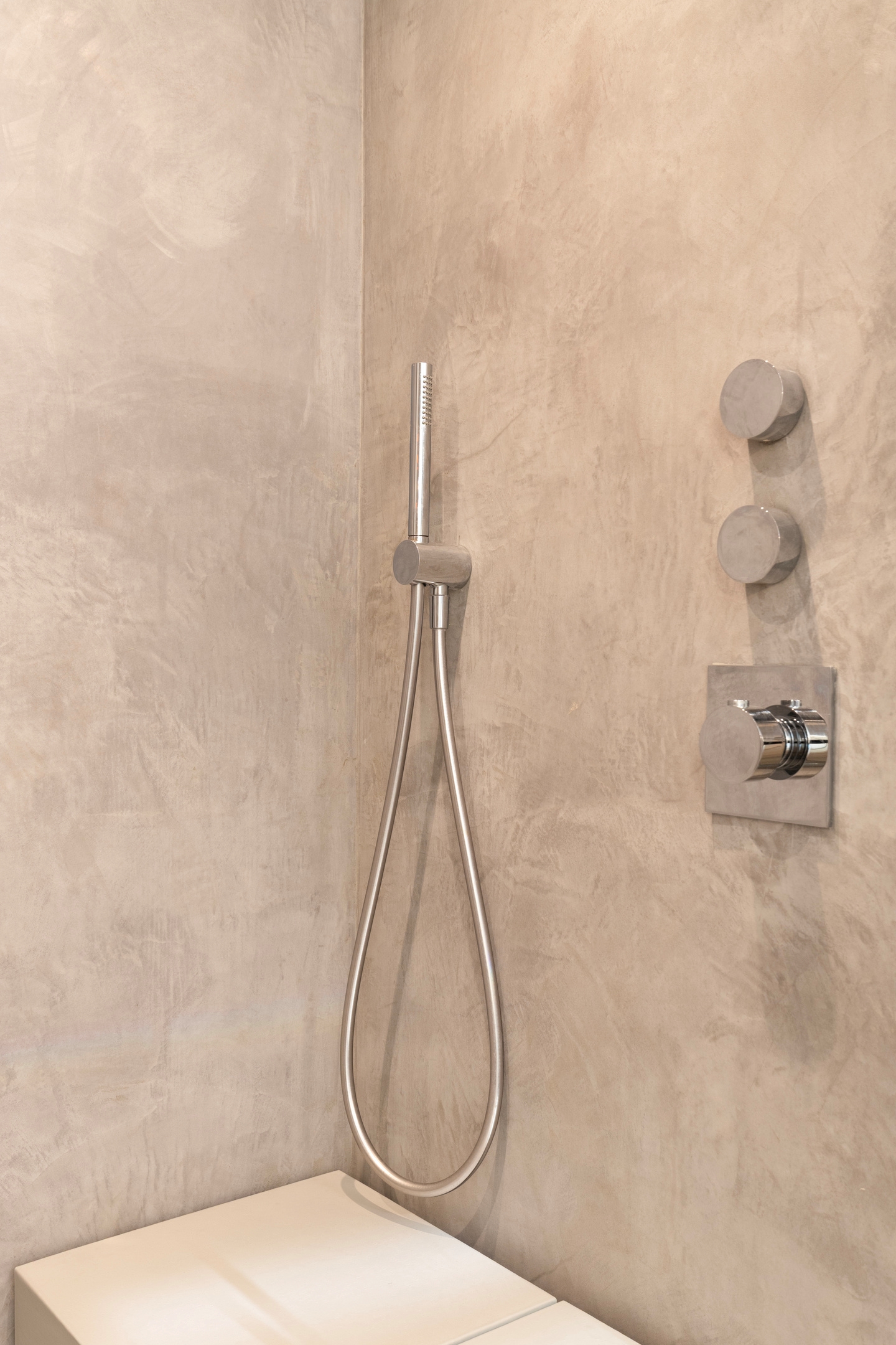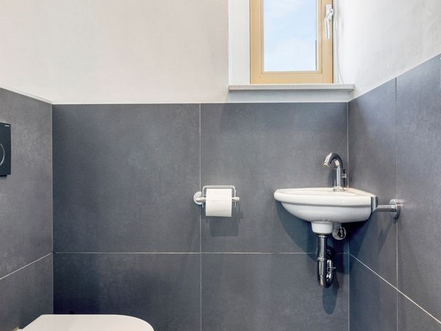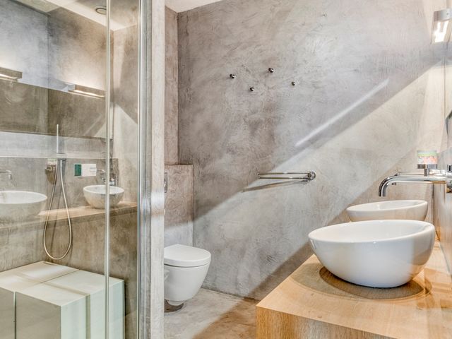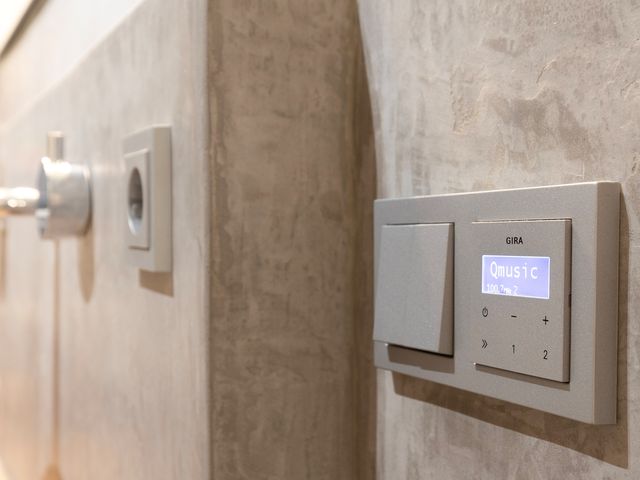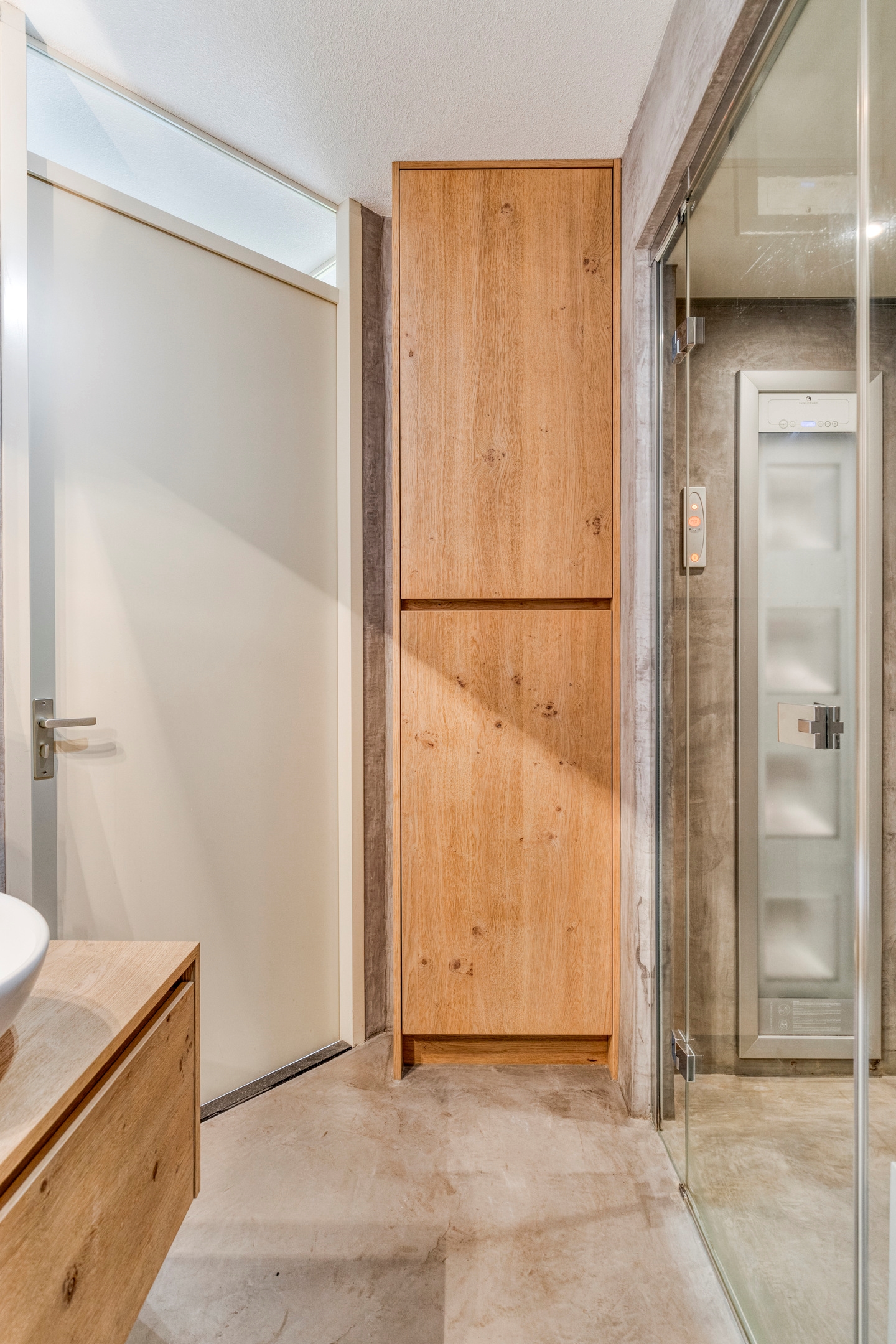 De vloer is afgewerkt met een tegelvloer in aardetinten en vloerverwarming. De wanden zijn voorzien van spachtelputz.