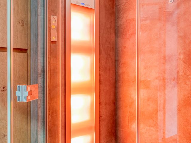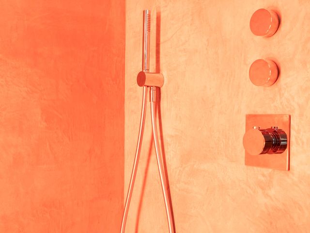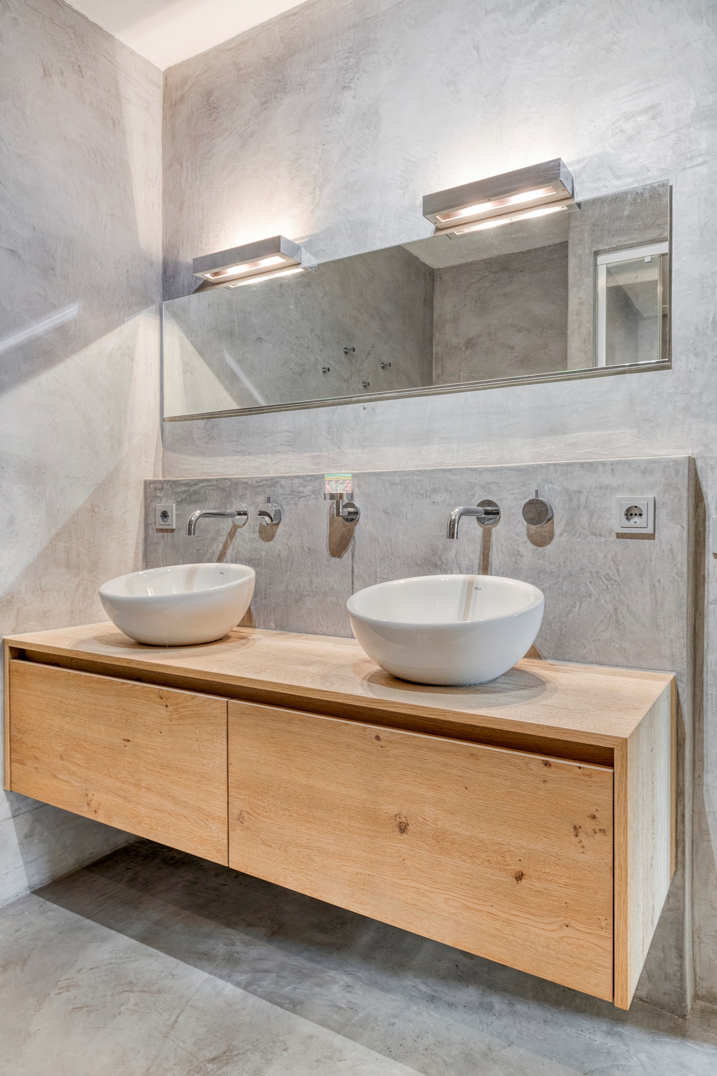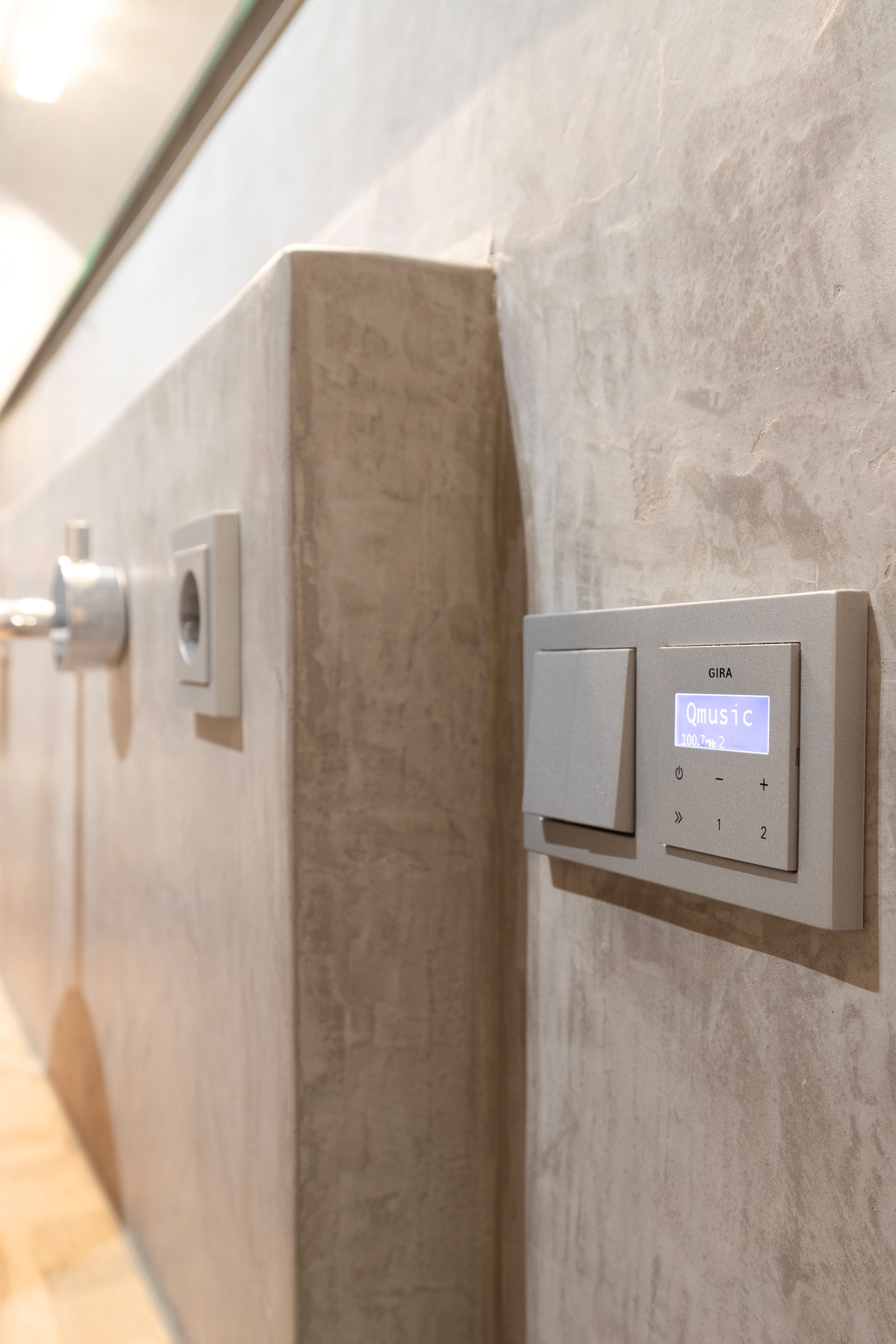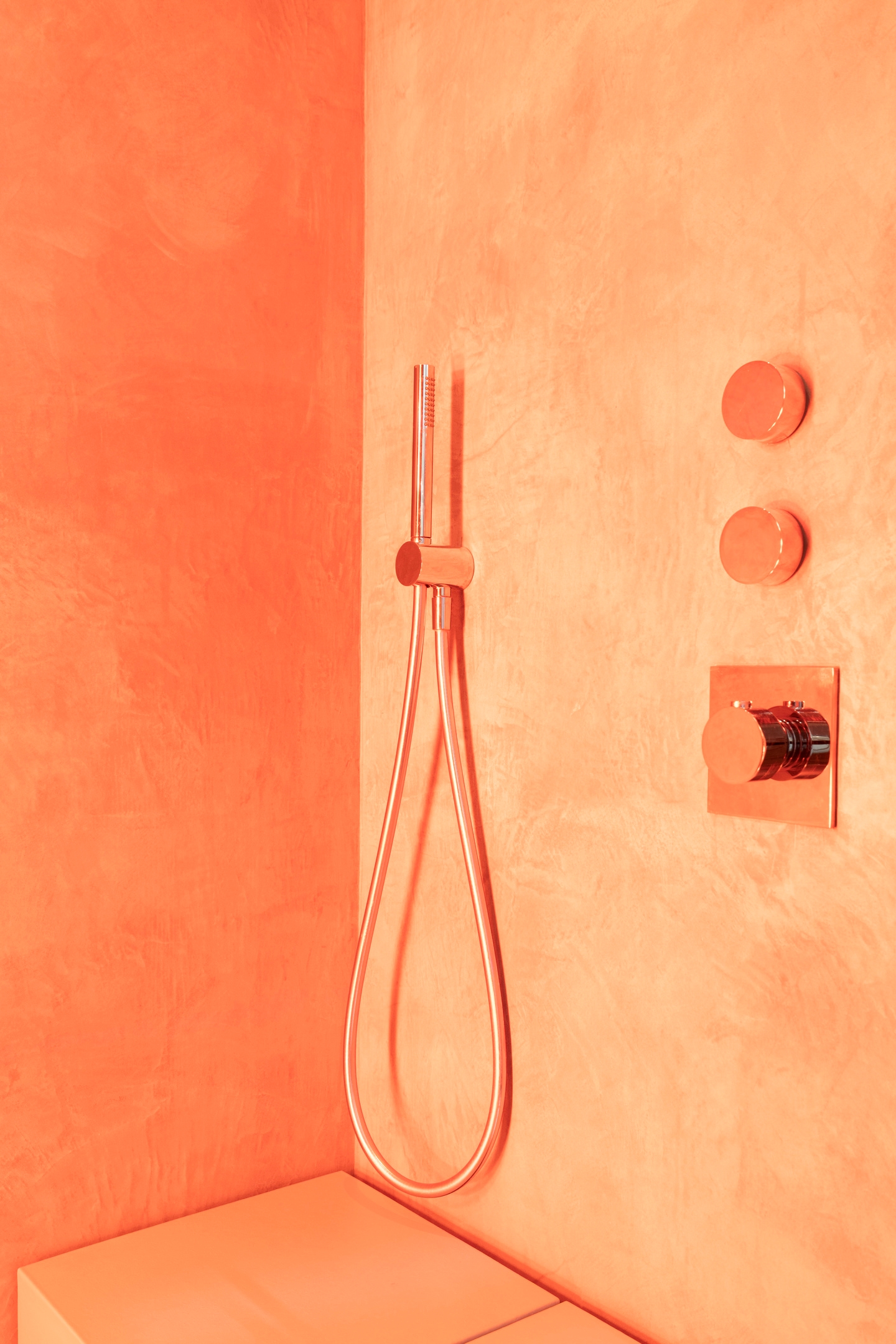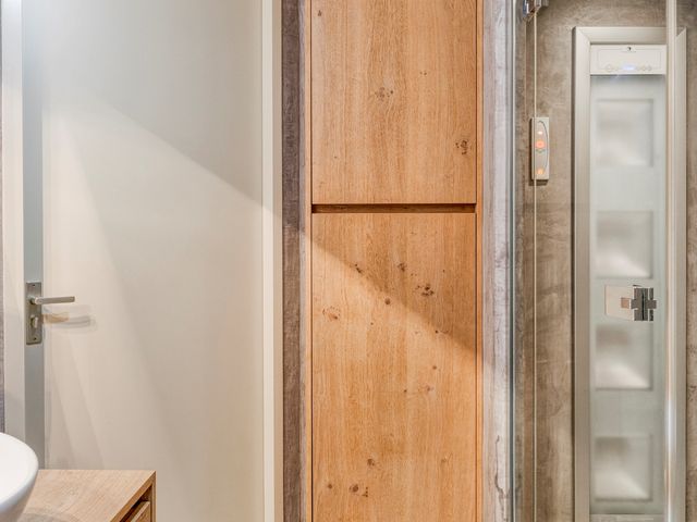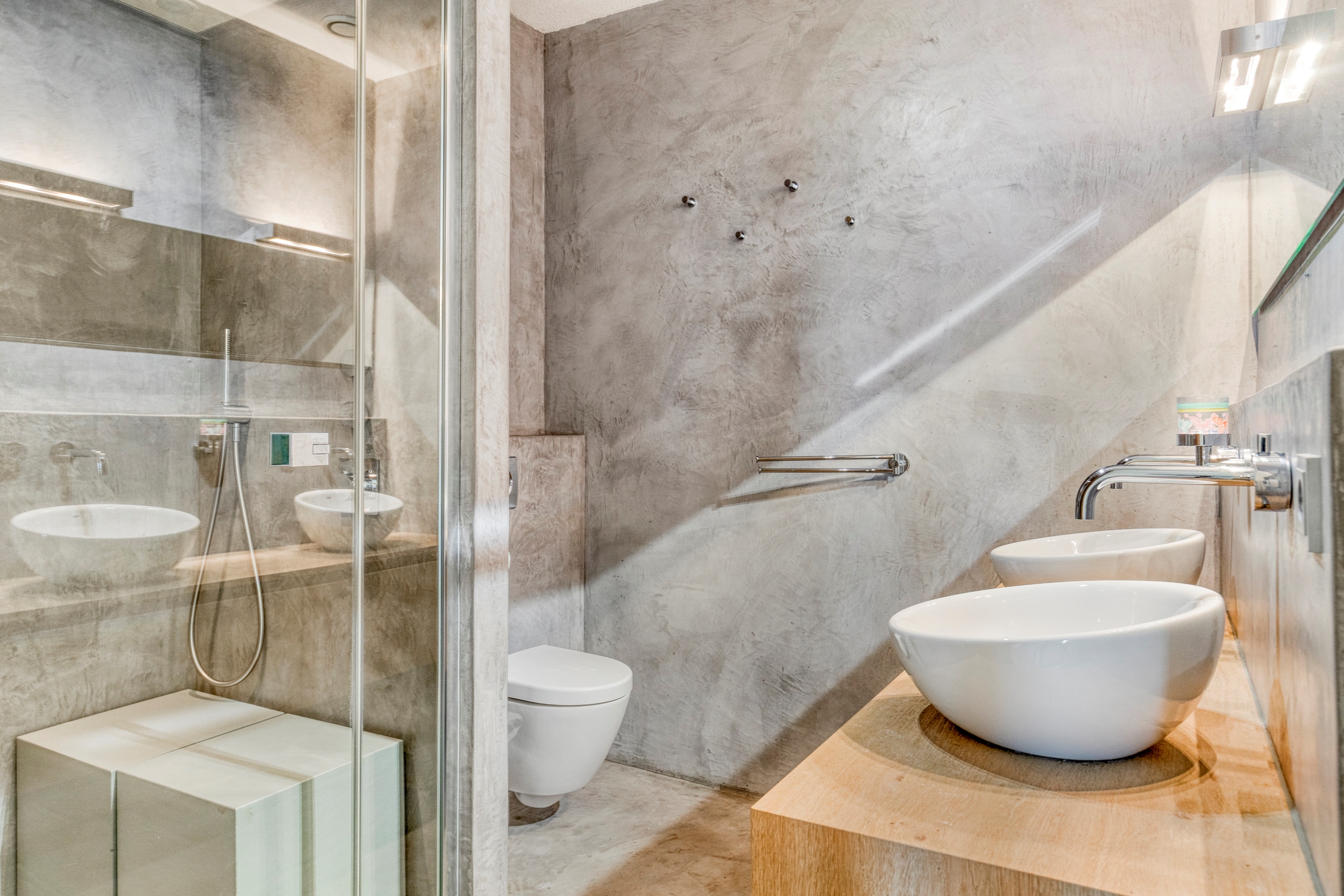 De vloer is afgewerkt met een tegelvloer in aardetinten en vloerverwarming. De wanden zijn voorzien van spachtelputz.
