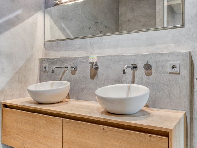 De nette badkamer geeft direct een vakantiegevoel met dubbele wastafelkommen op een wastafelmeubel, een ingebouwd muzieksysteem en douchecabine met thermostaatkraan en sunshower met stoomfunctie.