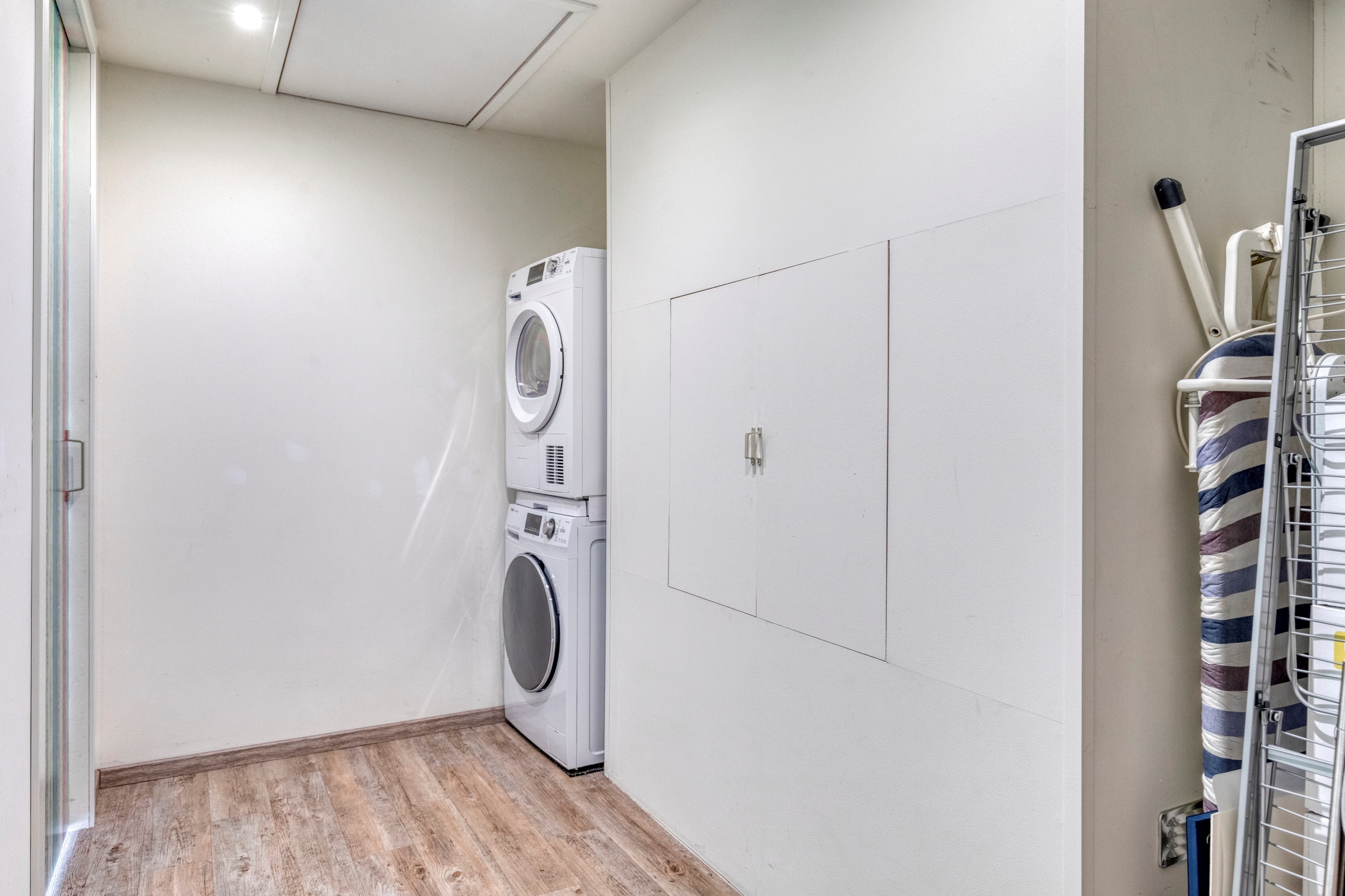 In een vaste berging is de opstelplaats van de warmte terugwin installatie en beschikt over een wasmachine-/drogeraansluiting.