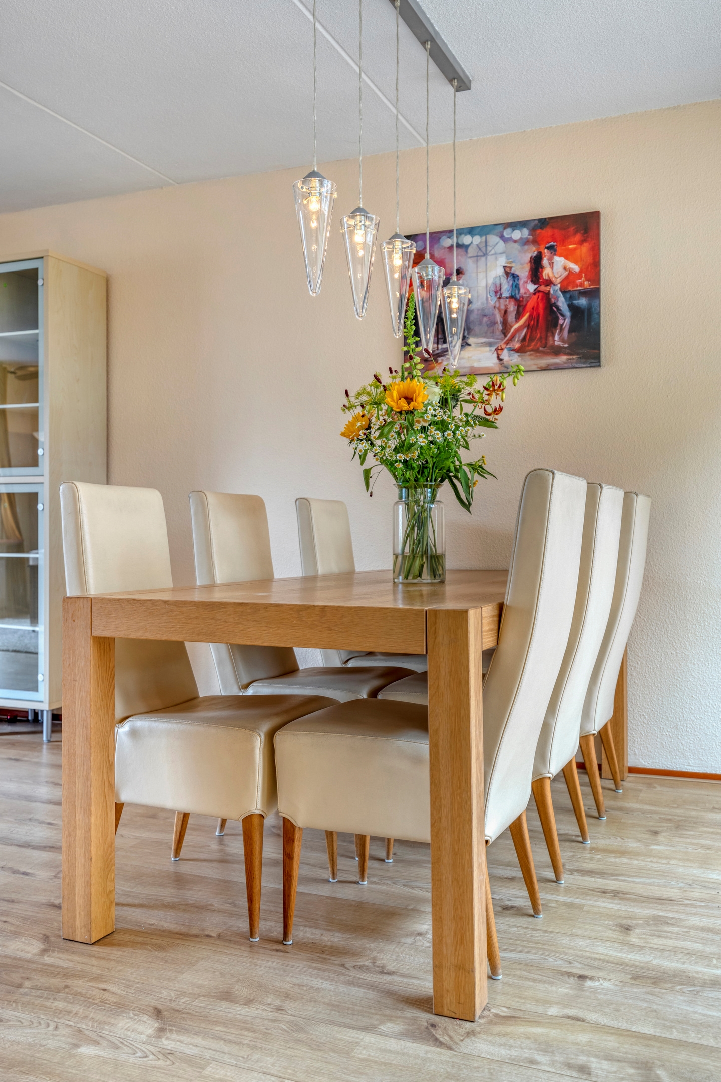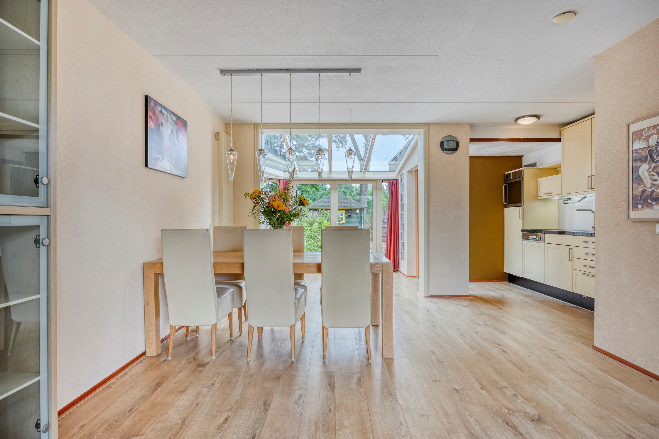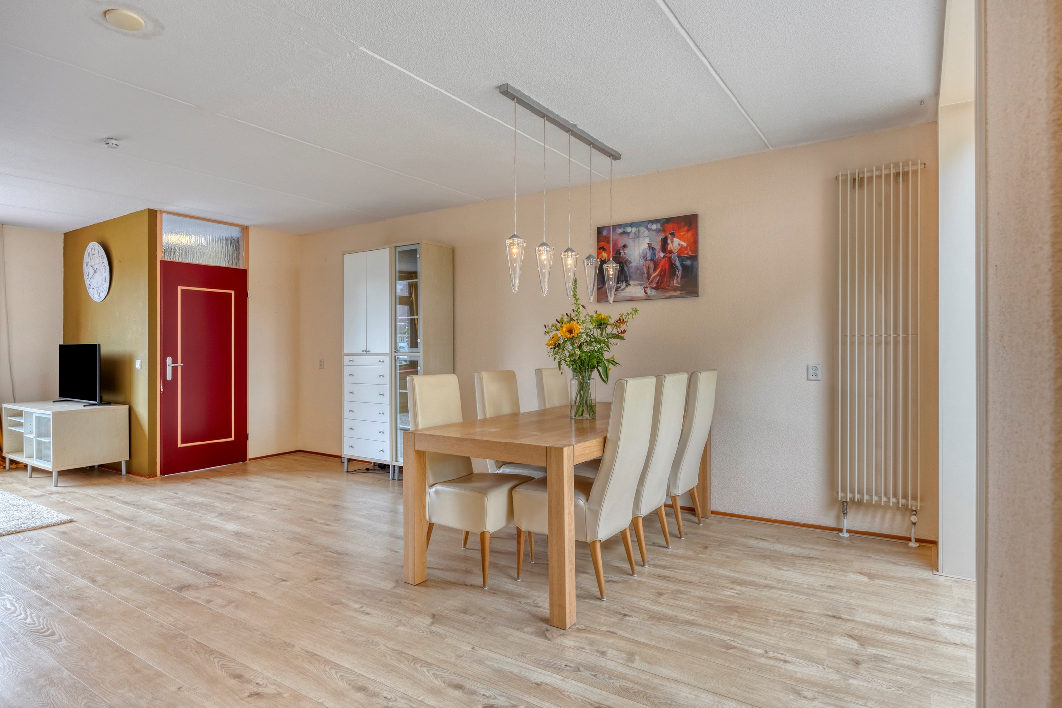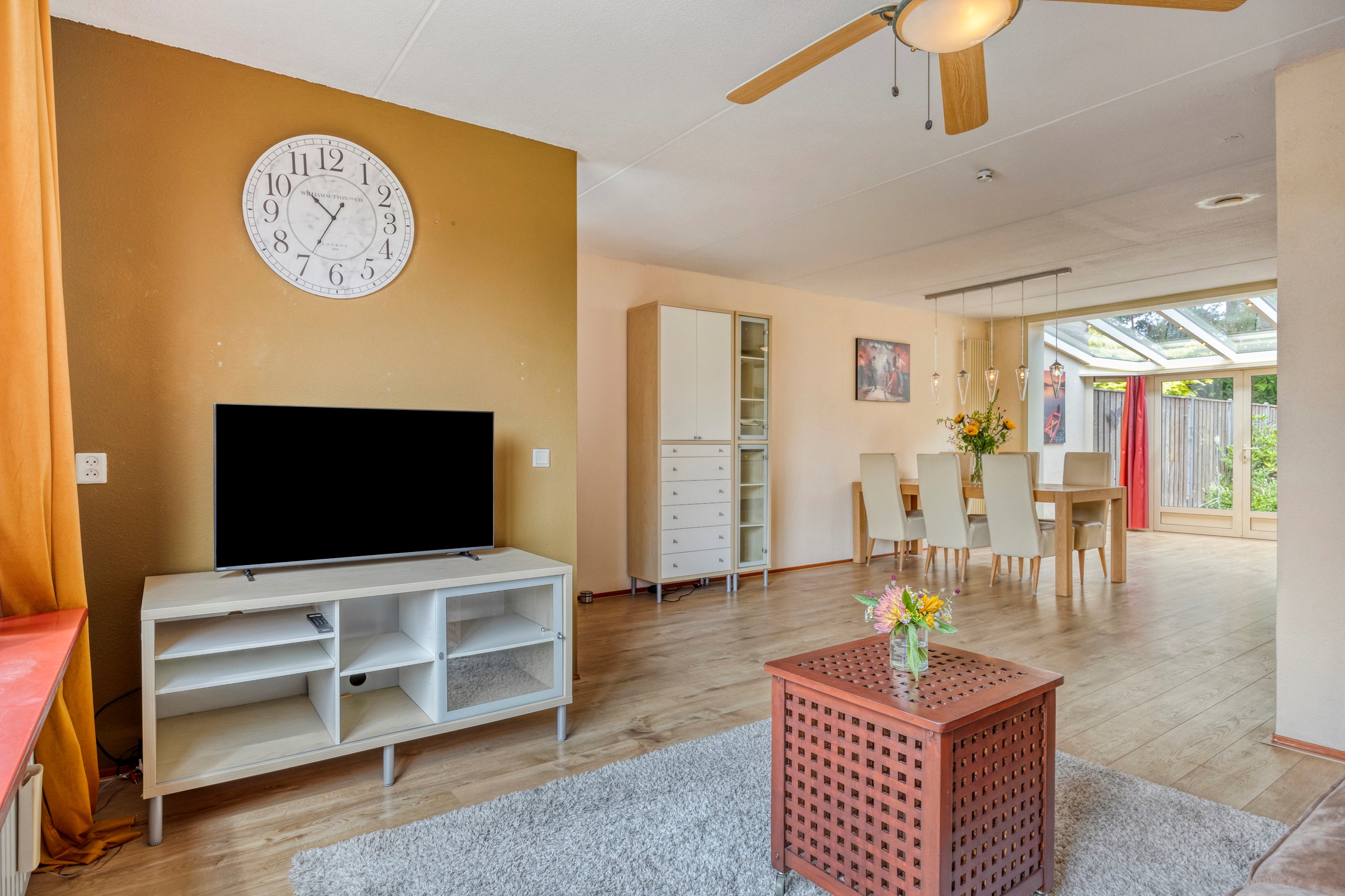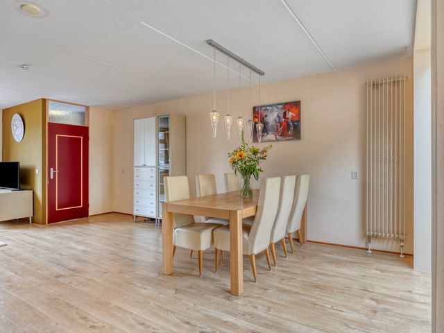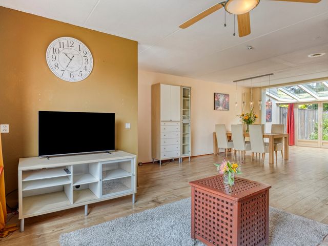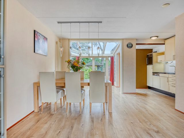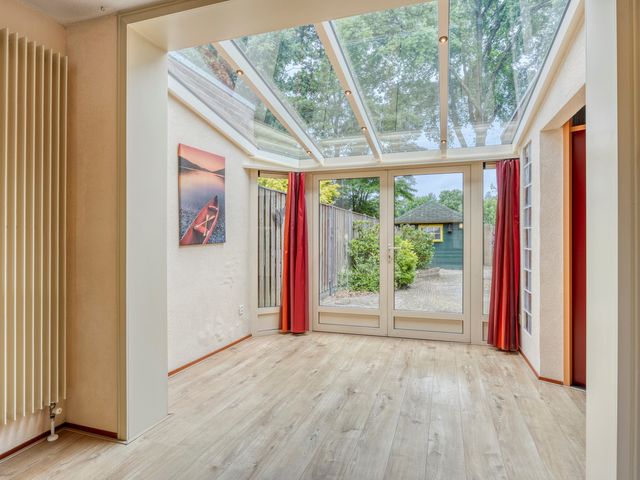 Bij binnenkomst in de woonkamer valt meteen de ruime raampartij en de serre op. Het natuurlijk binnenvallende licht geeft de kamer een aangename sfeer en biedt een prachtig uitzicht op de achtertuin. De wanden zijn van granol en de vloer is voorzien van laminaat.