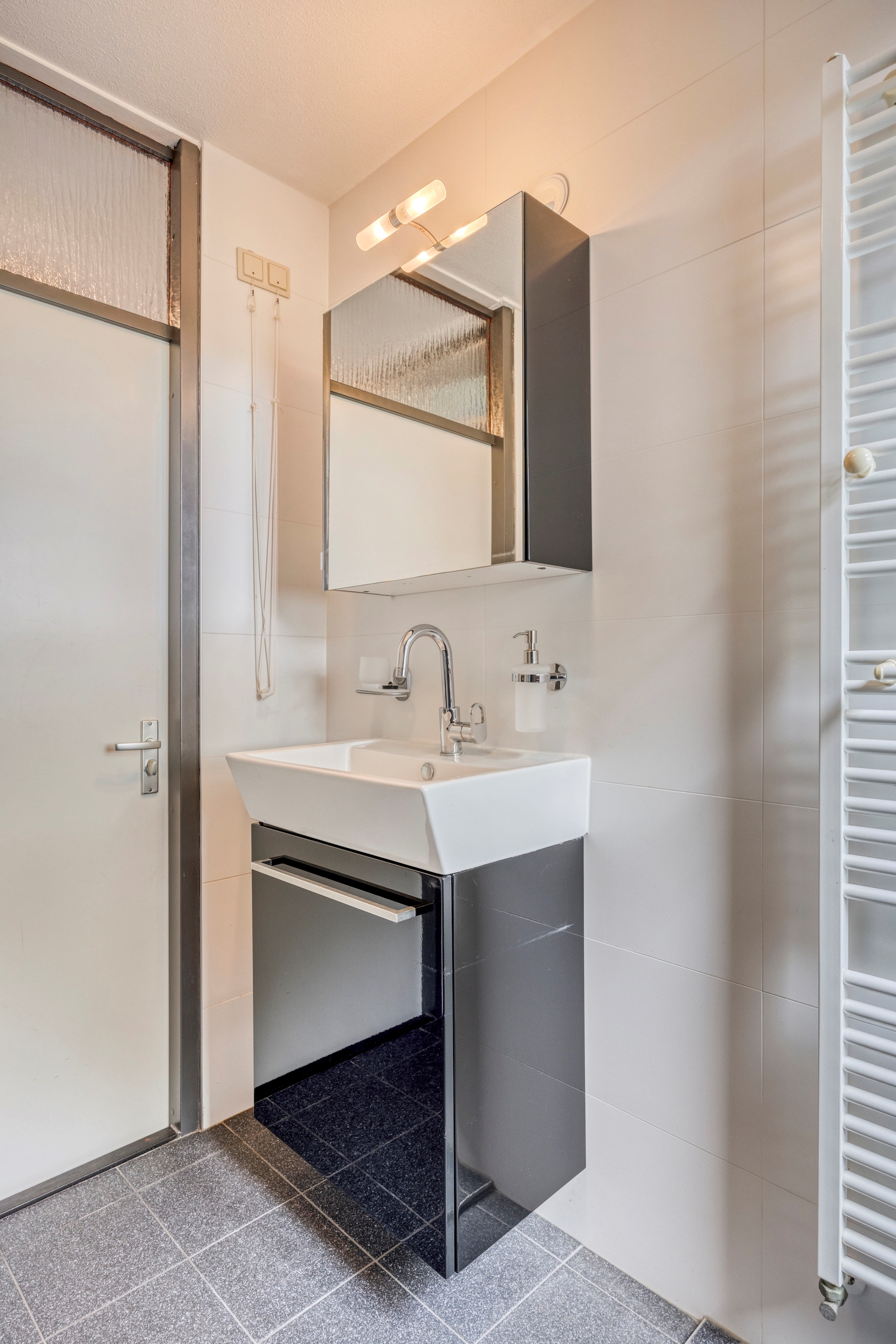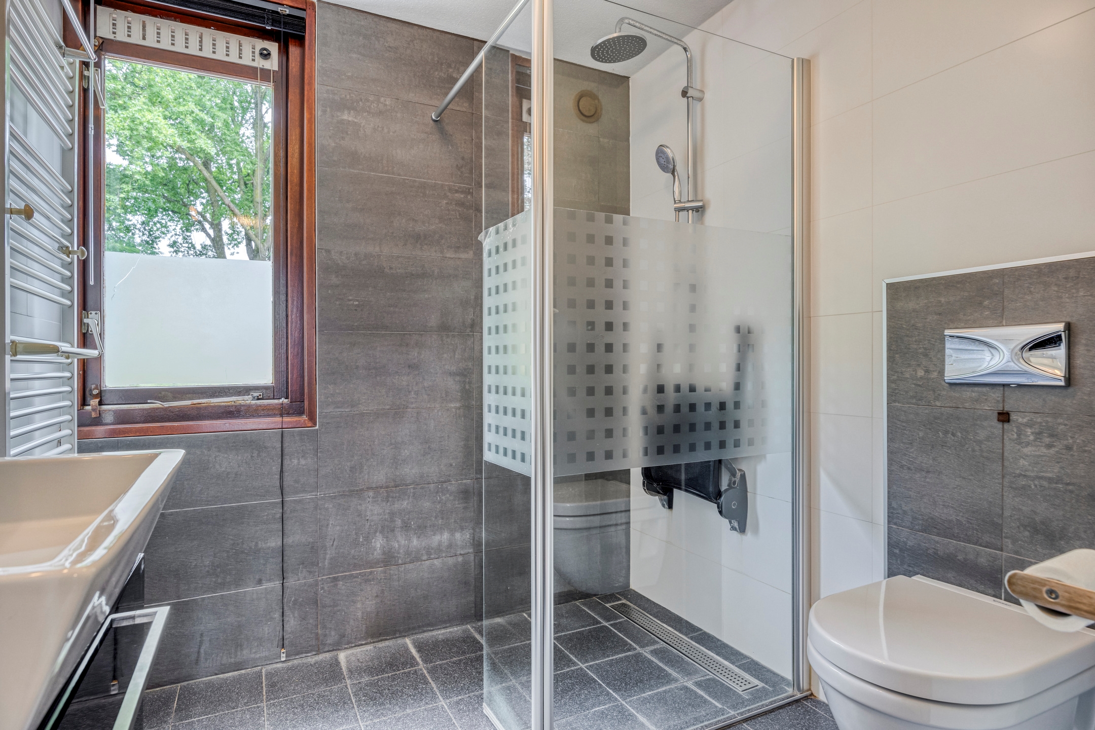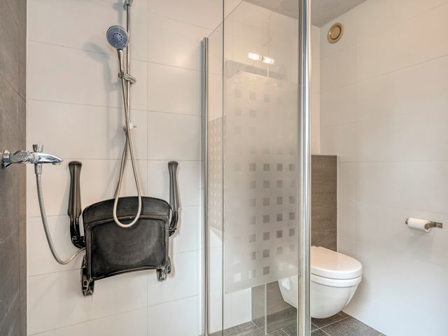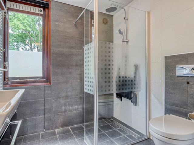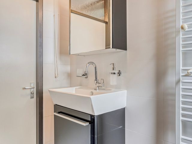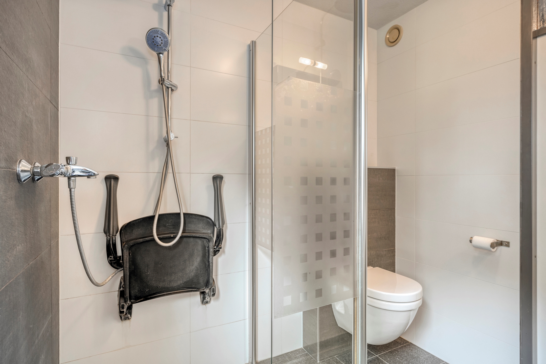 De badkamer is geheel betegeld. Hier vindt u een inloopdouche met thermostaatkraan, een wastafelmeubel en een toilet.