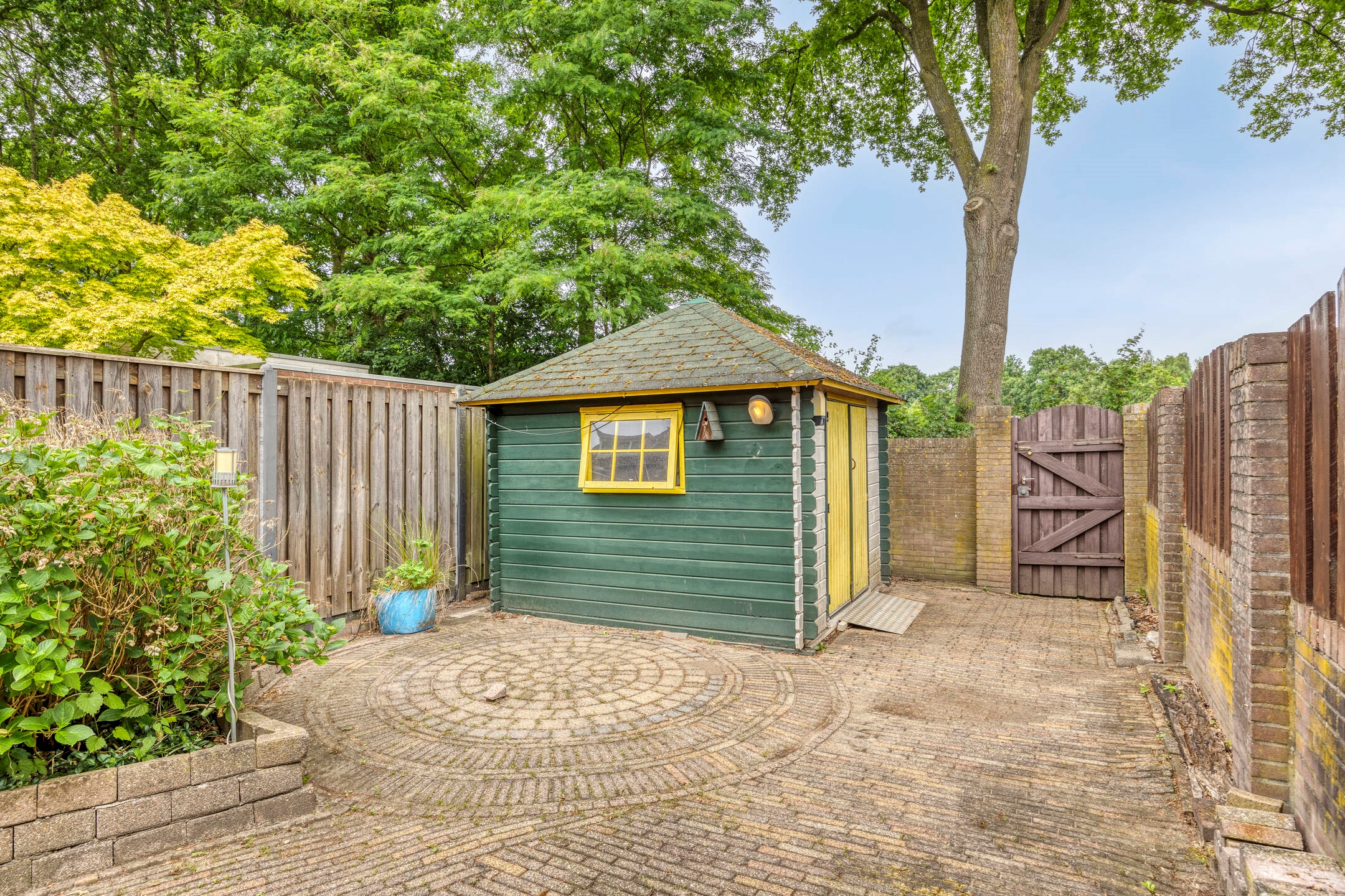 In de zonnige, onderhoudsvriendelijke achtertuin met een houten berging is het heerlijk genieten.