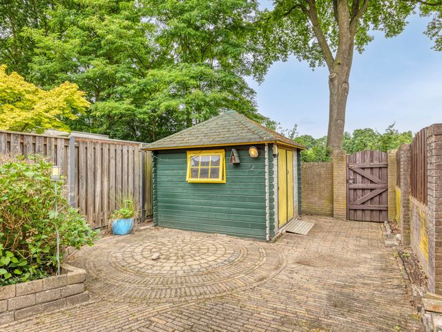 De tuin ligt op het noorden en beschikt over een houten berging dat is voorzien van elektriciteit. Bovendien is er aan de achterzijde van de tuin een eigen achterom toegankelijk via een poort.