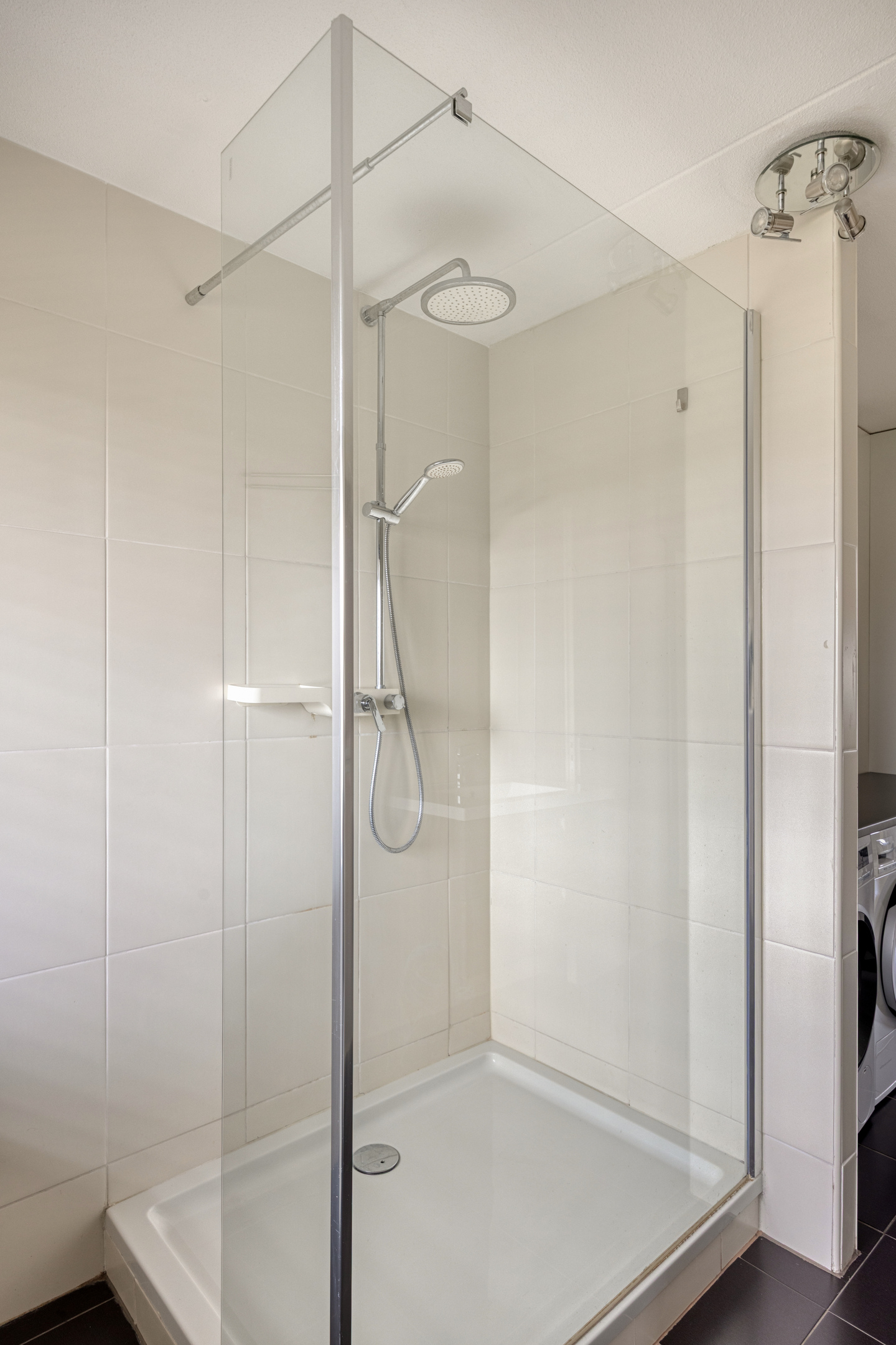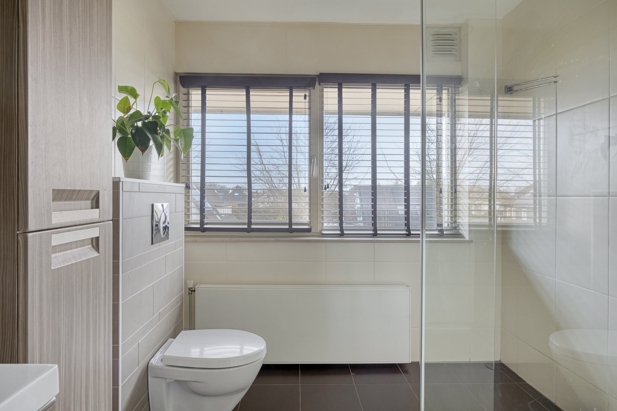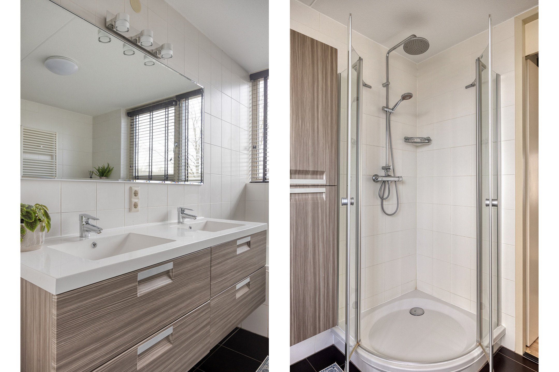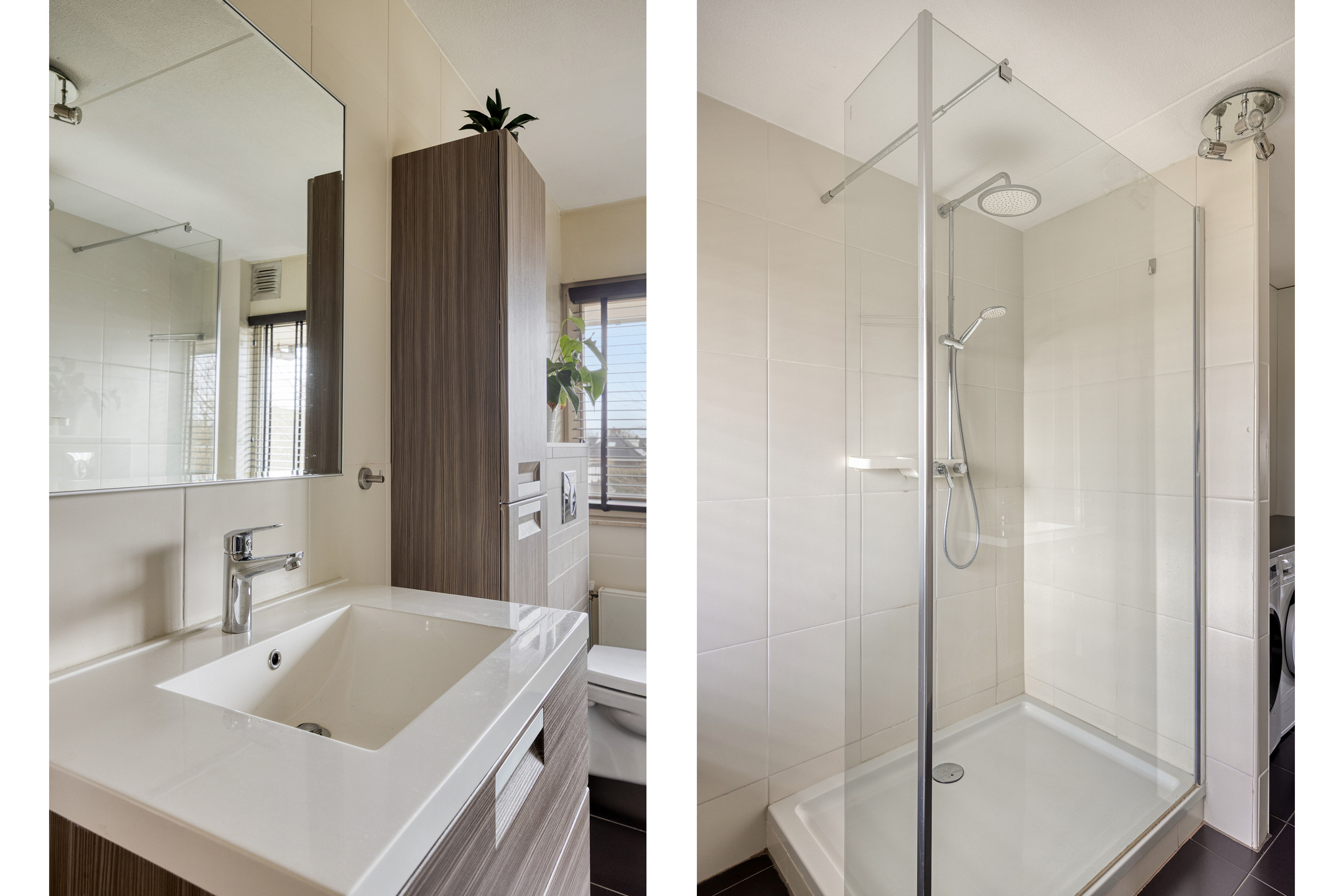 Een overloop met een trapopgang naar de derde verdieping, heeft 2 ruime slaapkamers en badkamer 2. Badkamer 2, heeft ook een grootvoorgevelraam, mechanische ventilatie, is uitgerust met o.a. een wastafelmeubel, een handige inloopdouche met gehard glas, een vrijhangend toilet en aansluitingen voor de wasmachine en droger.