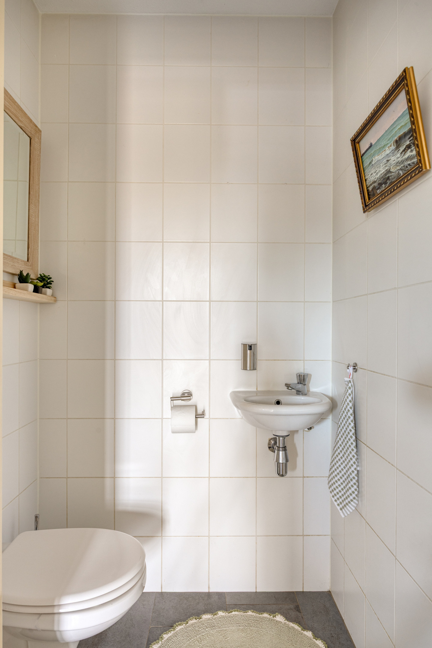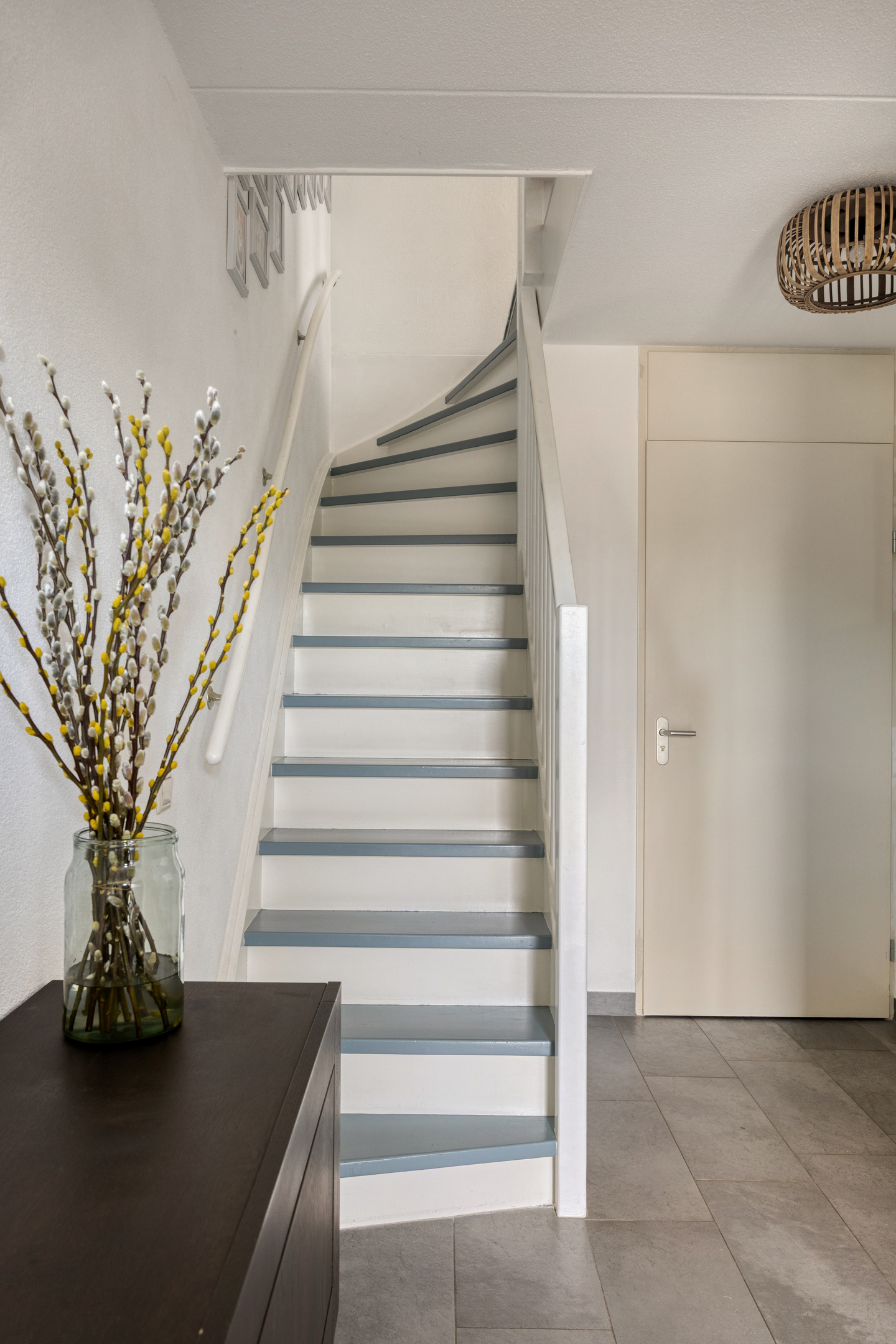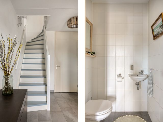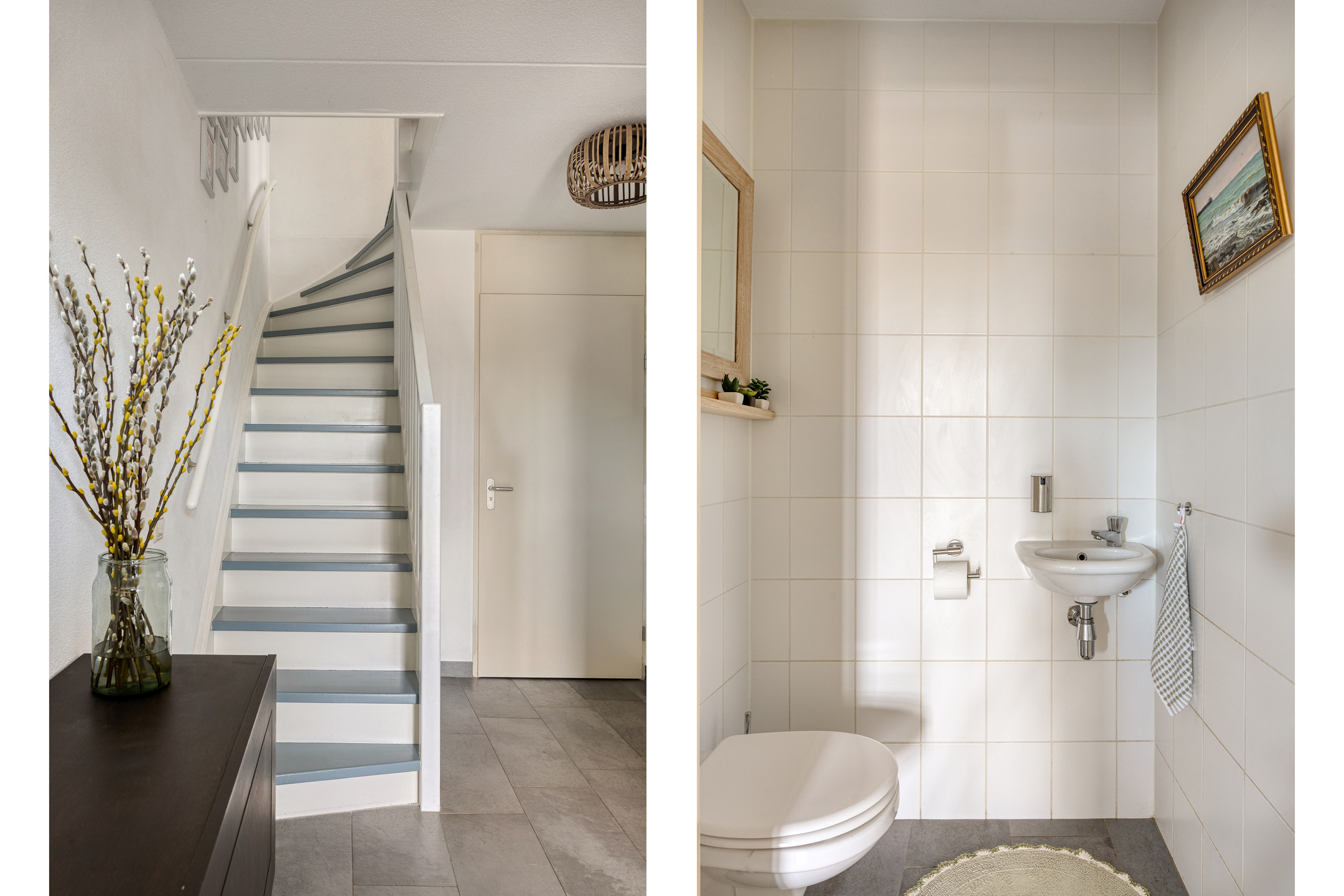 Een ruime entree/hal met een praktische 2 deurskastenwand, een moderne meterkast en een trapopgang naar de 1e verdieping. Via de hal zijn het vrijhangend toilet met een fonteintje en de aantrekkelijke open inbouwkeuken te bereiken.
