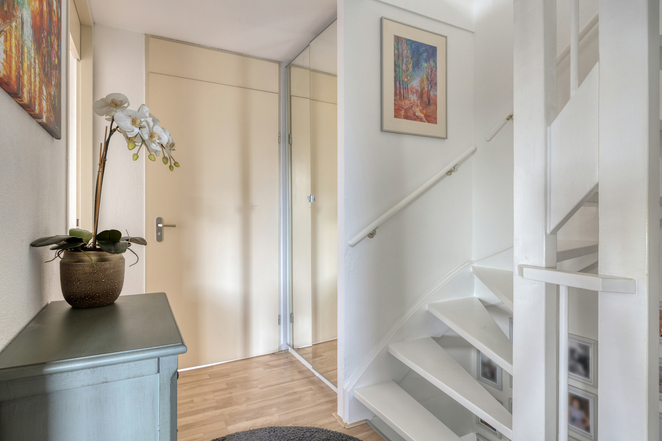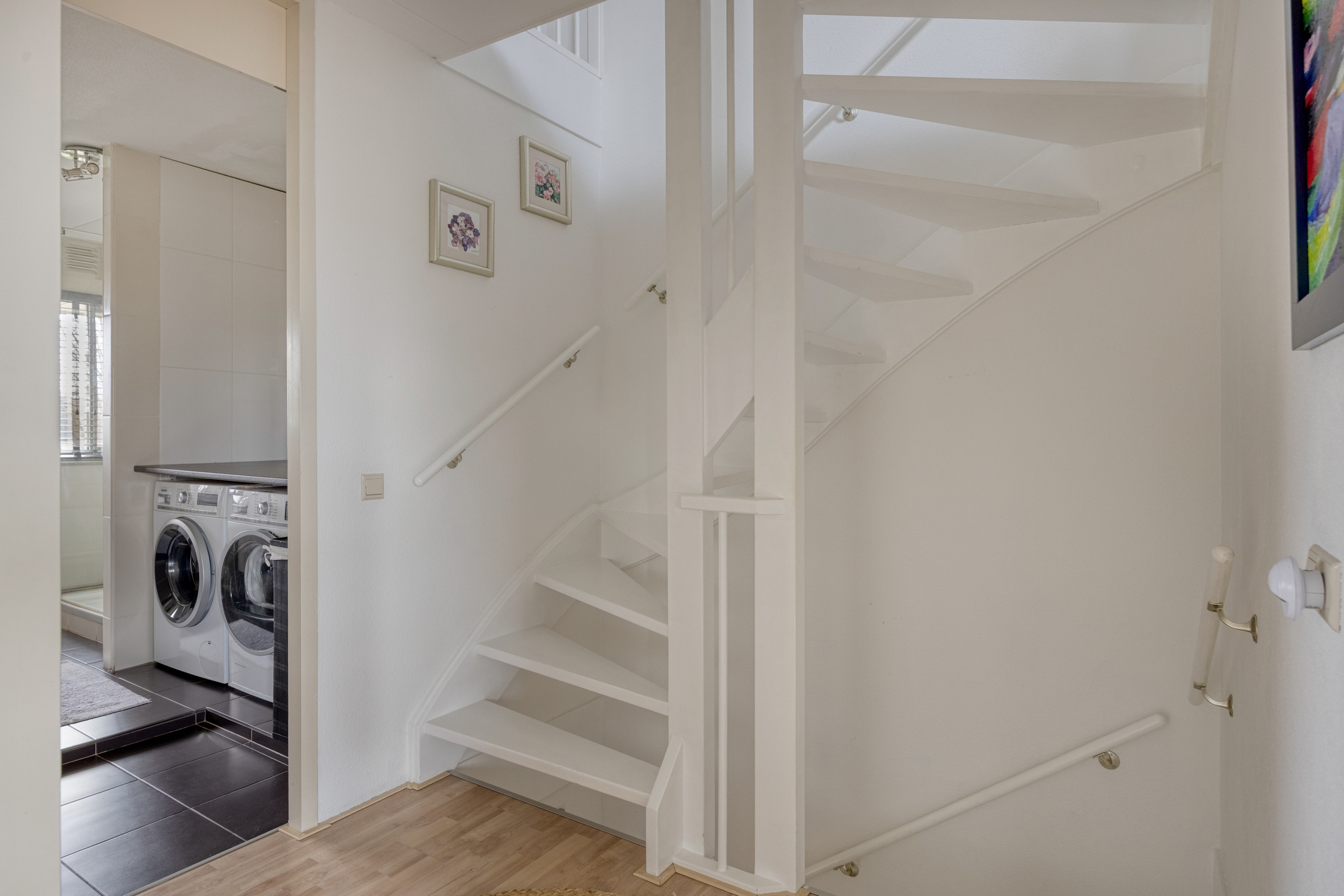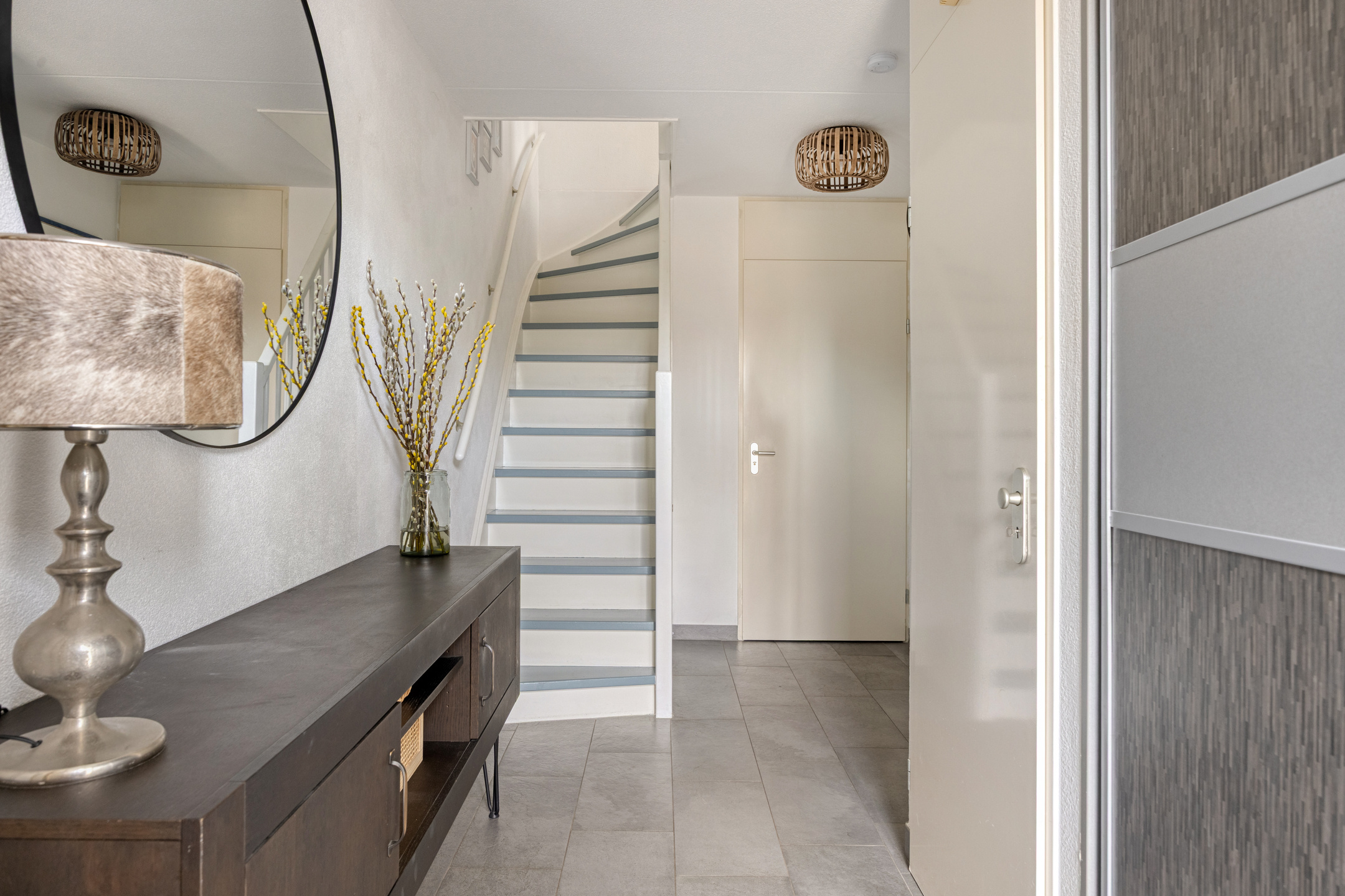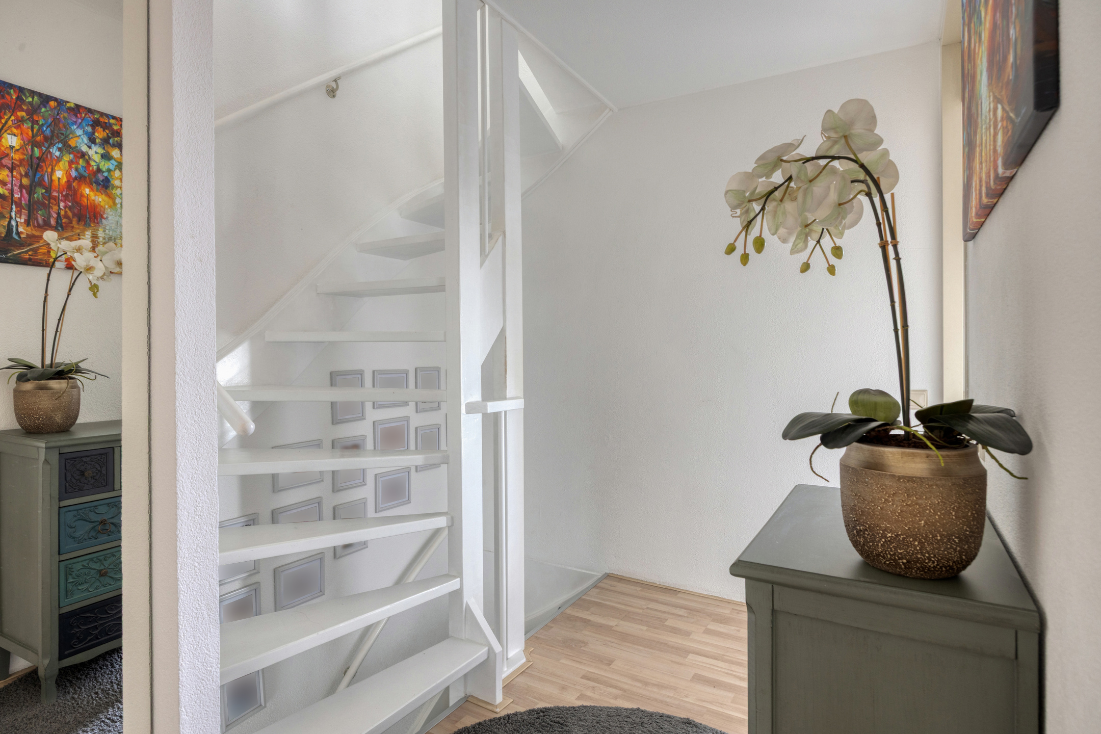 Een ruime entree/hal met een praktische 2 deurskastenwand, een moderne meterkast en een trapopgang naar de 1e verdieping. Via de hal zijn het vrijhangend toilet met een fonteintje en de aantrekkelijke open inbouwkeuken te bereiken.
