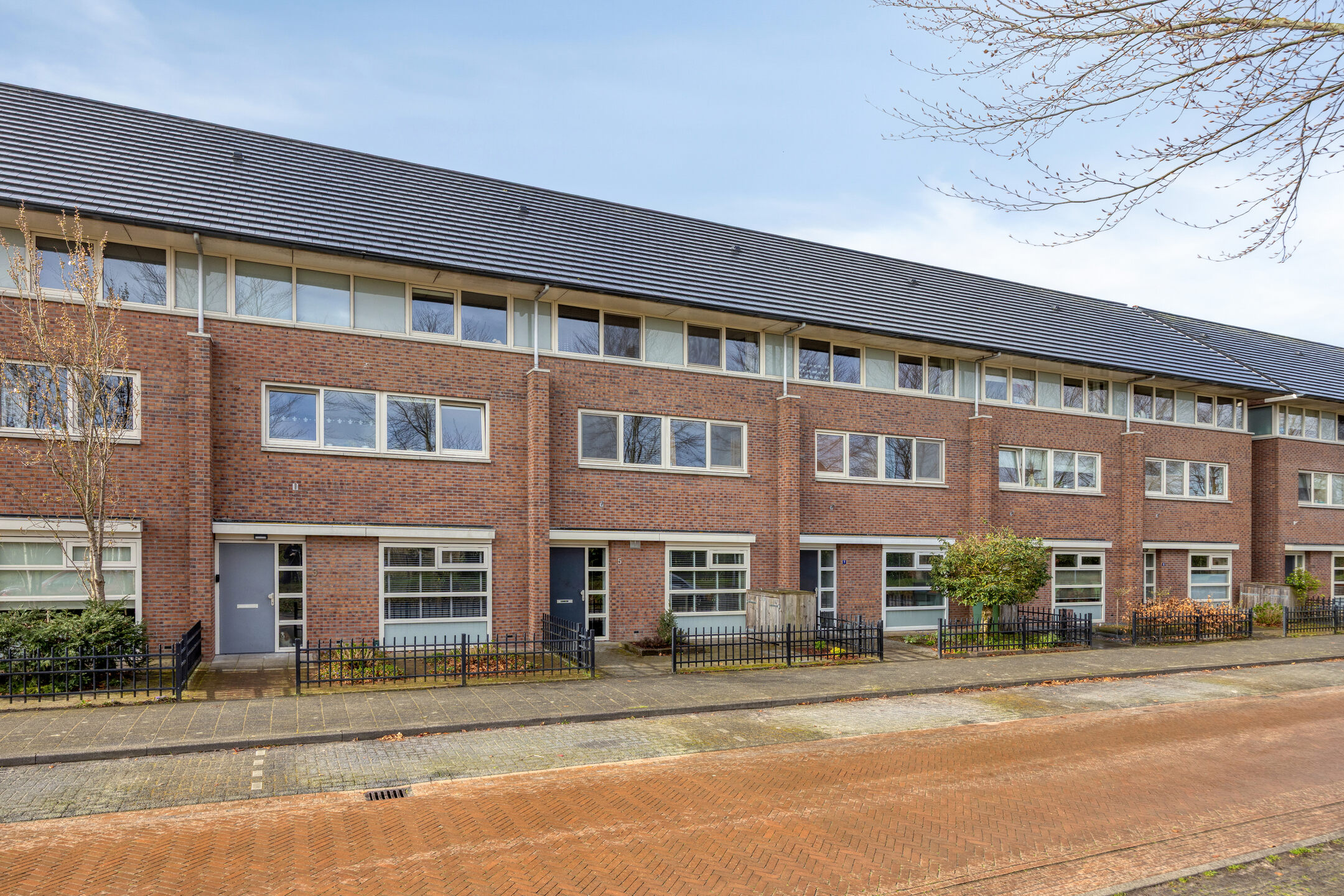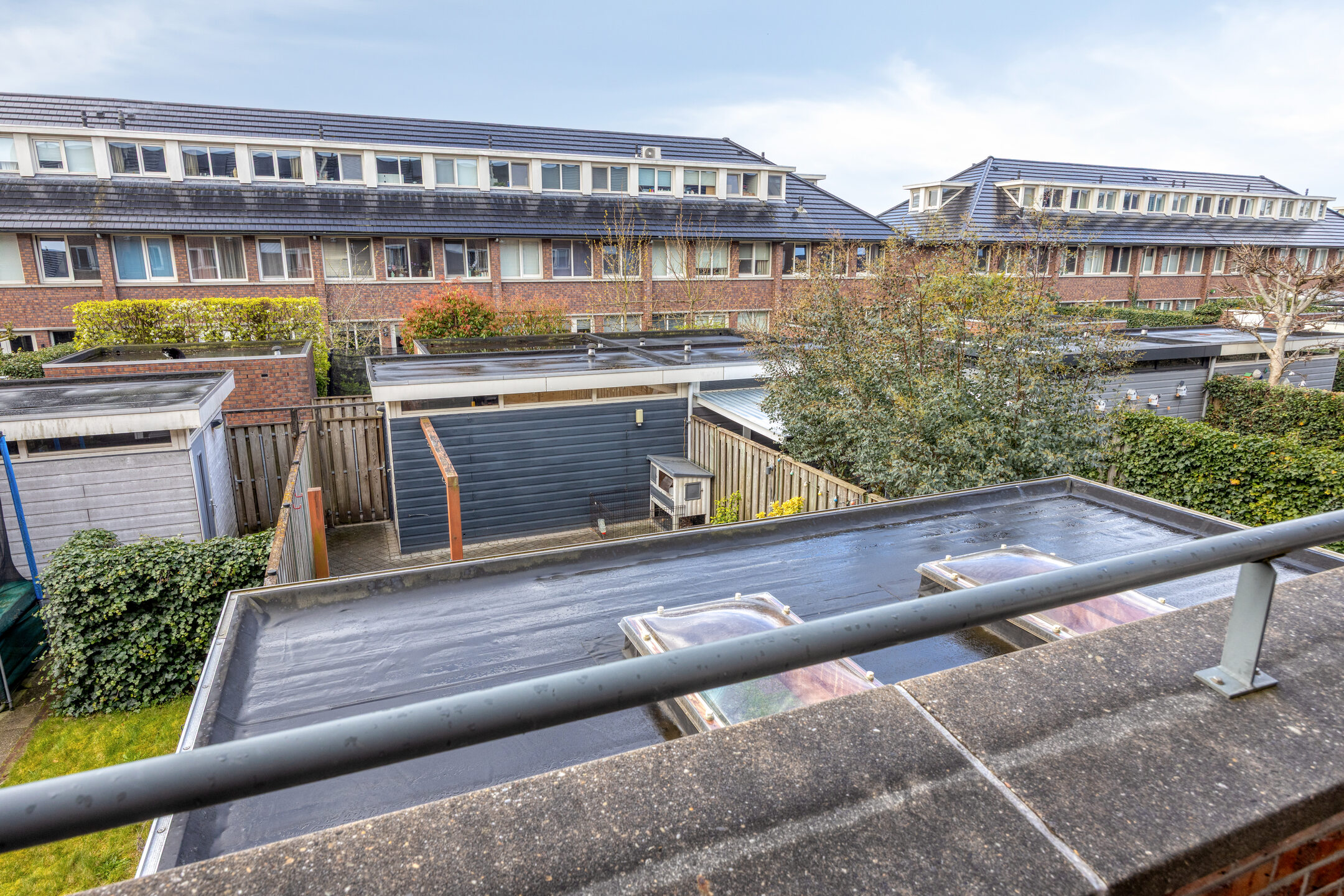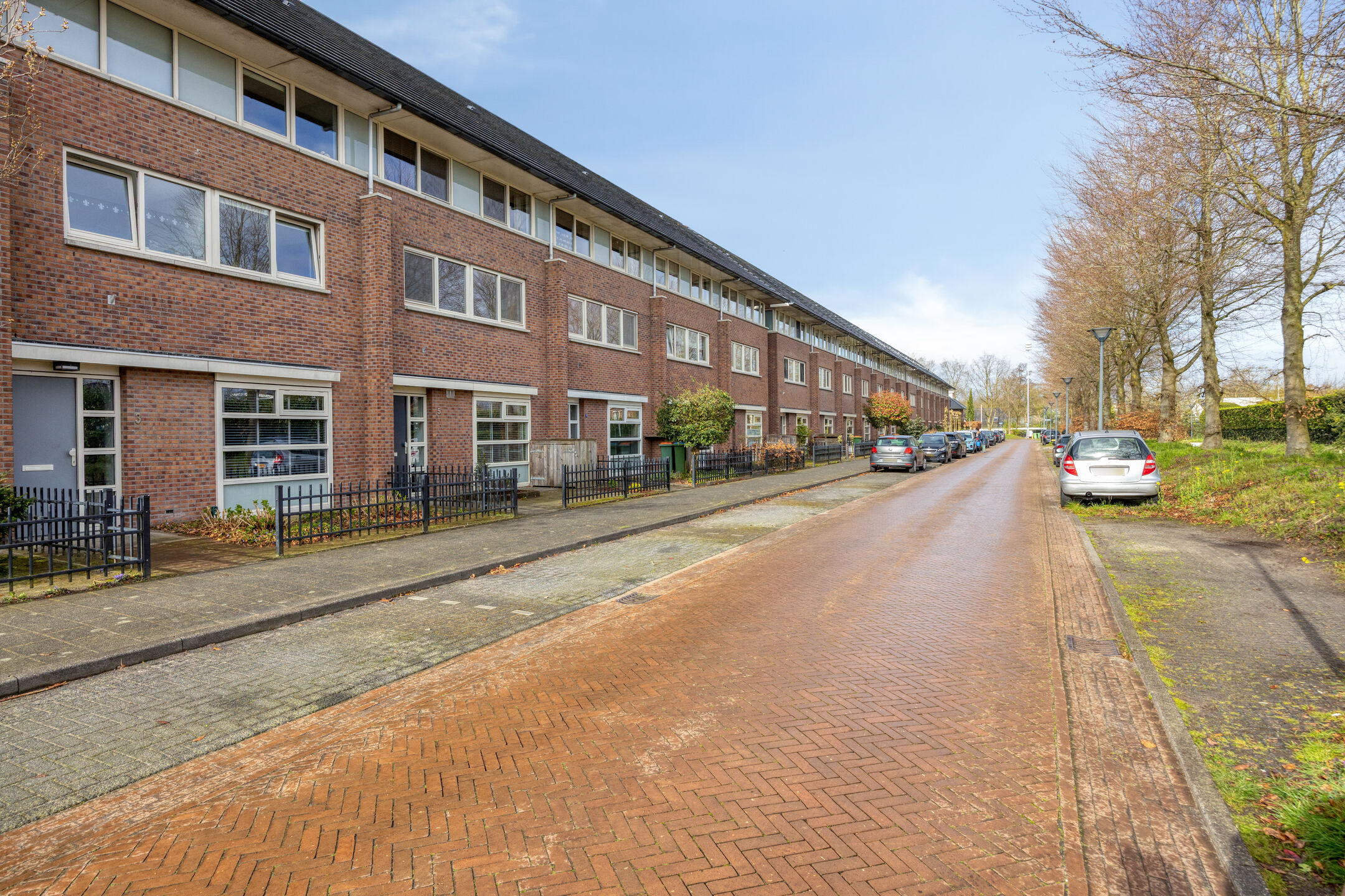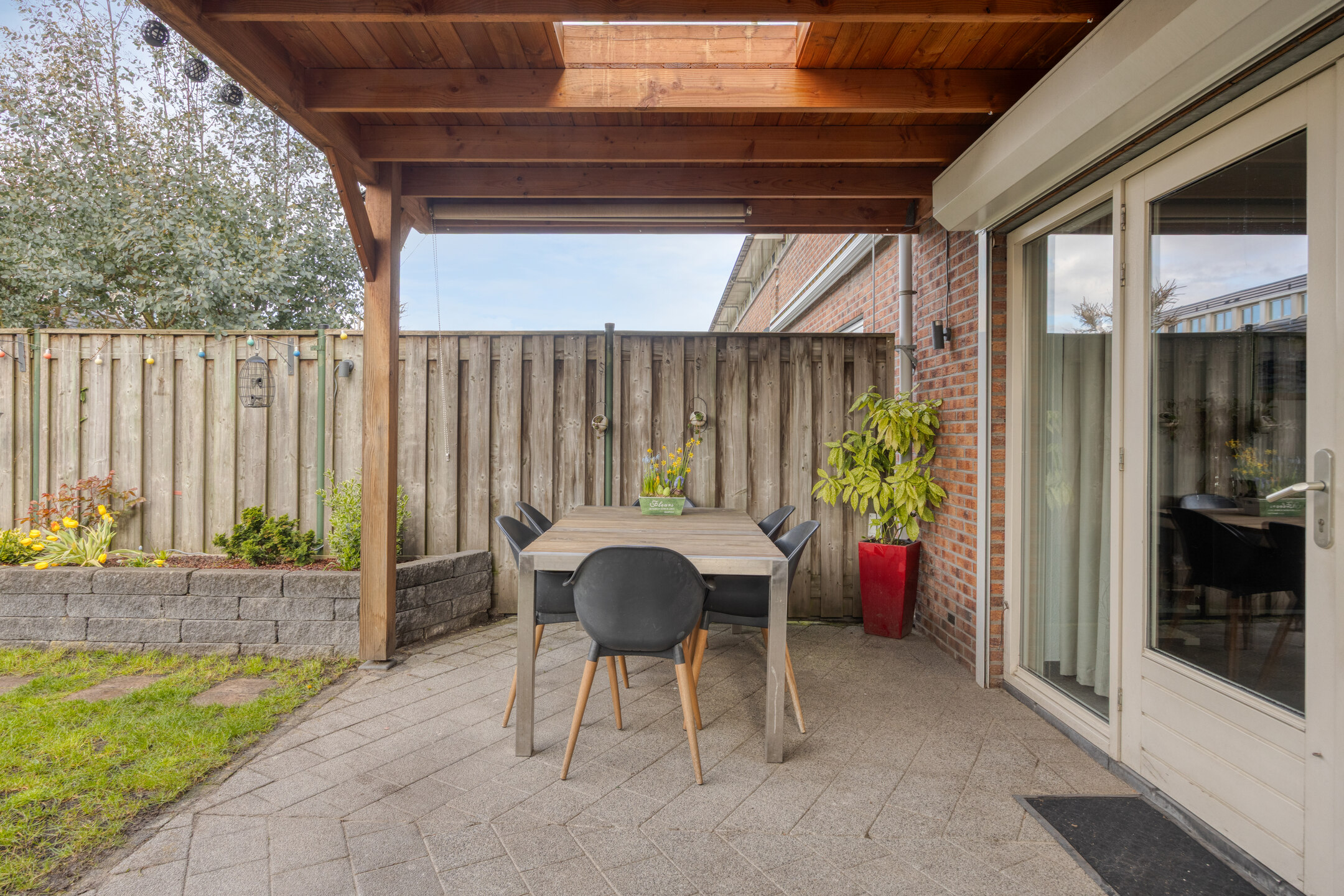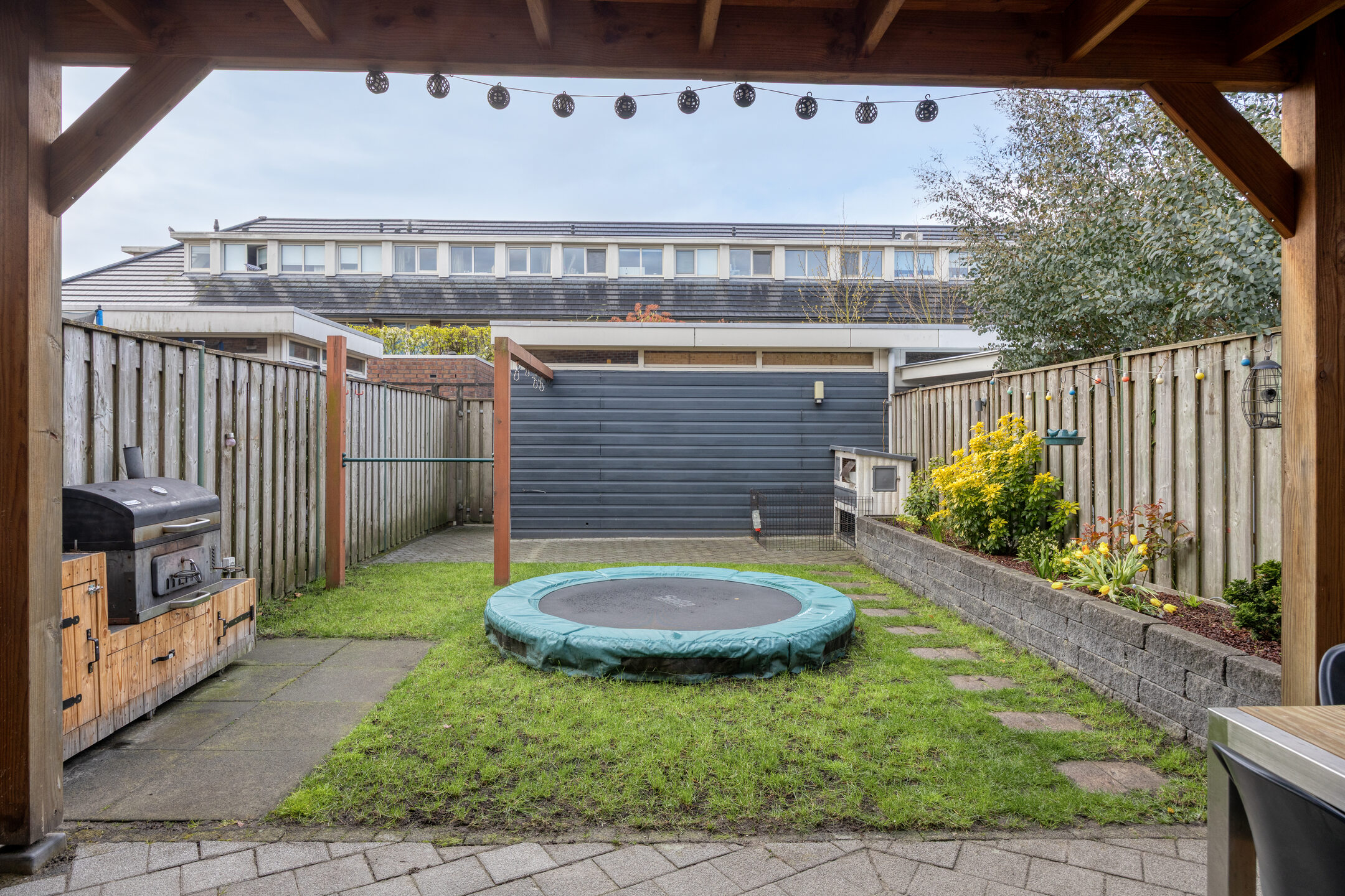 Omdat de woning aan het einde van de brandgang staat, staat de berging dieper in de tuin van de naburige percelen. De tuin is ingericht met een gazon, terrassen en borders.