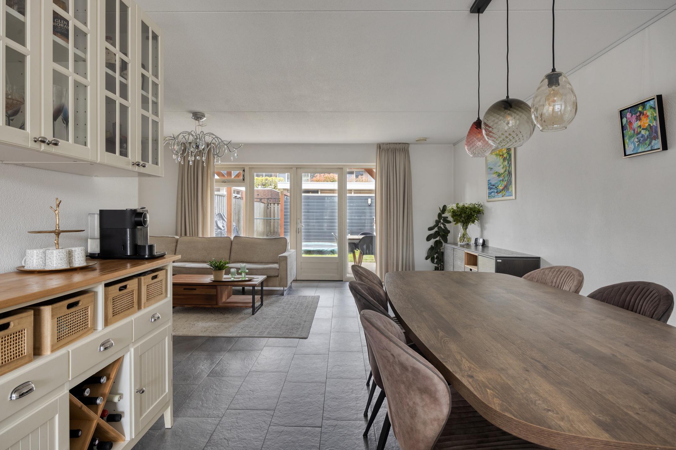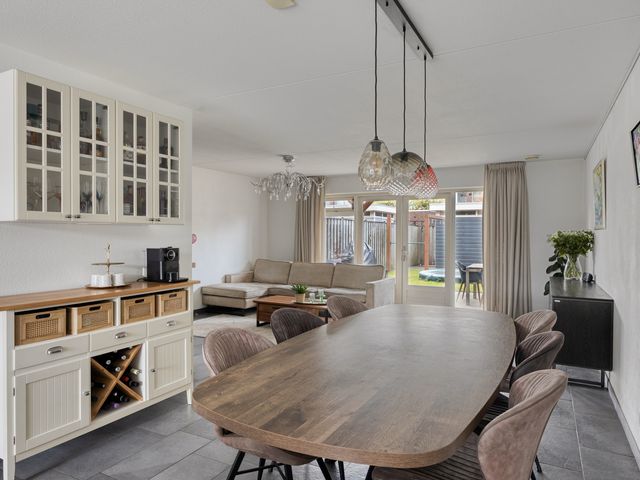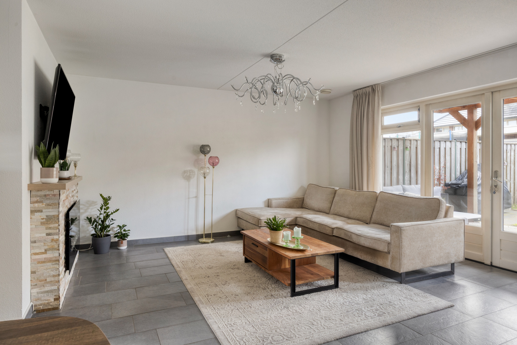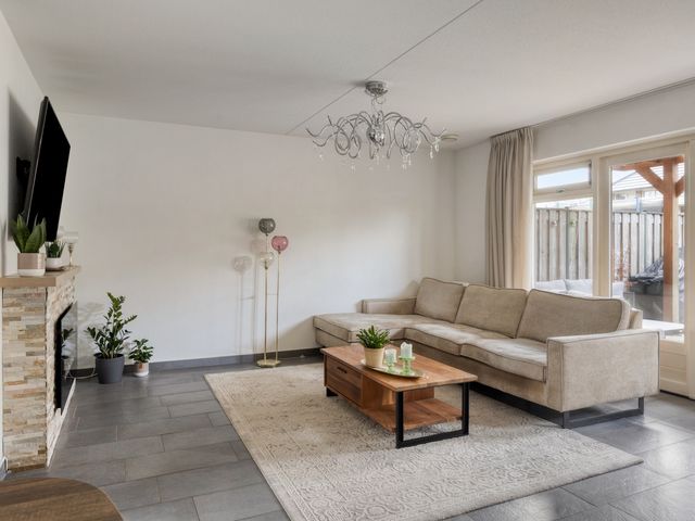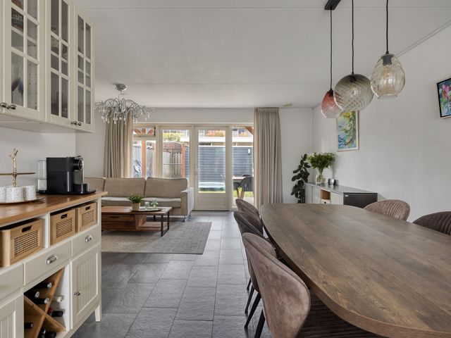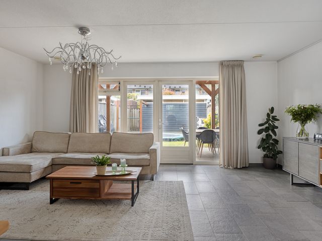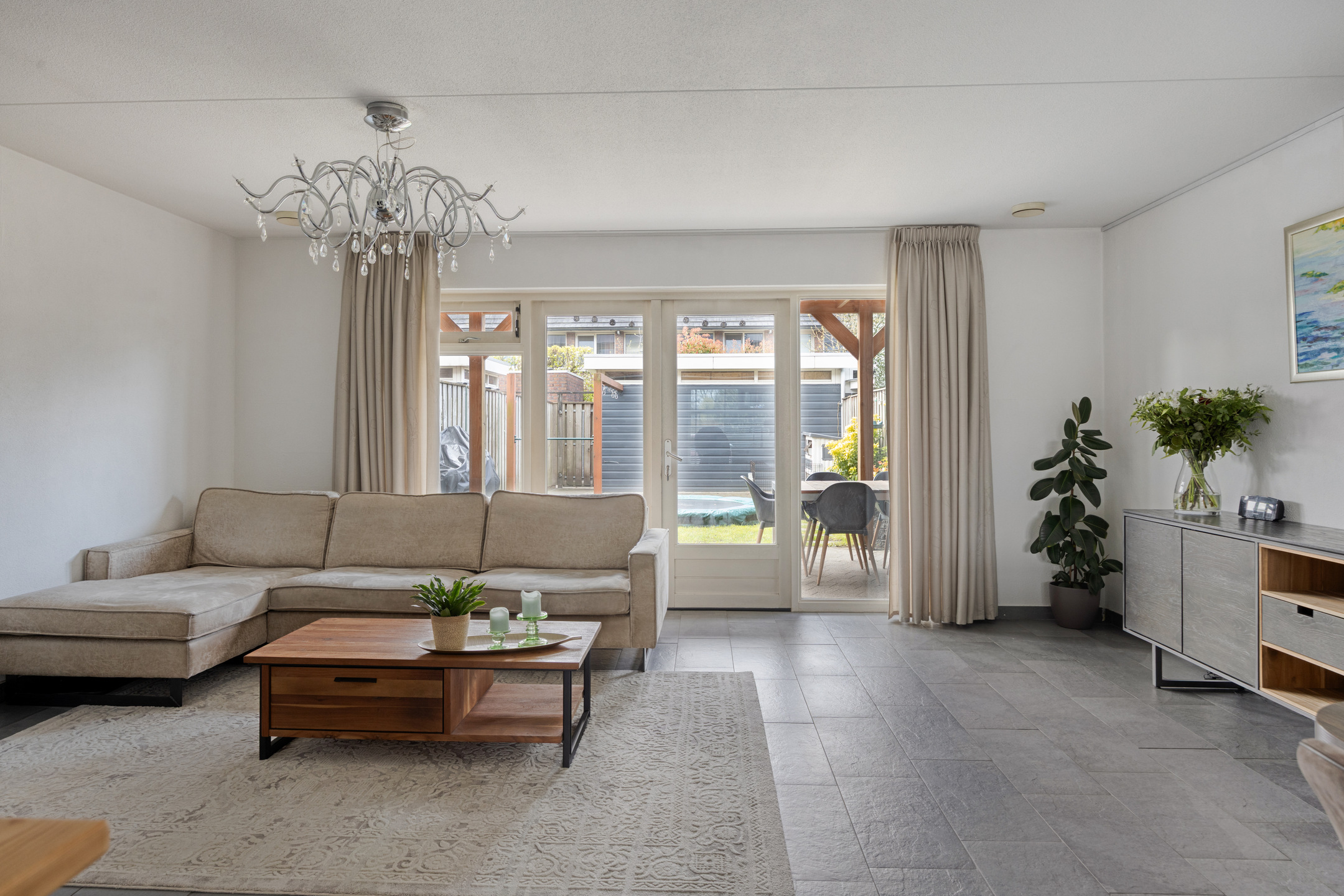 Aan de achterzijde van de woning, ligt de tuingerichte, L-vormige woonkamer met een forse glazen achtergevel pui met openslaande tuindeuren. Door de goed geplaatste raampartijen komt er veel natuurlijk daglicht binnen. Dit geldt overigens voor de gehele woning.