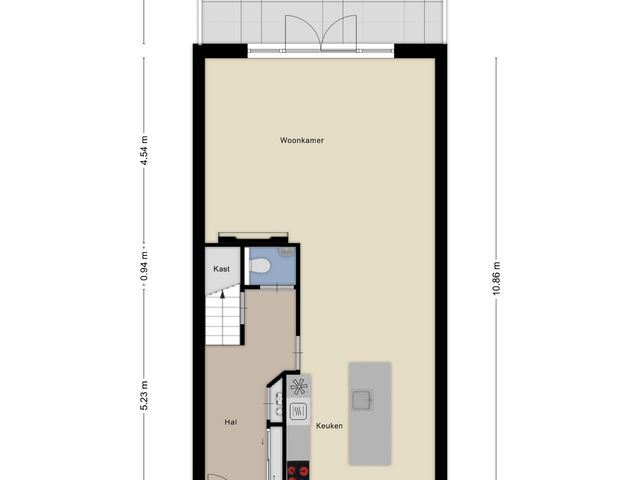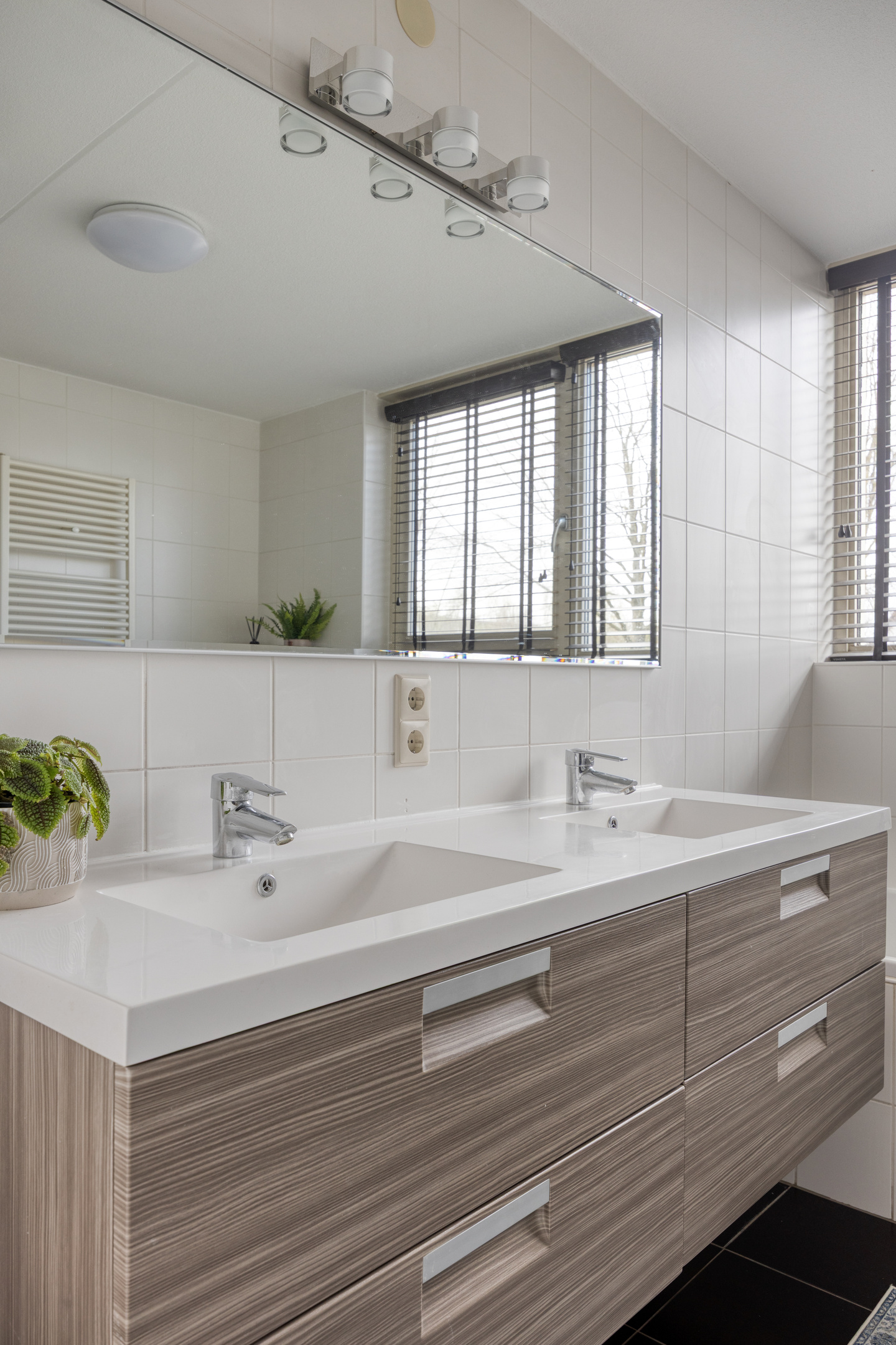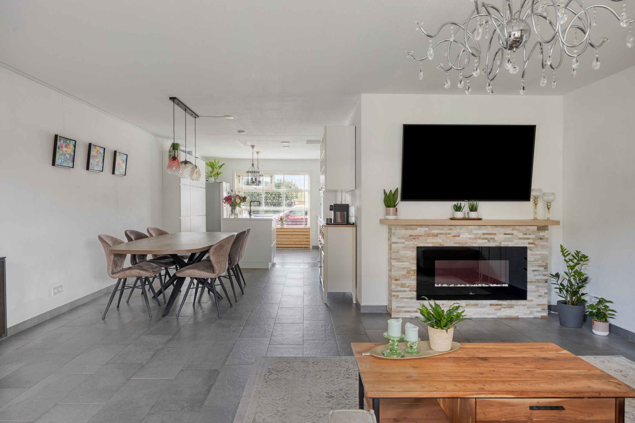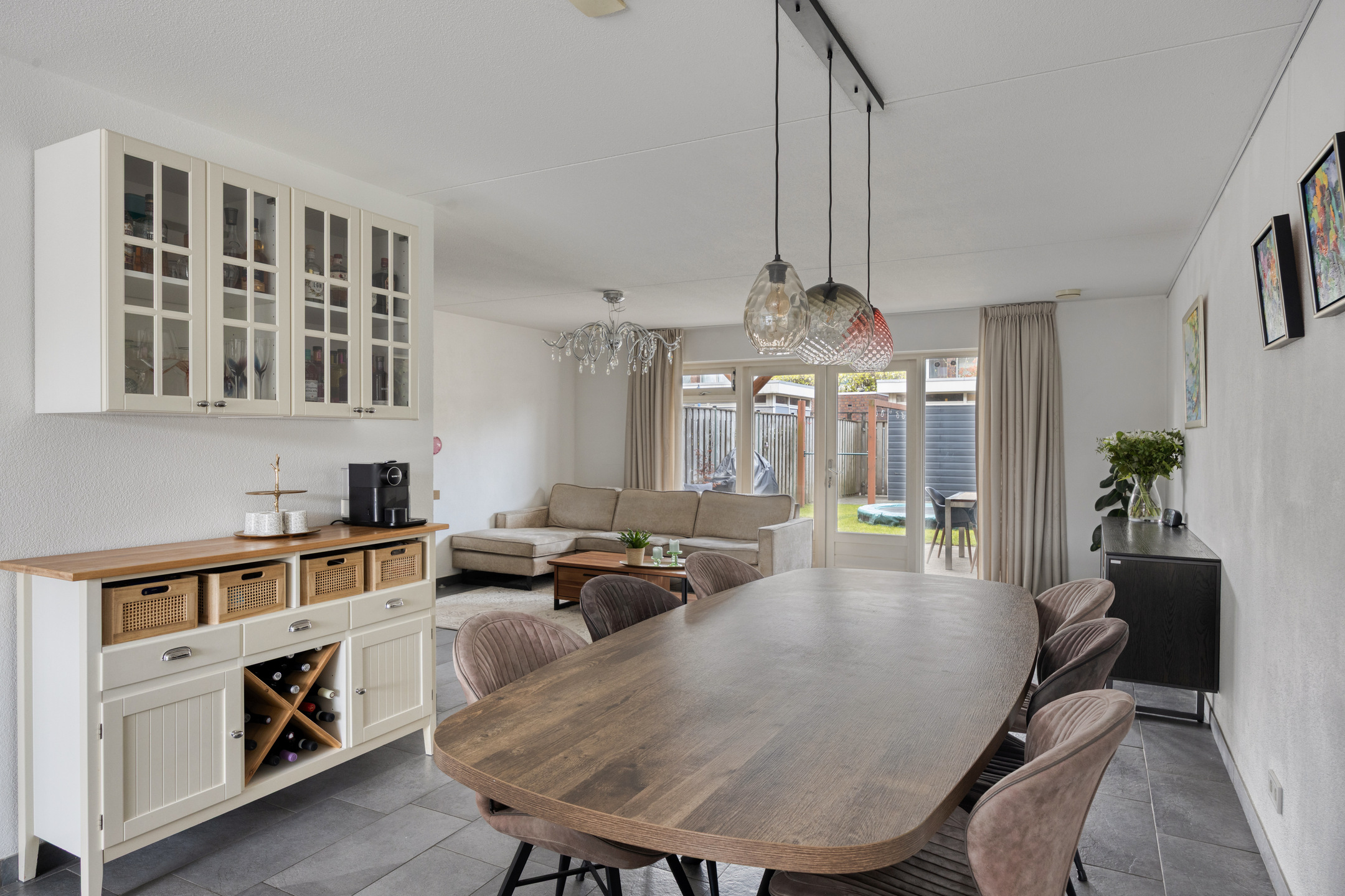 Aan de achterzijde van de woning, ligt de tuingerichte, L-vormige woonkamer met een forse glazen achtergevel pui met openslaande tuindeuren. Door de goed geplaatste raampartijen komt er veel natuurlijk daglicht binnen. Dit geldt overigens voor de gehele woning.