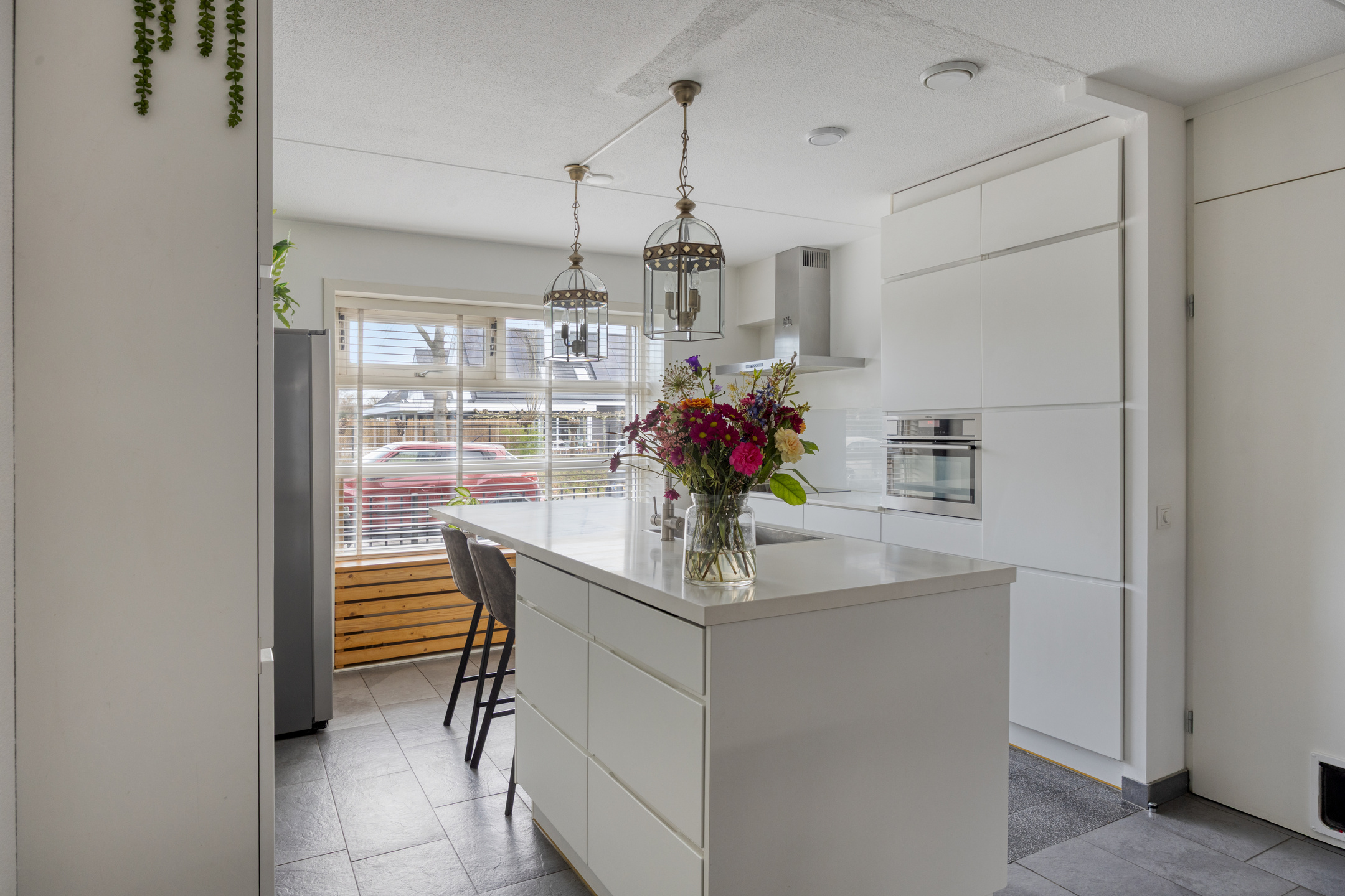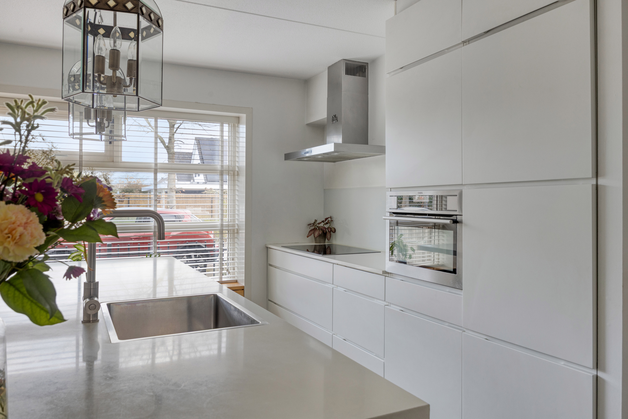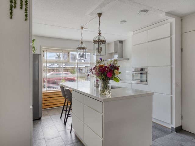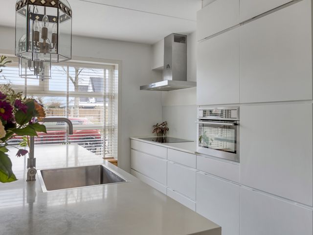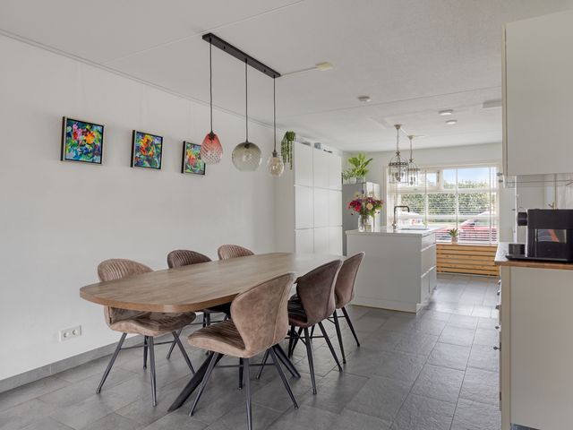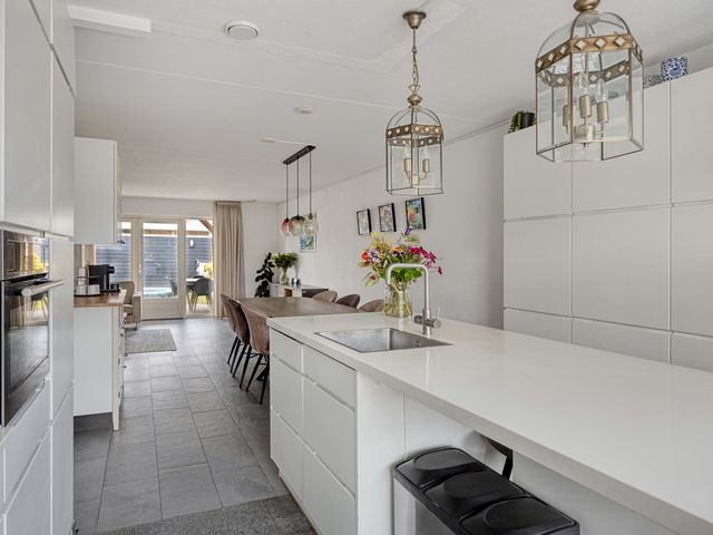 De verrassende inbouwkeuken met een groot voorgevelraam, heeft een echt eet/spoel eiland (voor 4 personen), een ruime, separate kastenwand, is o.a. uitgerust met een rvs design afzuigkap, een inductie kookplaat, een rvs oven, een vaatwasmachine ('25) en een royale koelkast. Aansluitend komt u in de aangrenzende eetkamer.