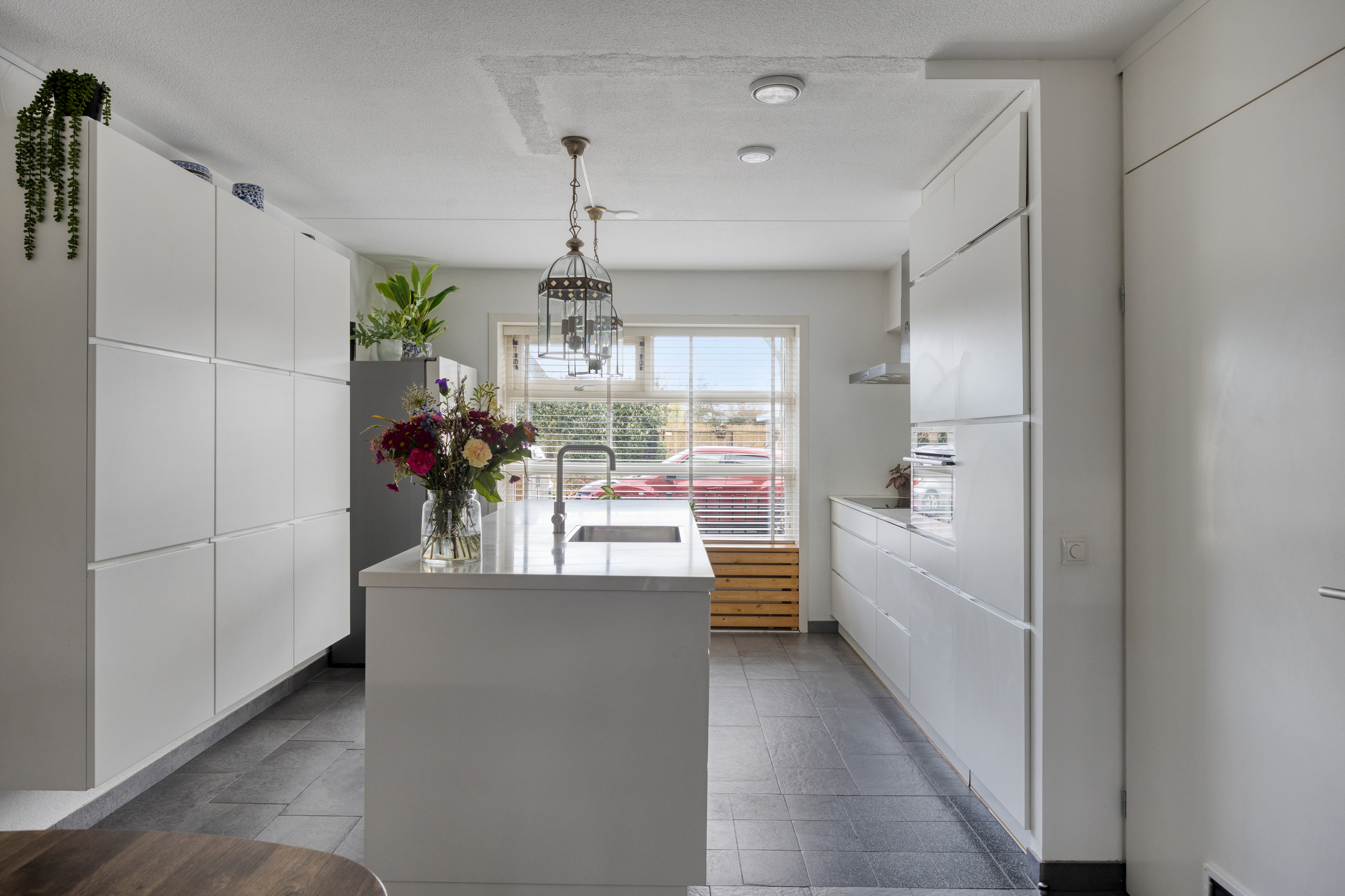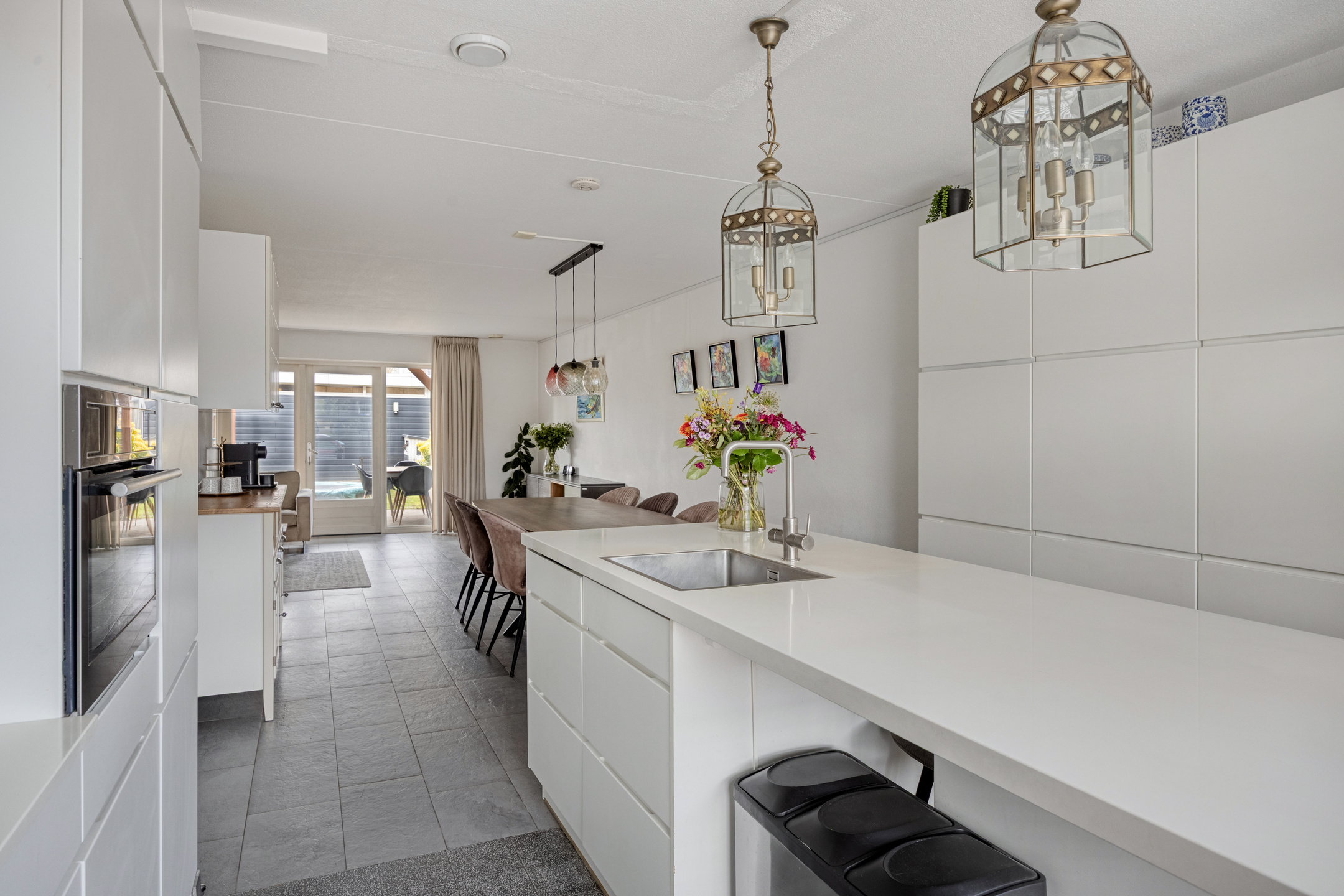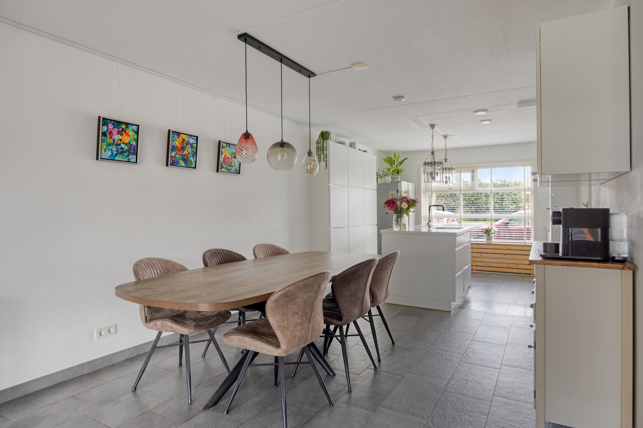 De verrassende inbouwkeuken met een groot voorgevelraam, heeft een echt eet/spoel eiland (voor 4 personen), een ruime, separate kastenwand, is o.a. uitgerust met een rvs design afzuigkap, een inductie kookplaat, een rvs oven, een vaatwasmachine ('25) en een royale koelkast. Aansluitend komt u in de aangrenzende eetkamer.