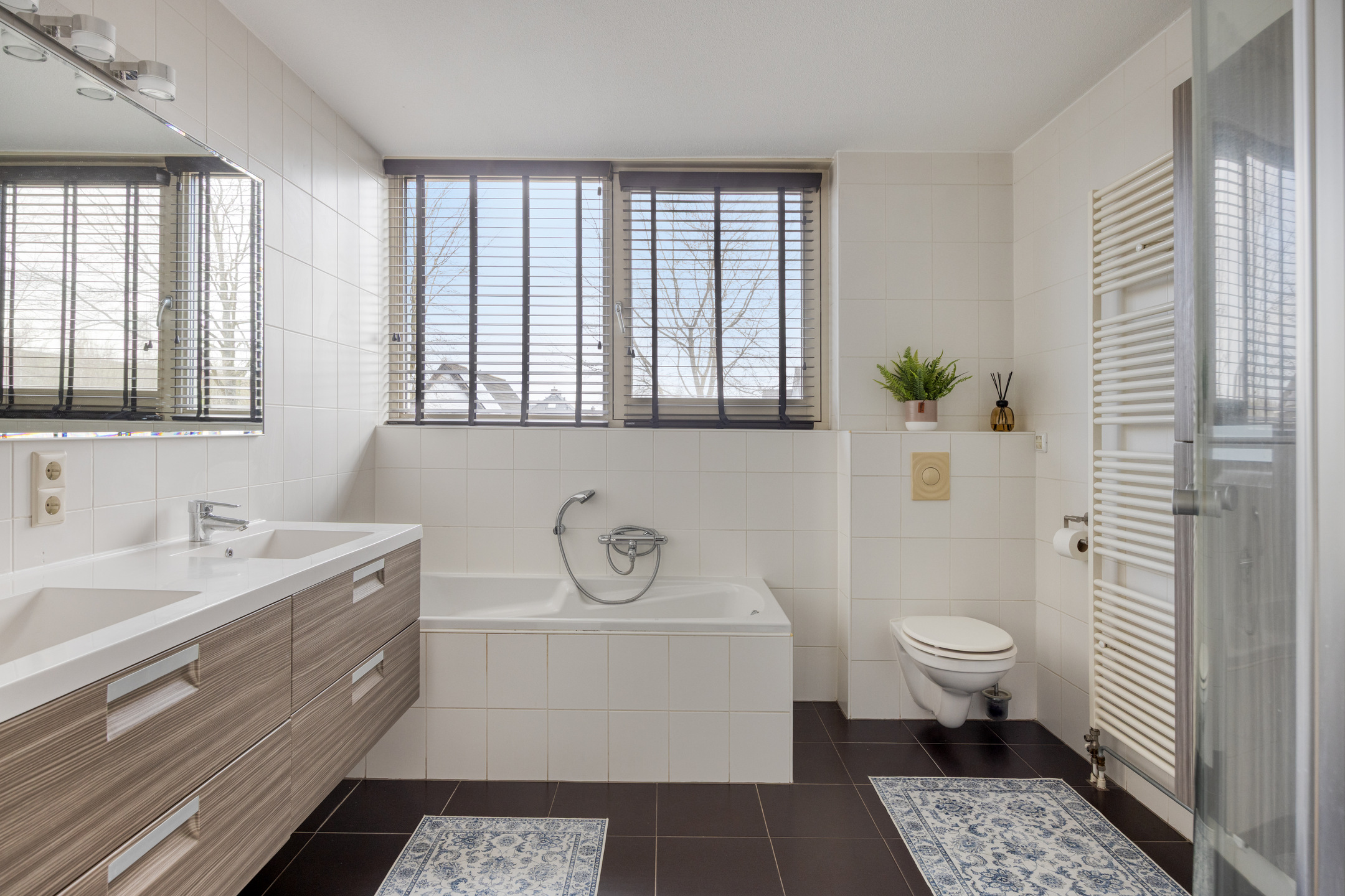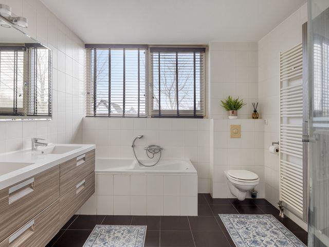 Een overloop met een trapopgang naar de tweede verdieping, een ingebouwde 2 deurskast met spiegels, 2 royale slaapkamers en badkamer 1. Badkamer 1, met een grootvoorgevelraam, een design-radiator, mechanische ventilatie, extra vrijhangende kasten, is o.a. voorzien van een wastafelmeubel, een ligbad en een separate douche cabine en een vrijhangend toilet. Zowel het ligbad alsmede de douche hebben thermostatische kranen.