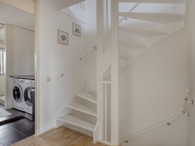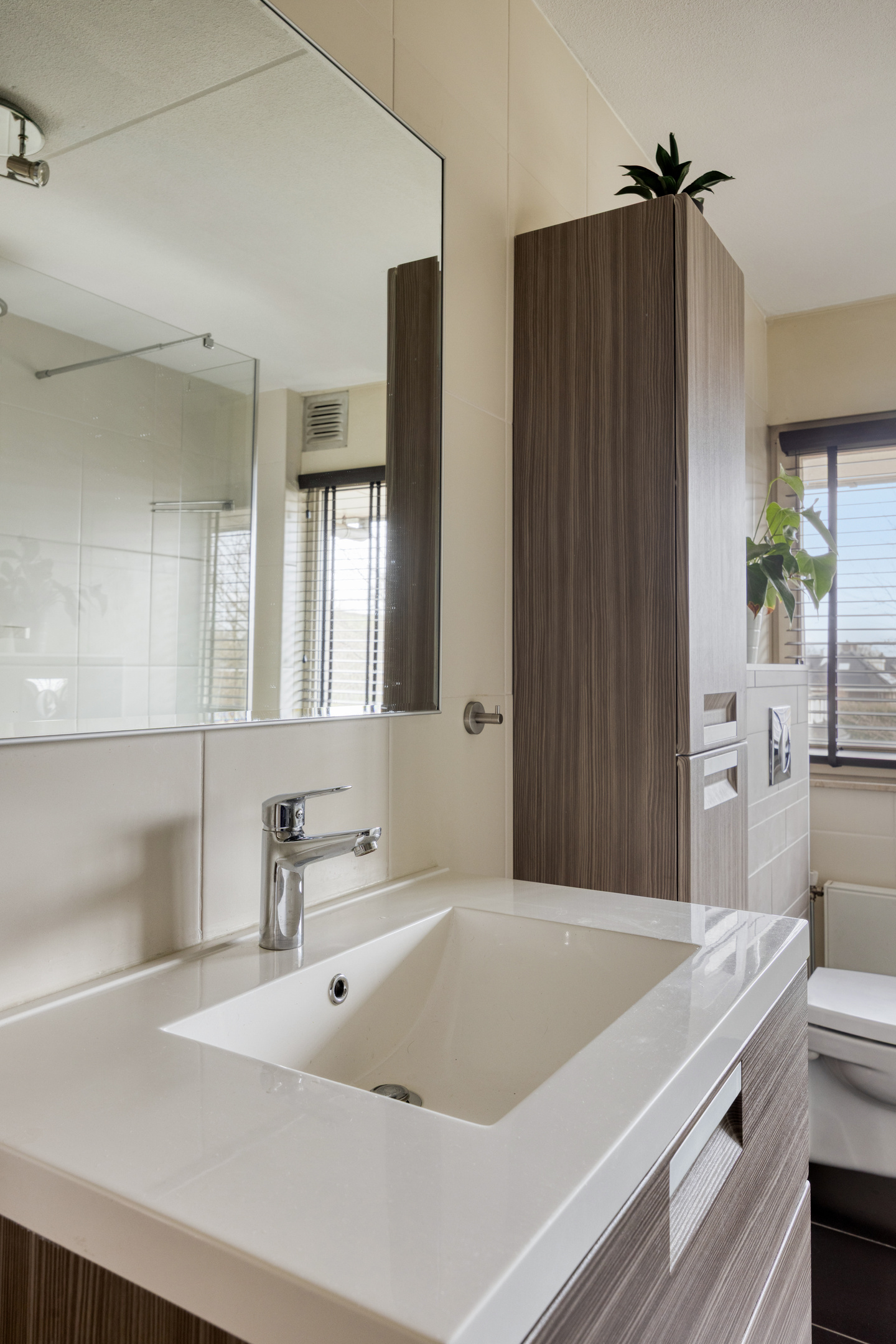 Ook op deze woonlaag ligt een lichte laminaat vloer, de wanden zijn gespachteld en de plafonds zijn gespoten.