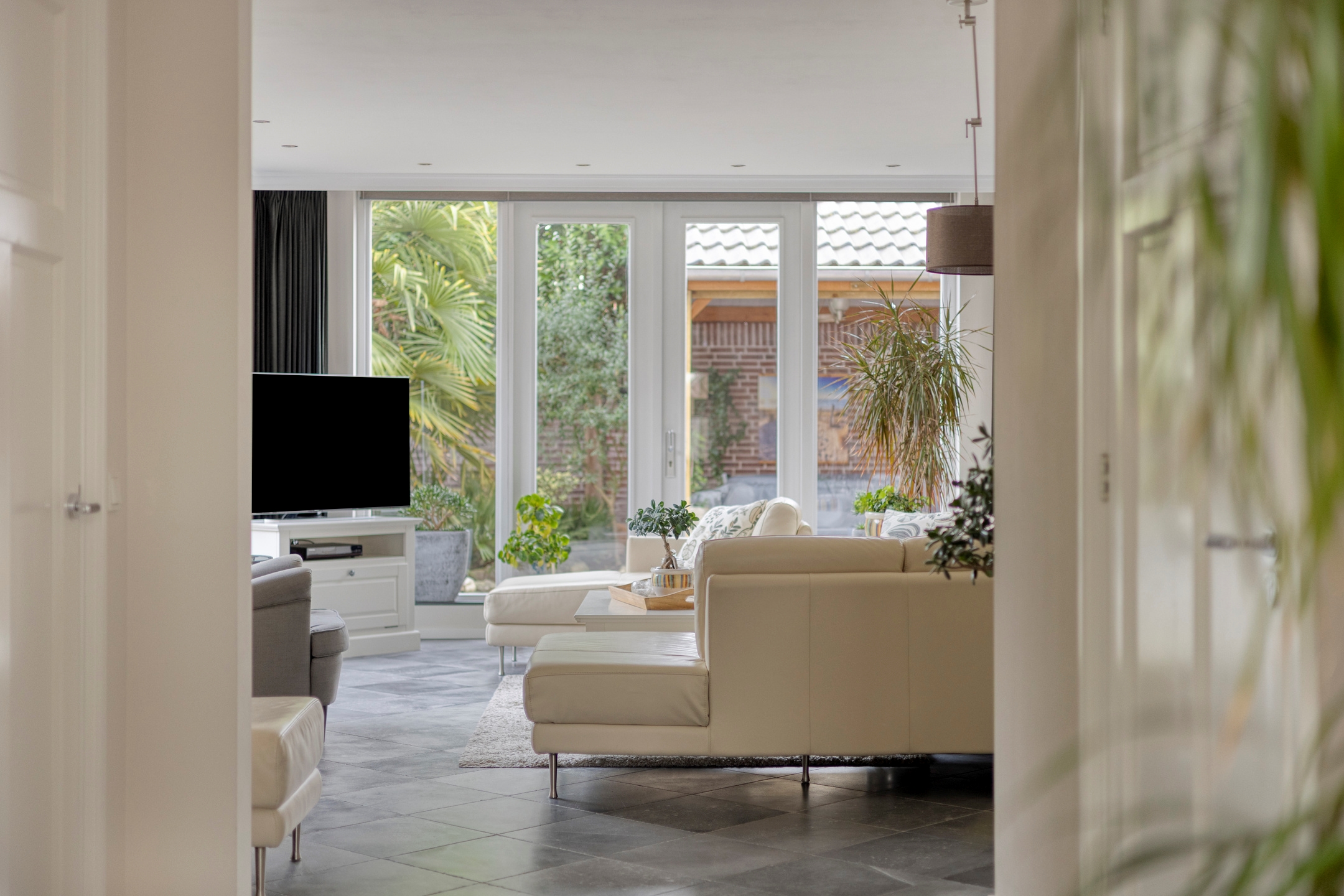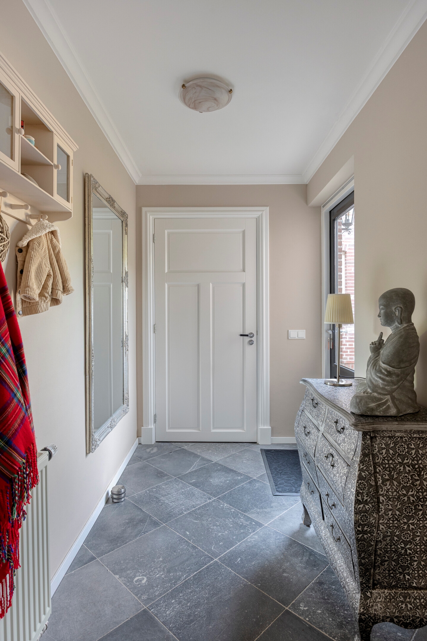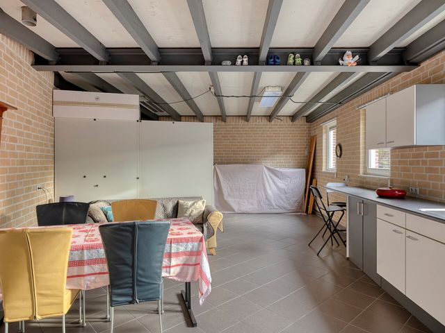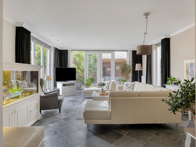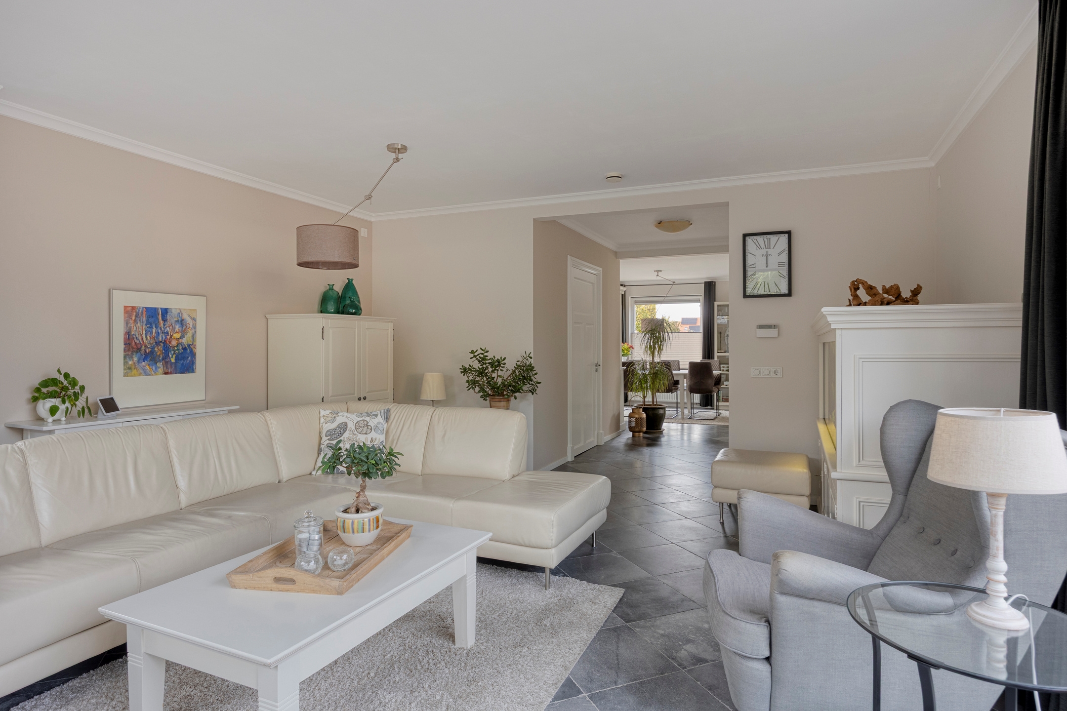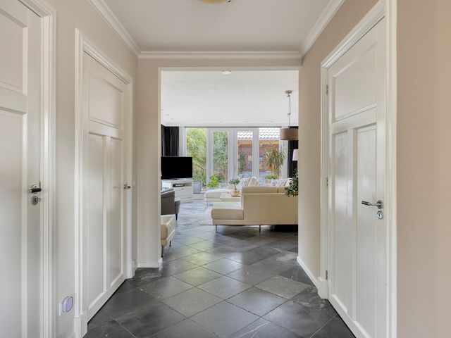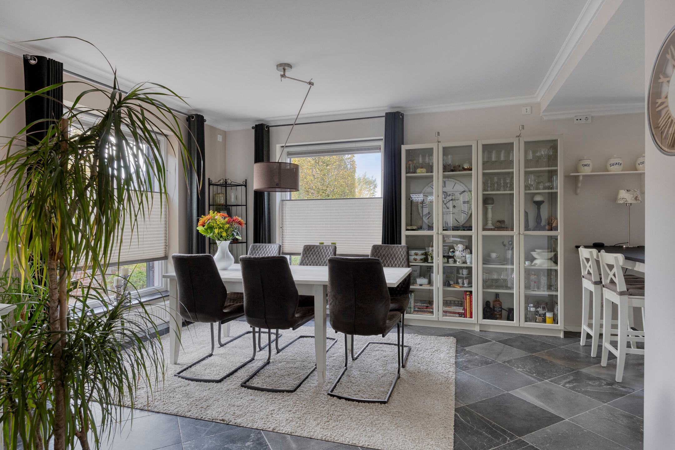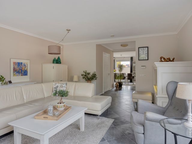 De vloer is afgewerkt met een stijlvolle Belgisch hardstenen vloer met vloerverwarming, terwijl de wanden strak zijn gestuct. Aan de achterzijde bevindt zich de zithoek: een heerlijke, lichte en ruimte dankzij de grote ramen en de openslaande tuindeuren die toegang bieden tot de achtertuin. Het plafond is voorzien van moderne inbouwspots, die de ruimte extra sfeer en licht geven.