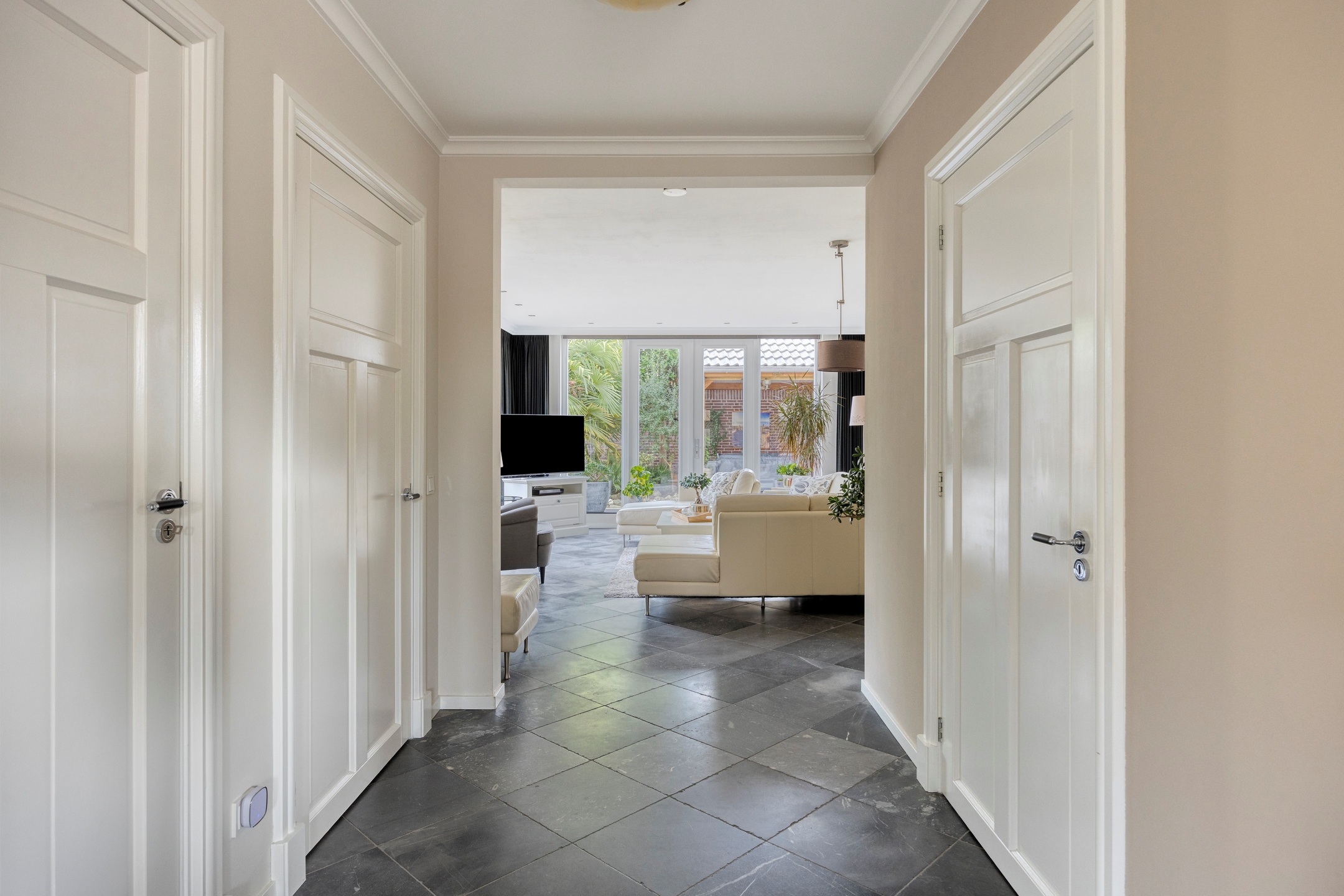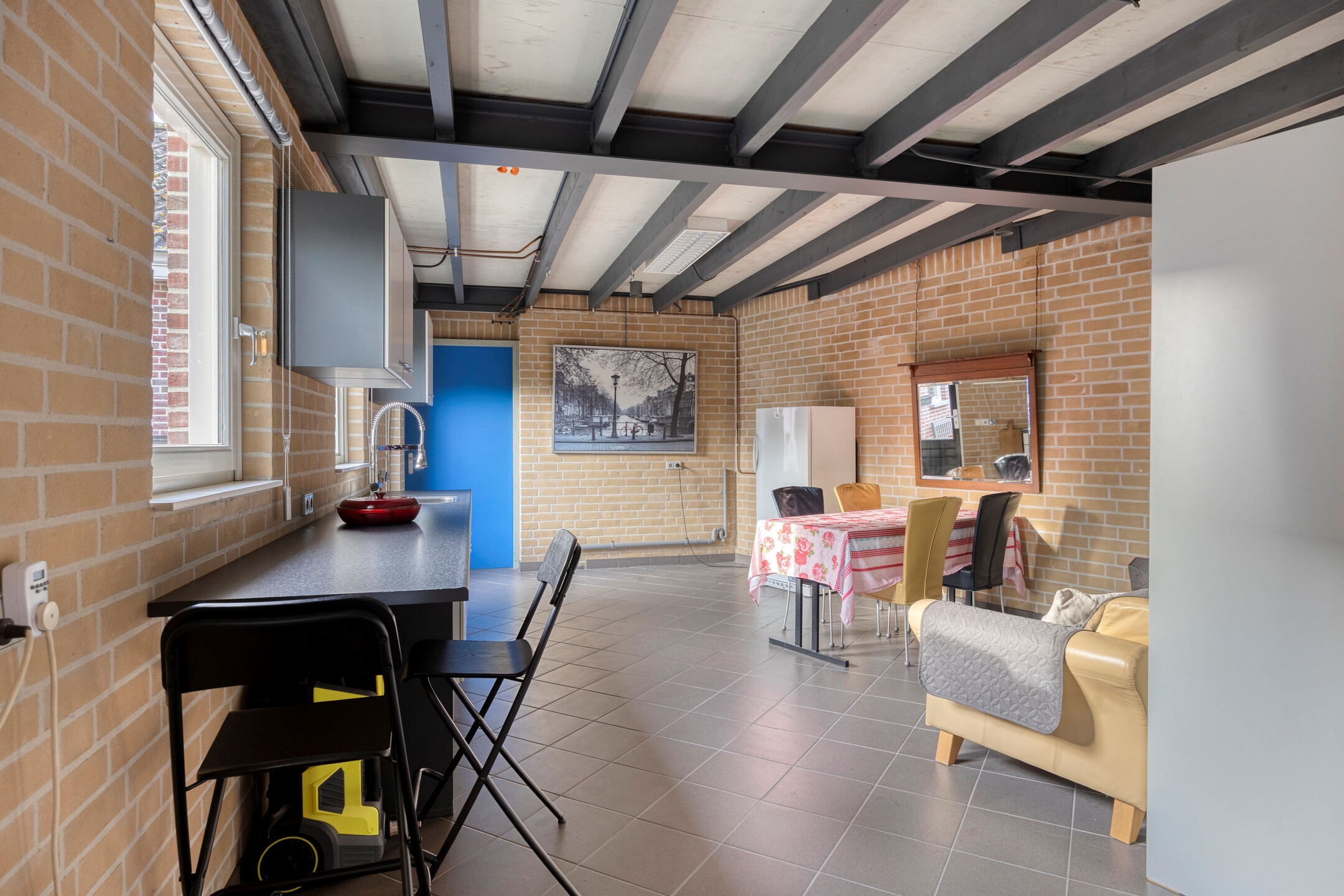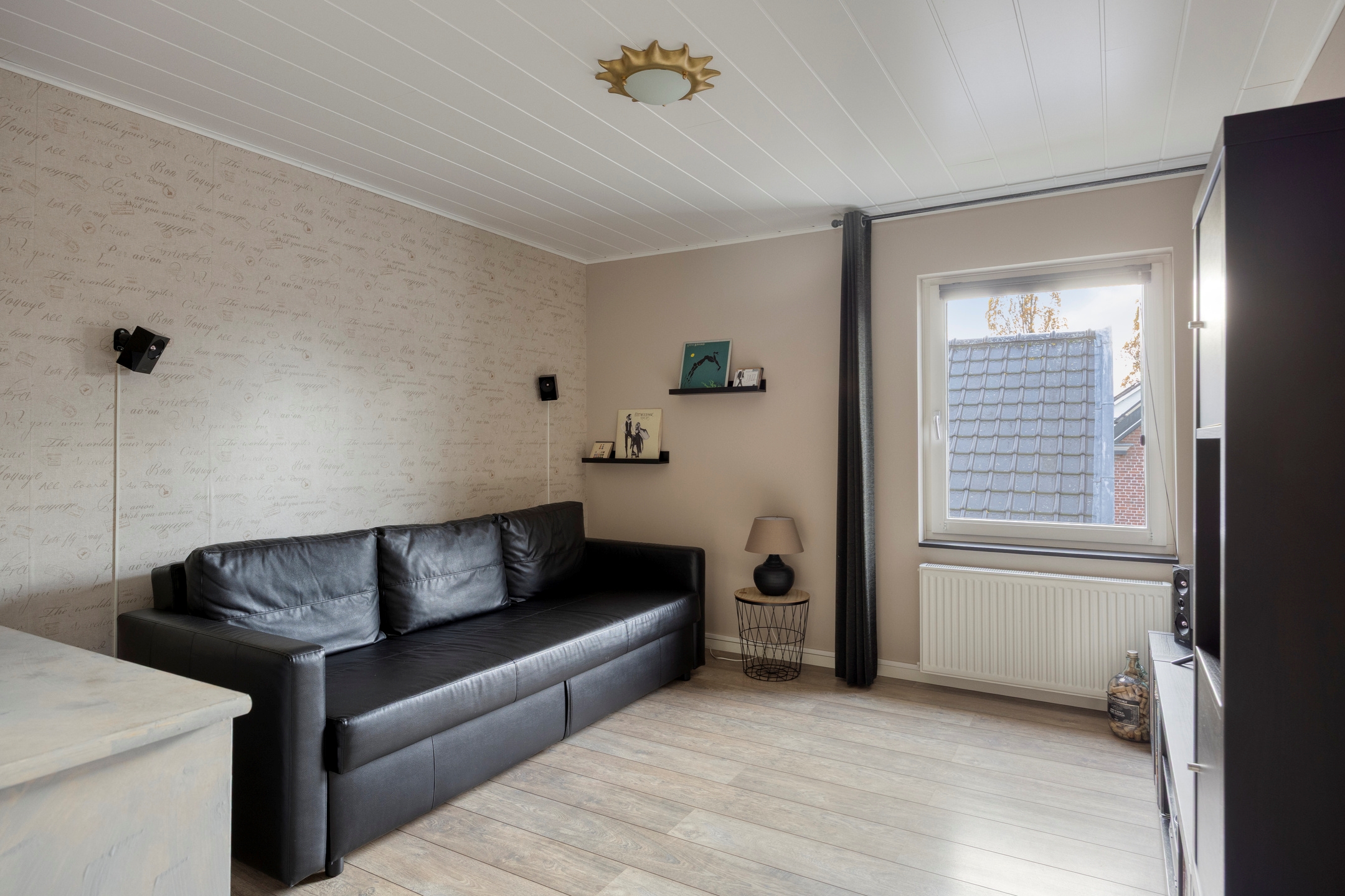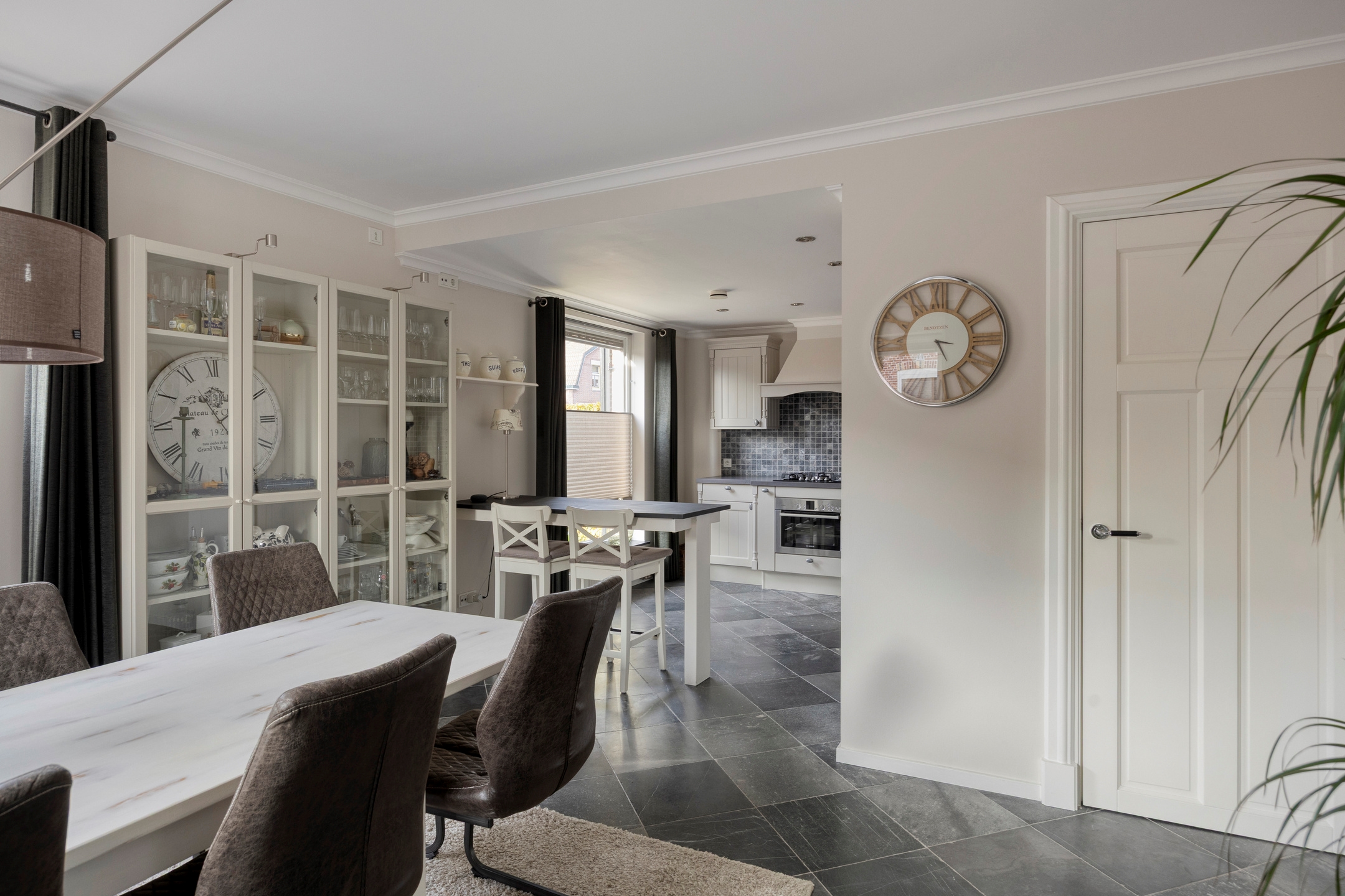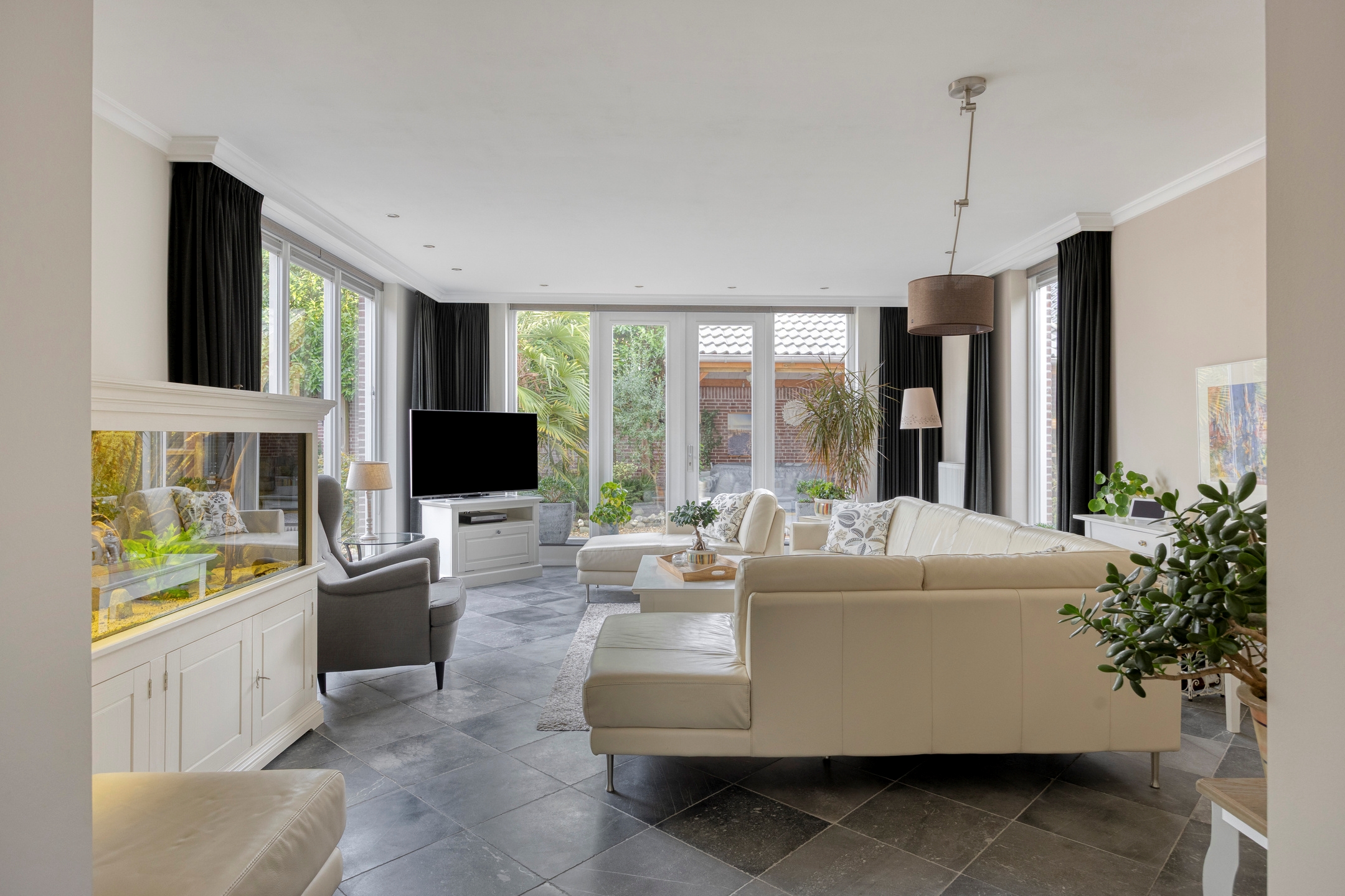 De vloer is afgewerkt met een stijlvolle Belgisch hardstenen vloer met vloerverwarming, terwijl de wanden strak zijn gestuct. Aan de achterzijde bevindt zich de zithoek: een heerlijke, lichte en ruimte dankzij de grote ramen en de openslaande tuindeuren die toegang bieden tot de achtertuin. Het plafond is voorzien van moderne inbouwspots, die de ruimte extra sfeer en licht geven.