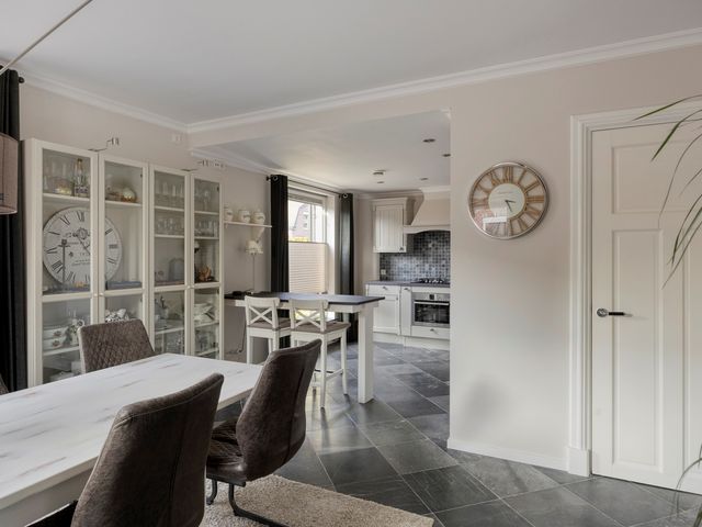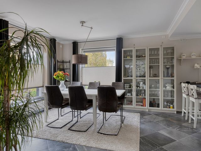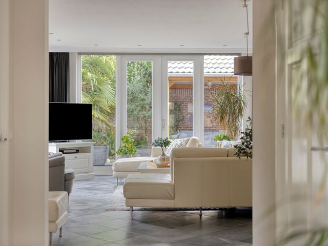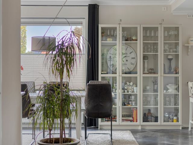 Bij binnenkomst in de woonkamer en keuken word je direct verwelkomd door een gevoel van ruimte en licht. De grote raampartijen aan de voorzijde zorgen niet alleen voor een prachtige lichtinval, maar ook voor een fraai uitzicht op de omgeving.