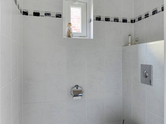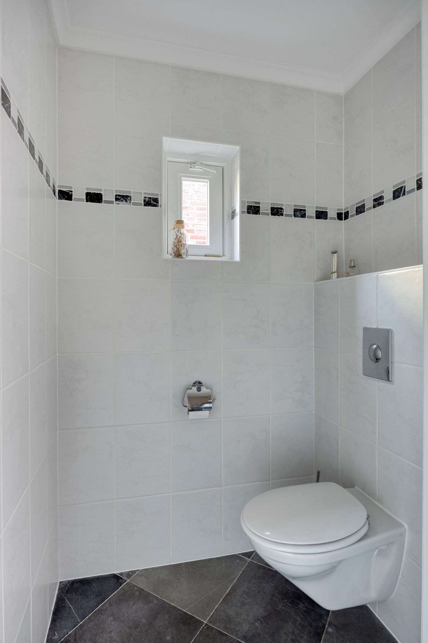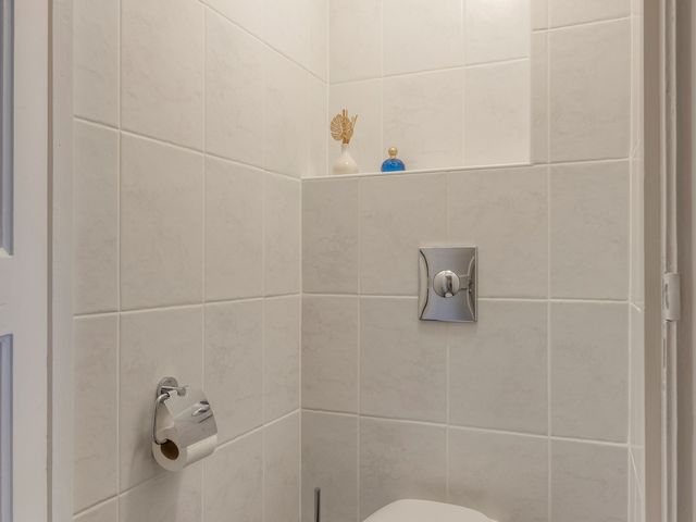 Het separate toilet is geheel betegeld en voorzien van een wandcloset.