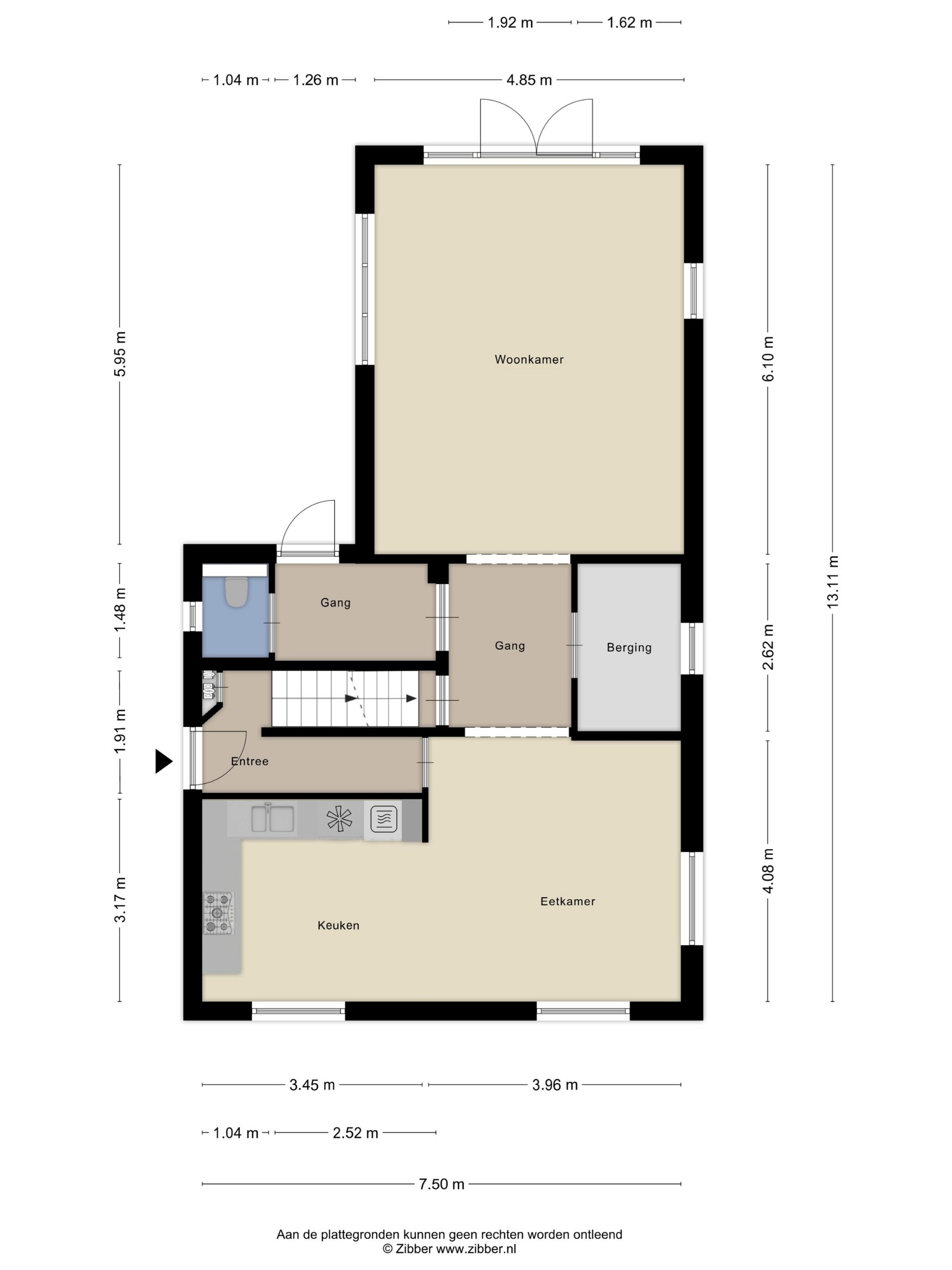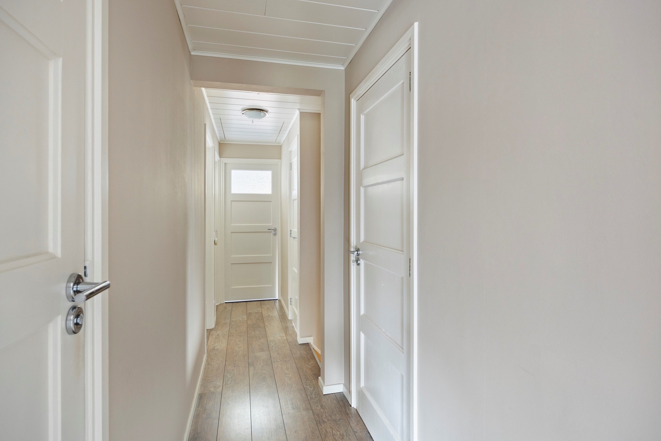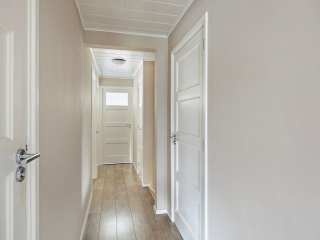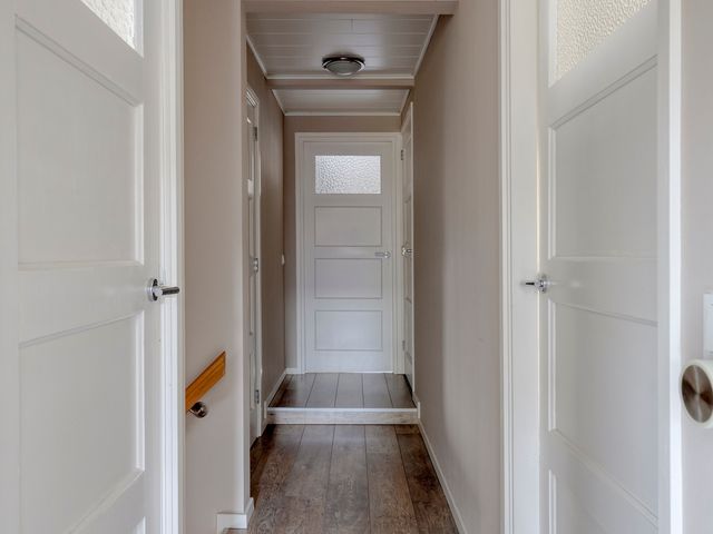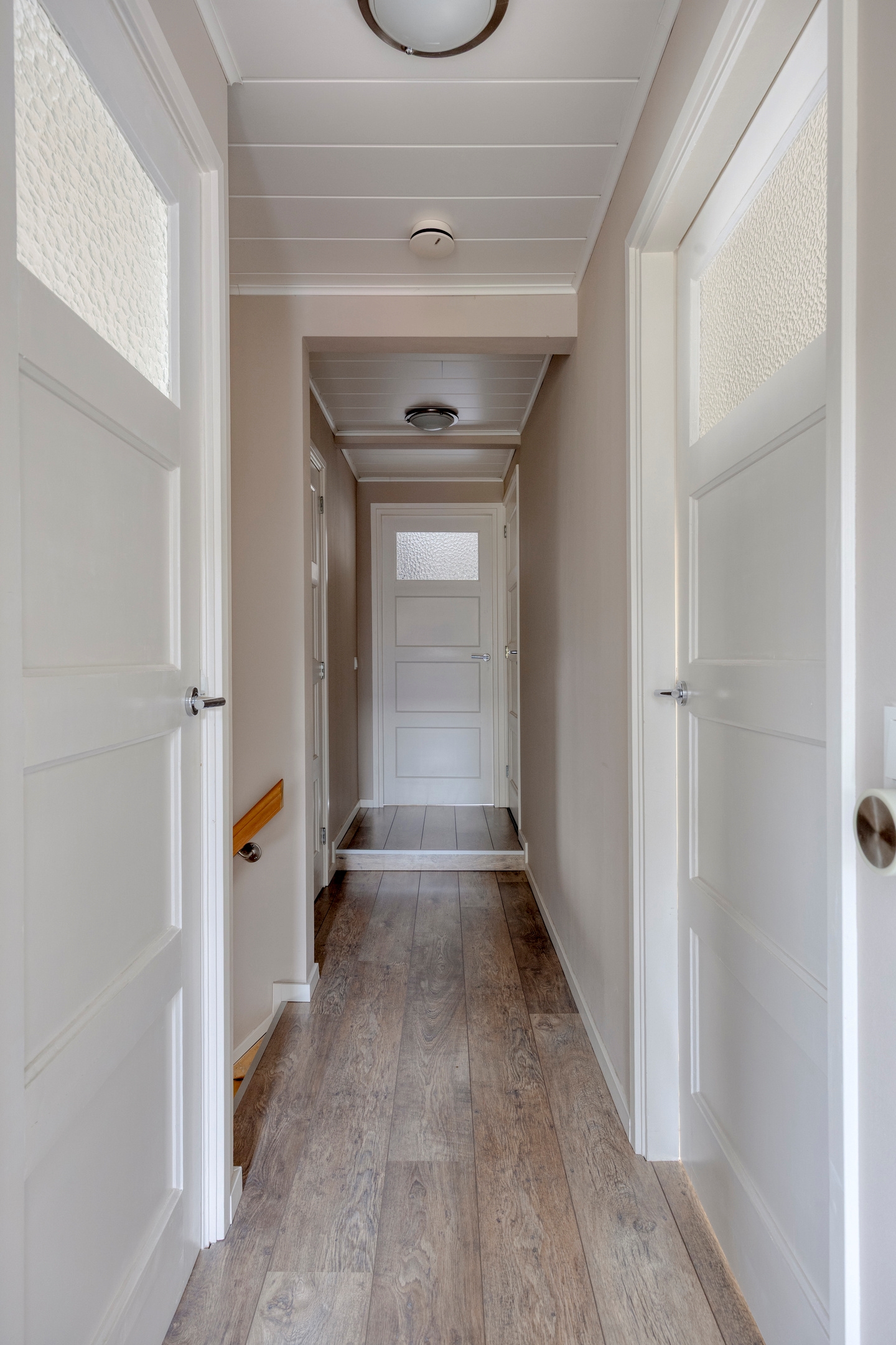 In het midden van de woning bevindt zich de toegang tot een kelder op stahoogte, een praktische vaste kast die momenteel dienstdoet als garderobekast en de doorgang naar de achterhal. Vanuit deze hal zijn het toilet en de achtertuin bereikbaar via een loopdeur.