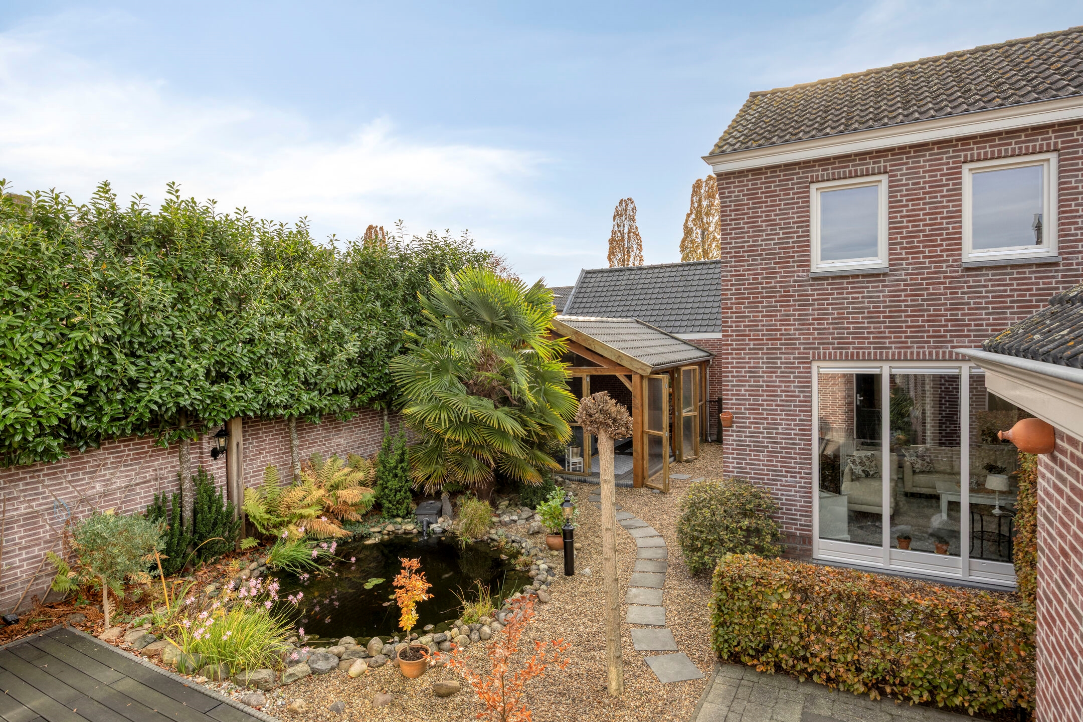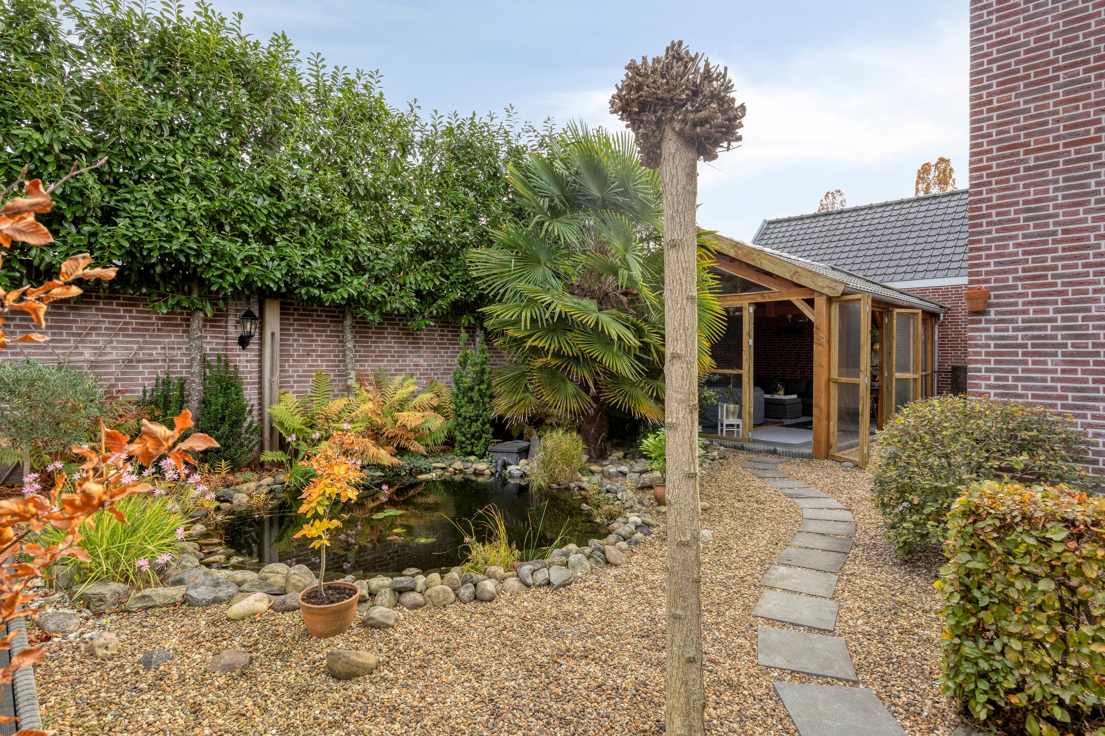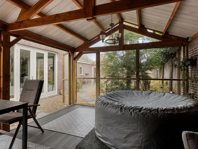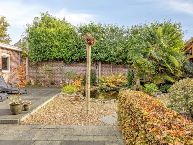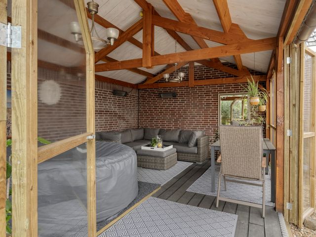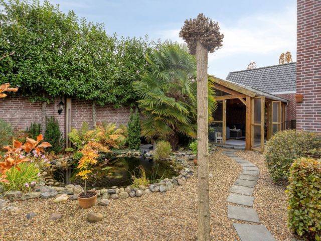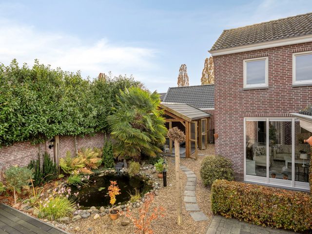 De achtertuin biedt volop privacy en is fraai ingericht met een vijver, een zonneterras met vlonderplanken van composiet, sierbestrating en grind. Daarnaast is er een mooie beplanting met vaste planten en twee palmbomen, wat zorgt voor een zomerse uitstraling. Achterin de tuin bevindt zich een sfeervolle, volledig afsluitbare overkapping. Deze kan desgewenst ook open worden gezet, zodat je optimaal kunt genieten van elk seizoen. De overkapping is voorzien van elektra, meerdere stopcontacten en twee elektrische kachels, waardoor het er het hele jaar door aangenaam vertoeven is.