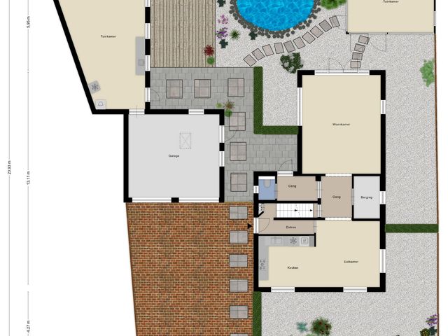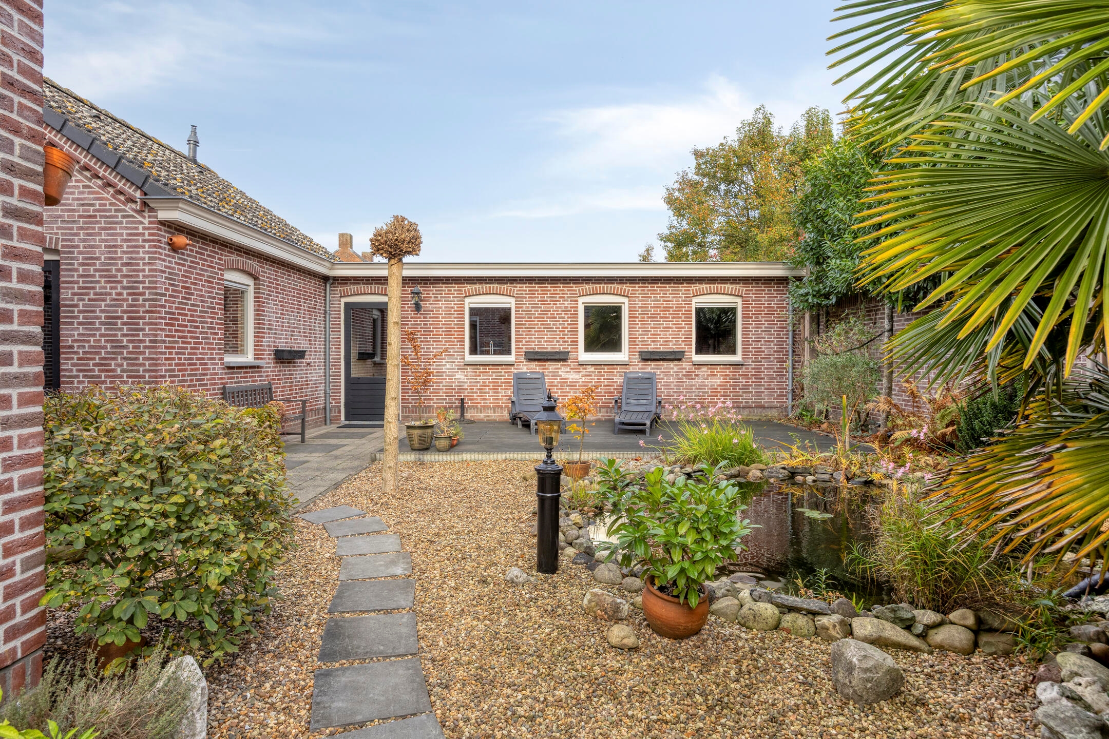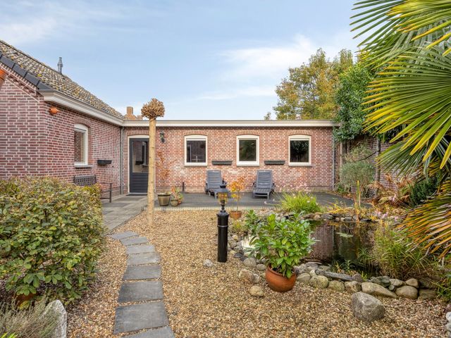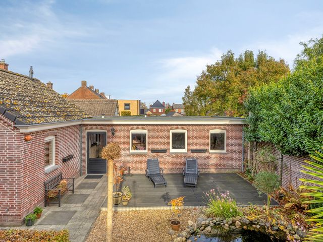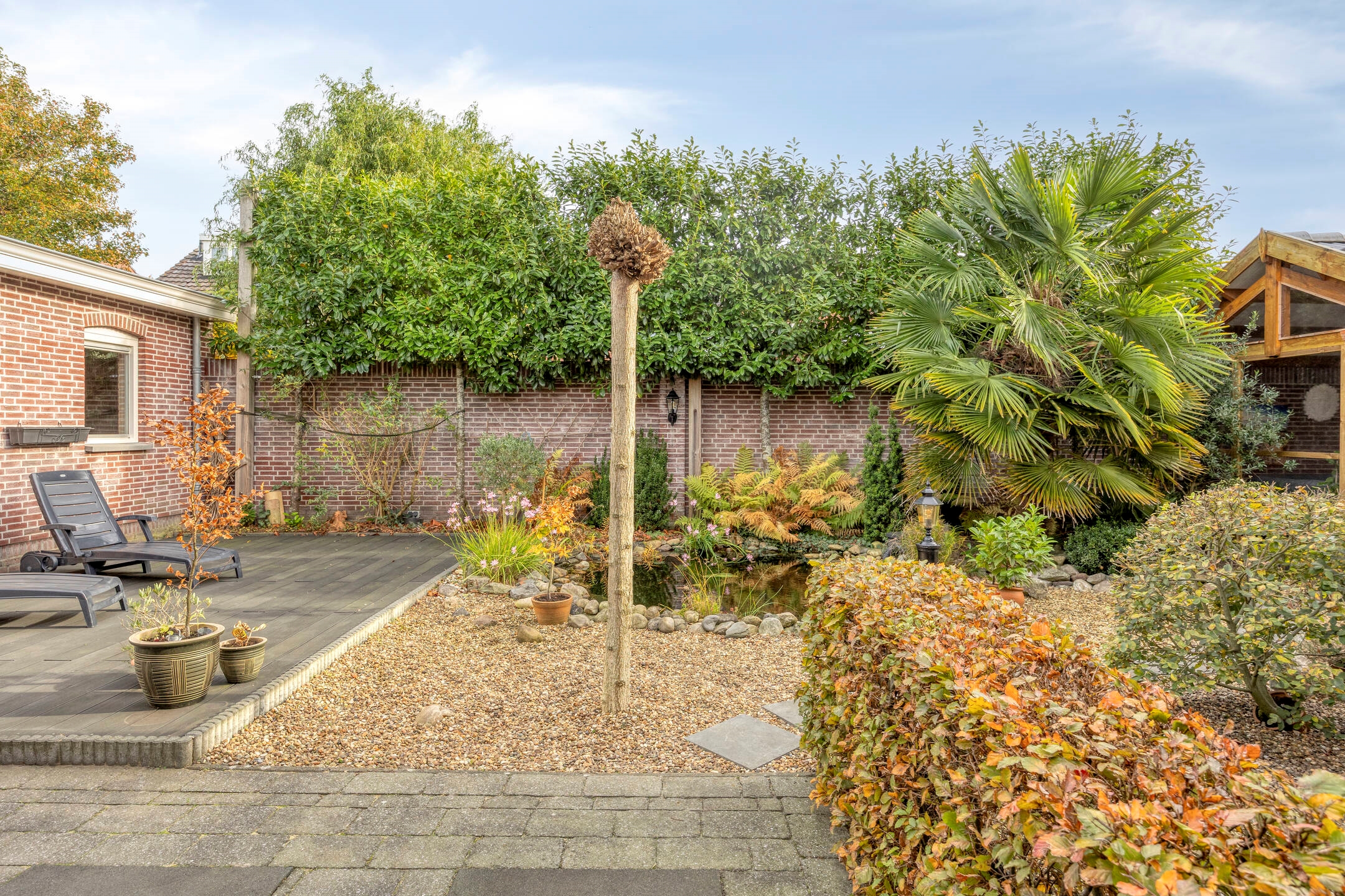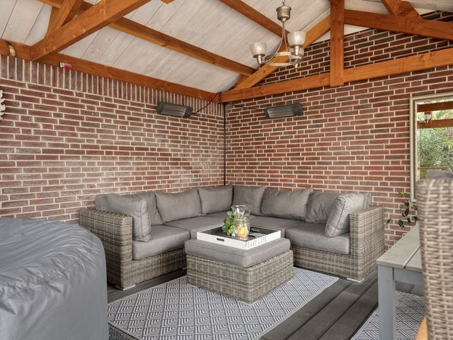 De achtertuin biedt volop privacy en is fraai ingericht met een vijver, een zonneterras met vlonderplanken van composiet, sierbestrating en grind. Daarnaast is er een mooie beplanting met vaste planten en twee palmbomen, wat zorgt voor een zomerse uitstraling. Achterin de tuin bevindt zich een sfeervolle, volledig afsluitbare overkapping. Deze kan desgewenst ook open worden gezet, zodat je optimaal kunt genieten van elk seizoen. De overkapping is voorzien van elektra, meerdere stopcontacten en twee elektrische kachels, waardoor het er het hele jaar door aangenaam vertoeven is.