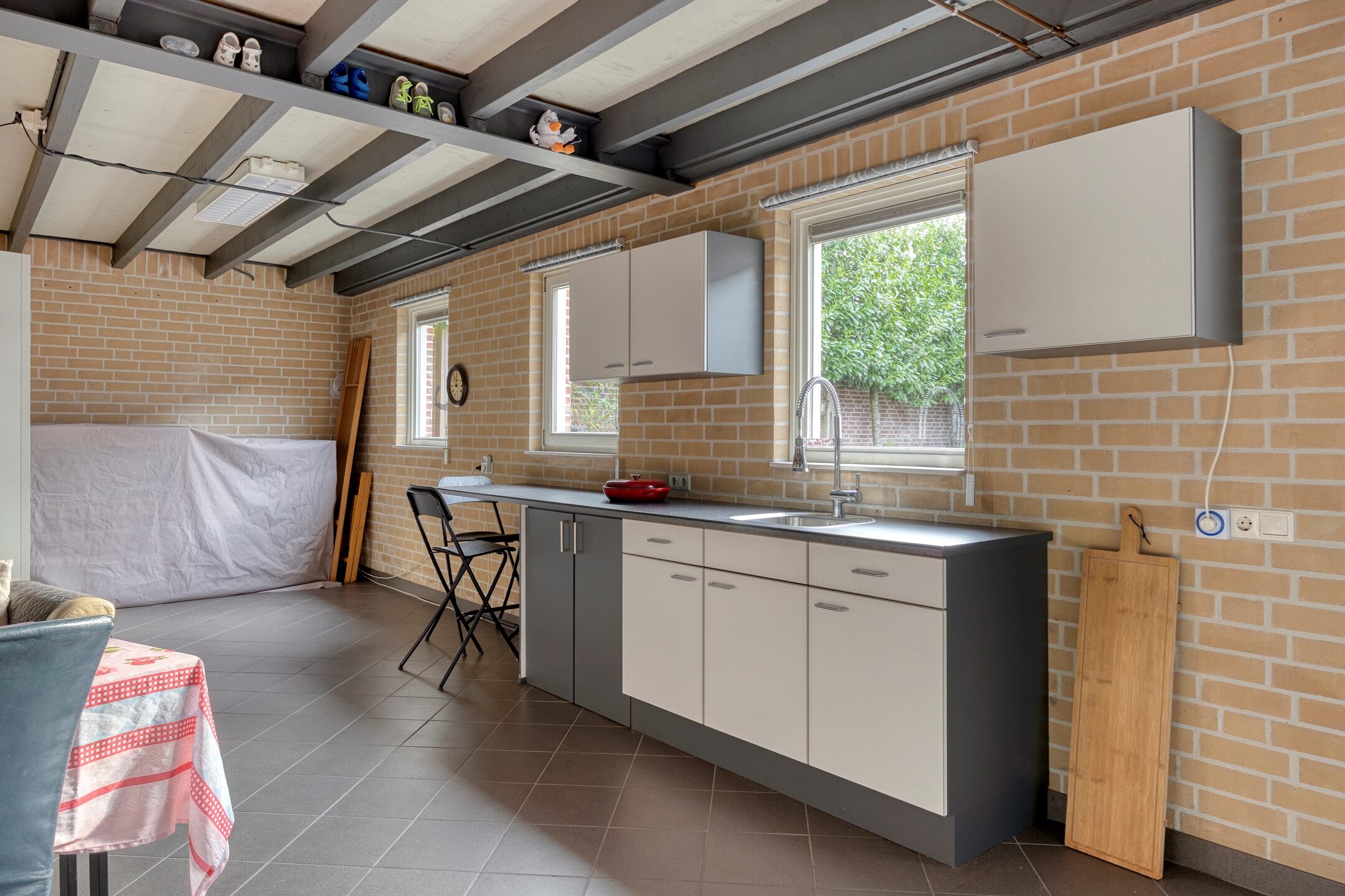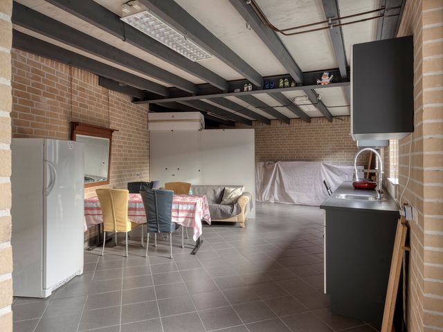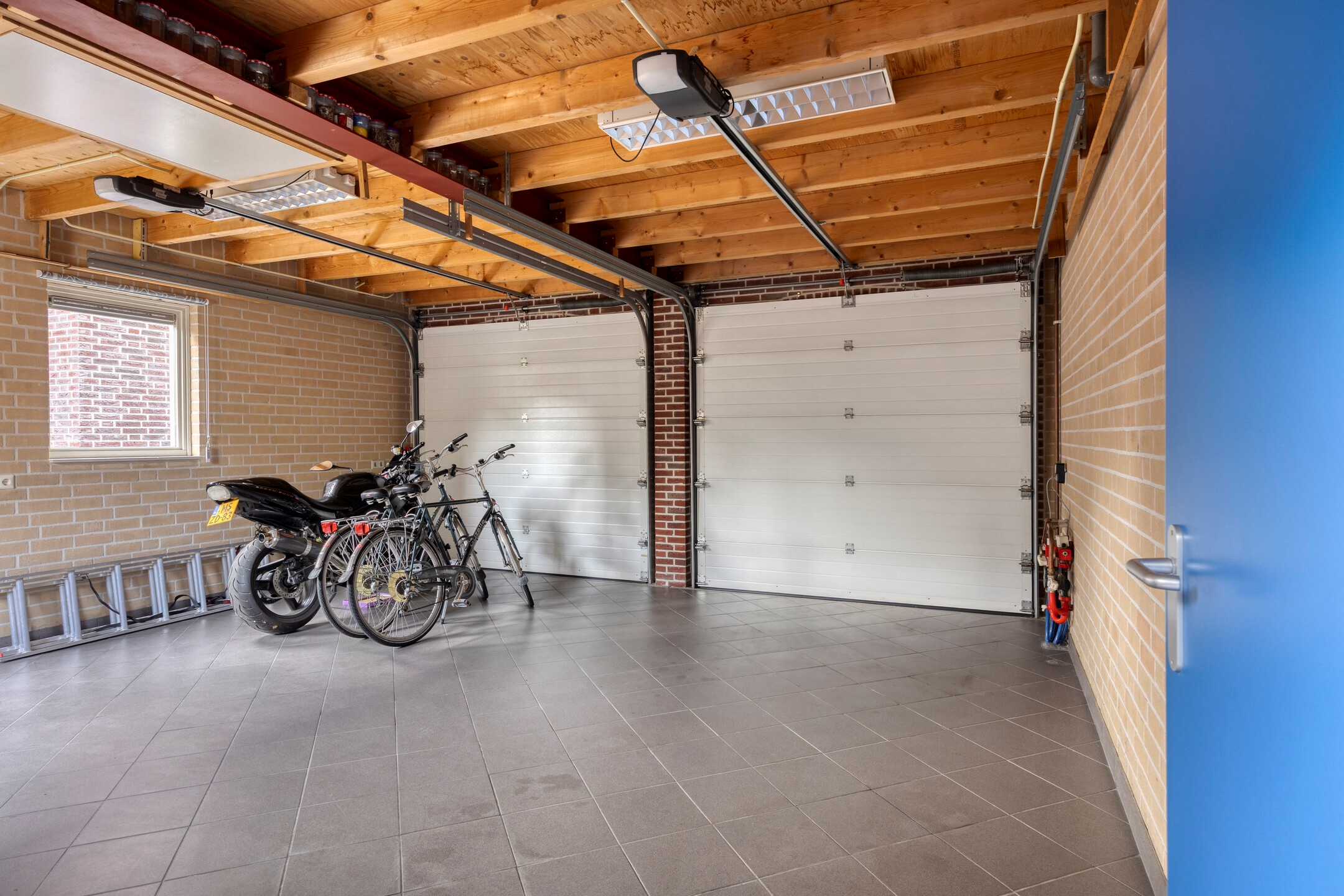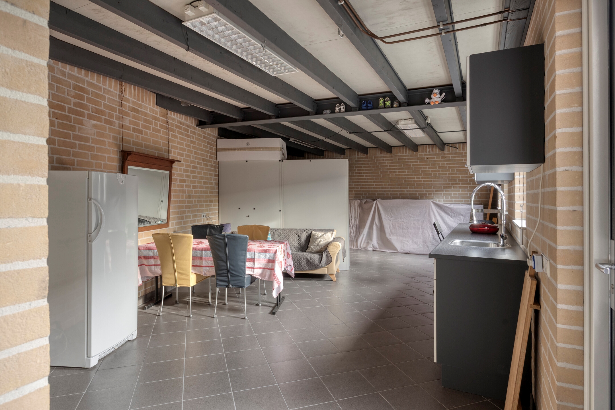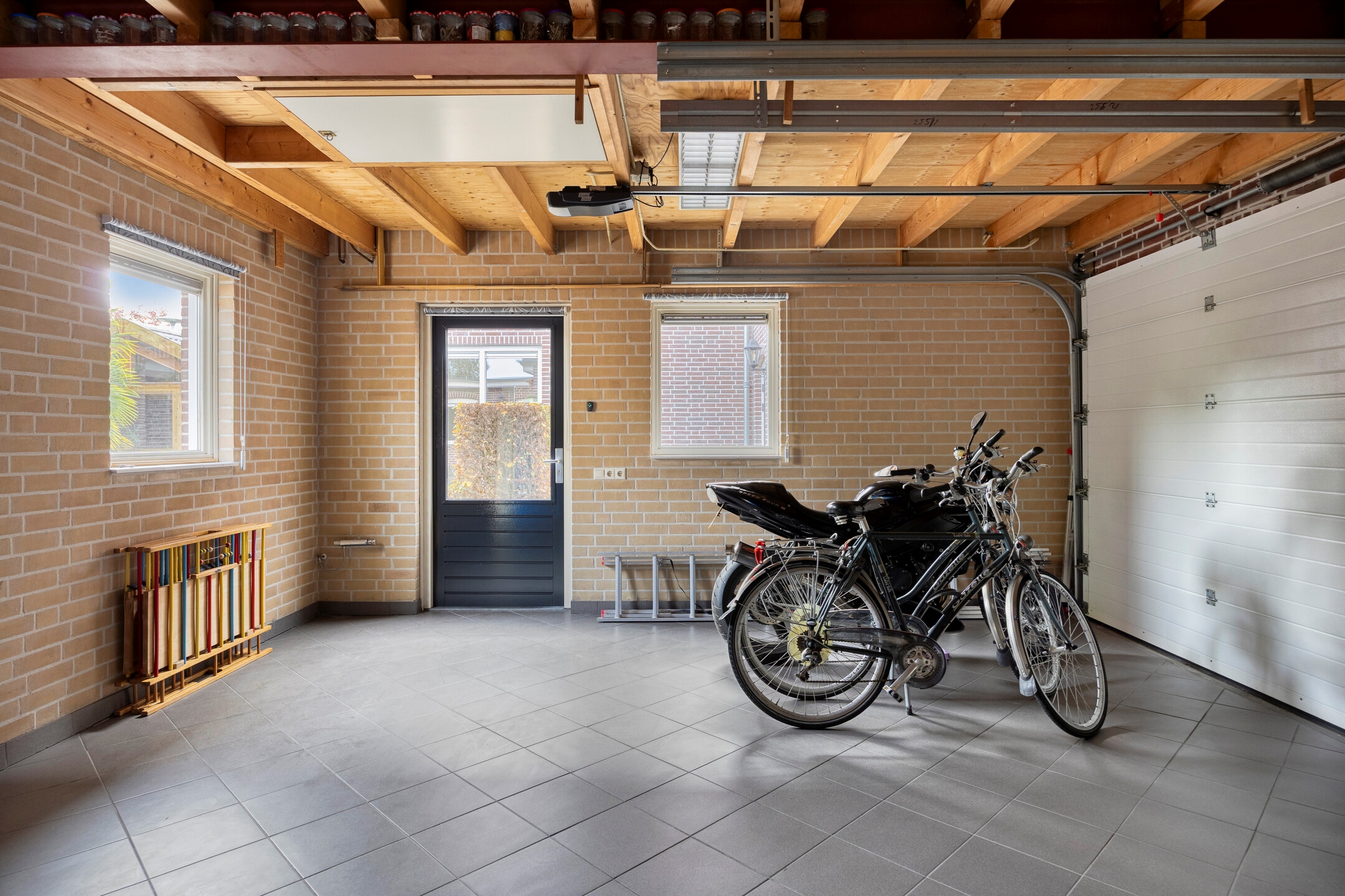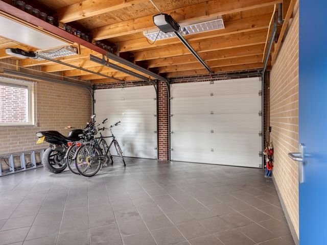Vanuit de tuin zijn zowel de garage als het bijgebouw bereikbaar. De ruime geïsoleerde garage is voorzien van vloerverwarming, warm en koud water mengkraan en beschikt over dubbele elektrische garagedeuren. Via een vlizotrap is de bergzolder bereikbaar, waar een aparte cv-ketel is geplaatst. Aansluitend bevindt zich een extra ruimte met een keukenblok en aansluitingen voor een wasmachine en droger.