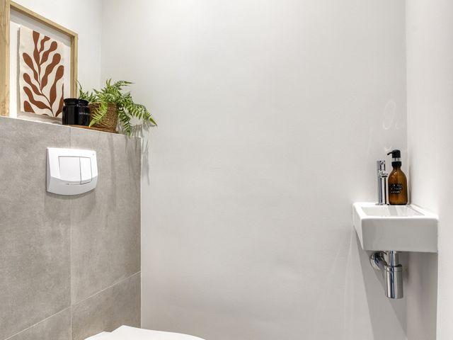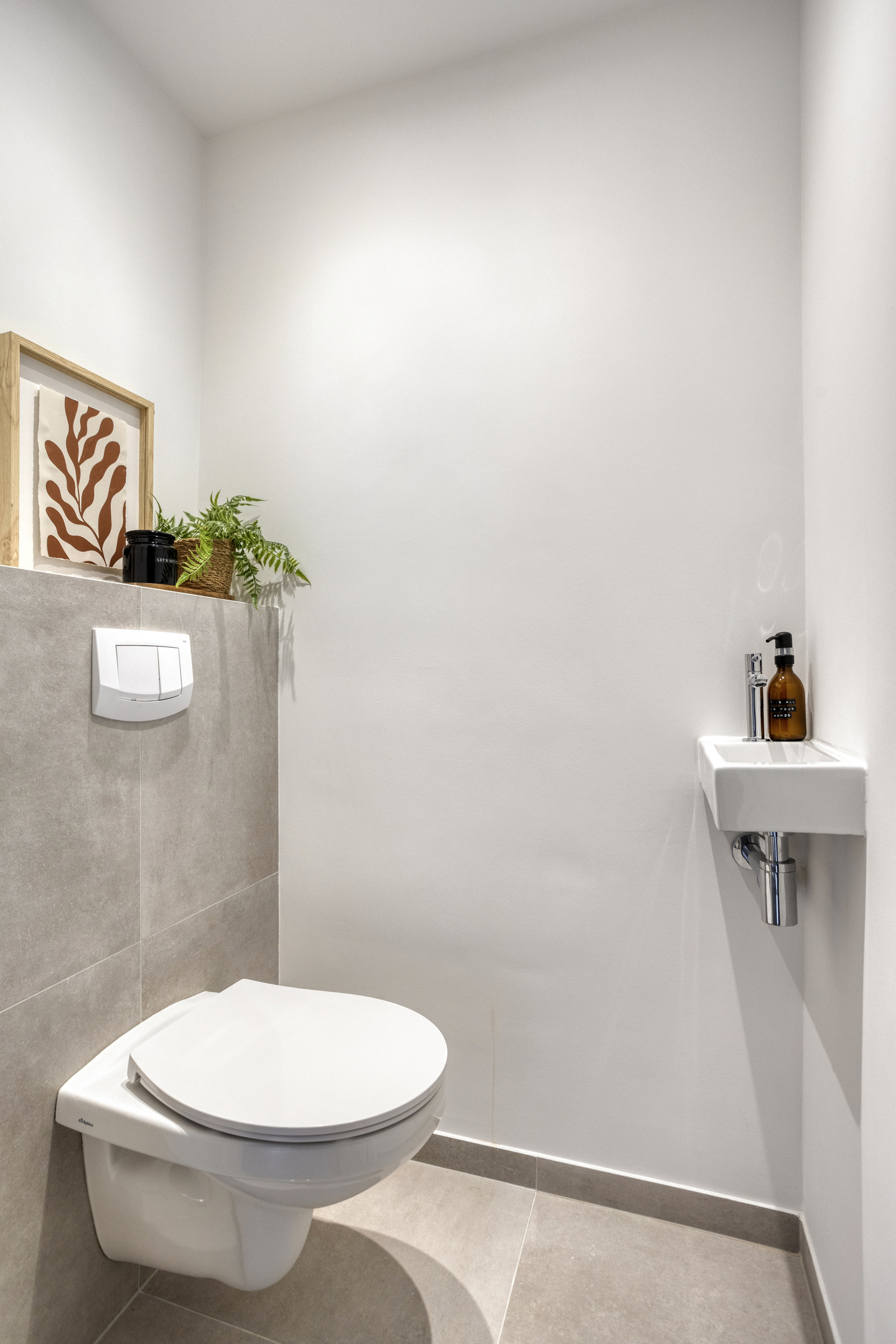 Het toilet is half betegeld en voorzien van een wandcloset en fontein.