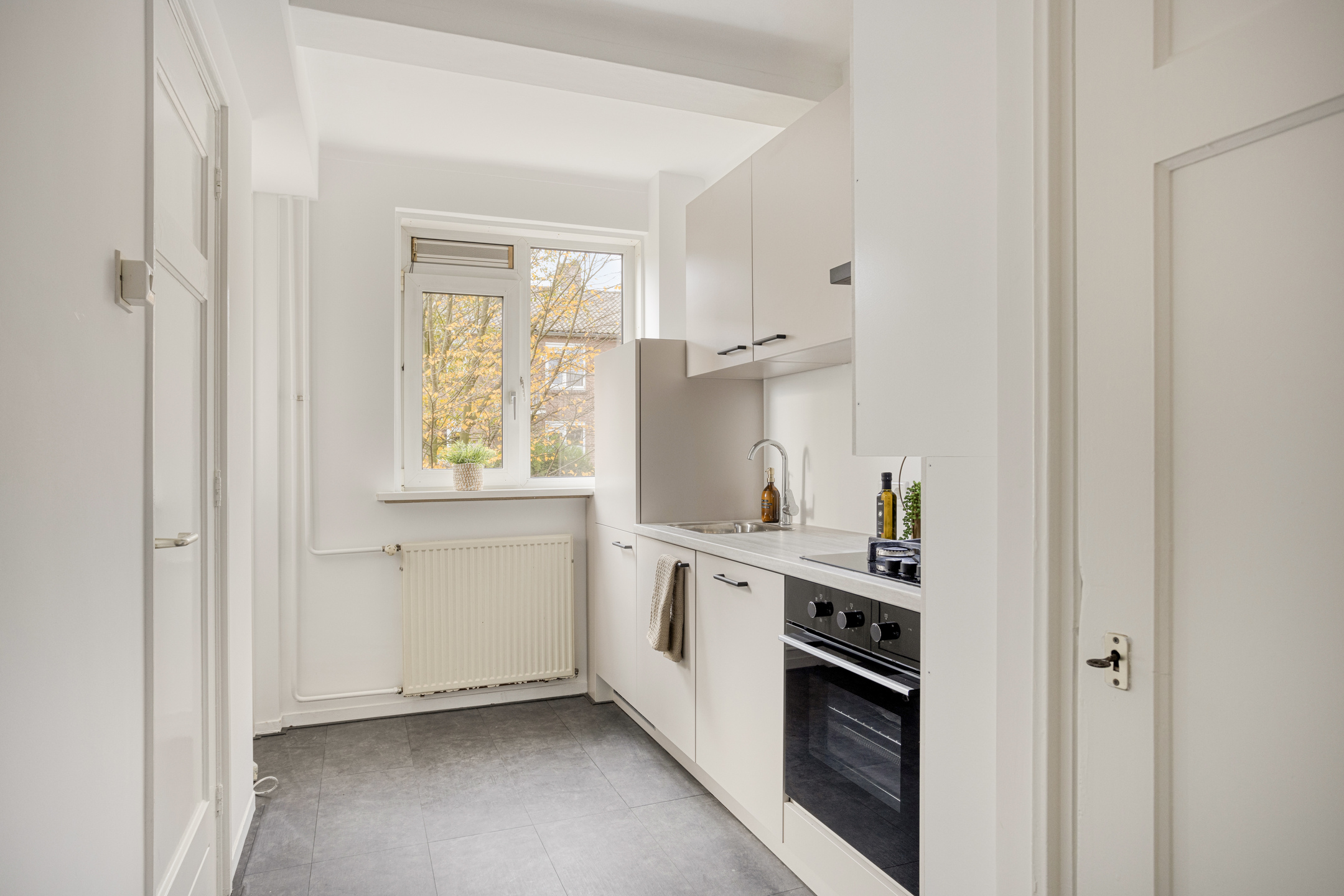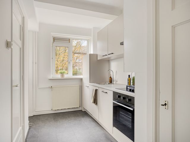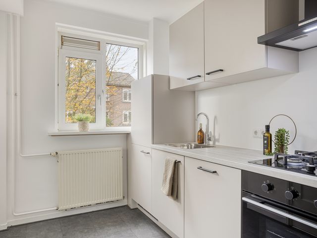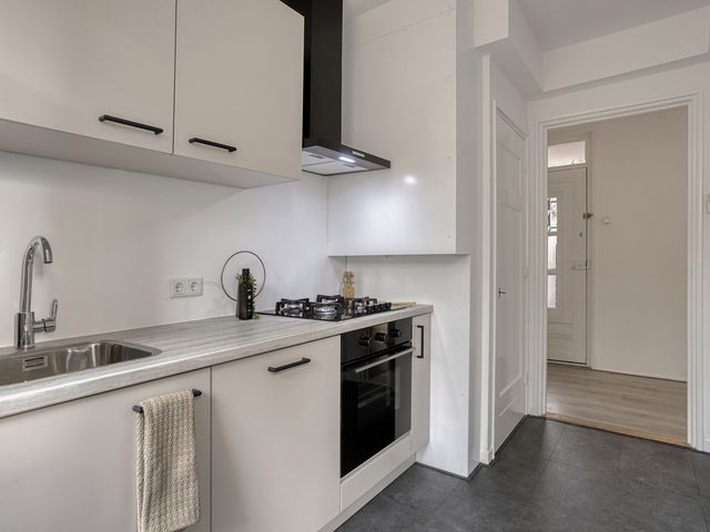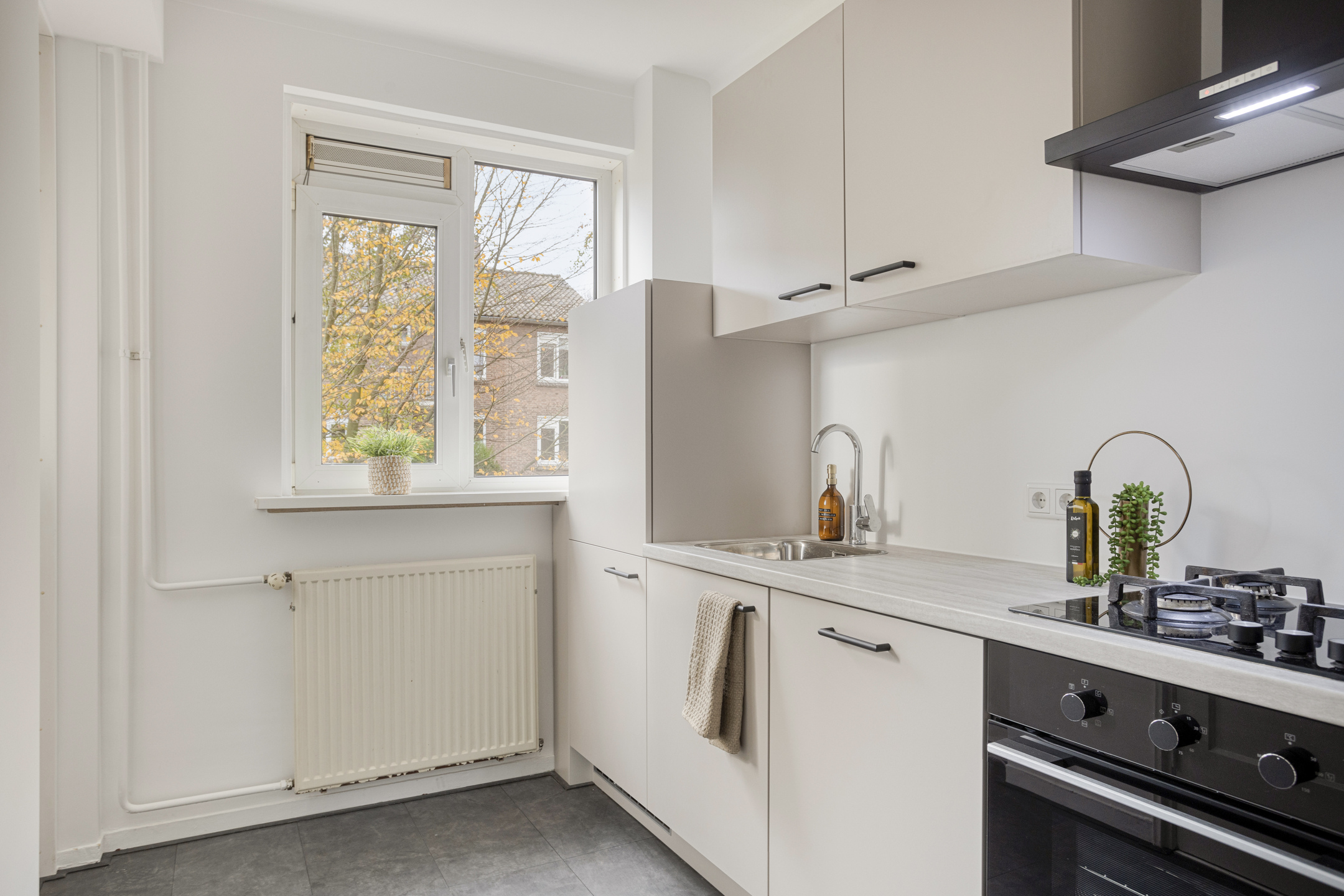 De keuken beschikt over diverse boven-/onderkasten, een koelkast, 4-pits gasfornuis, afzuigkap, vaatwasser en een oven. Vanuit de keuken is tevens het balkon op het zuidwesten te bereiken.