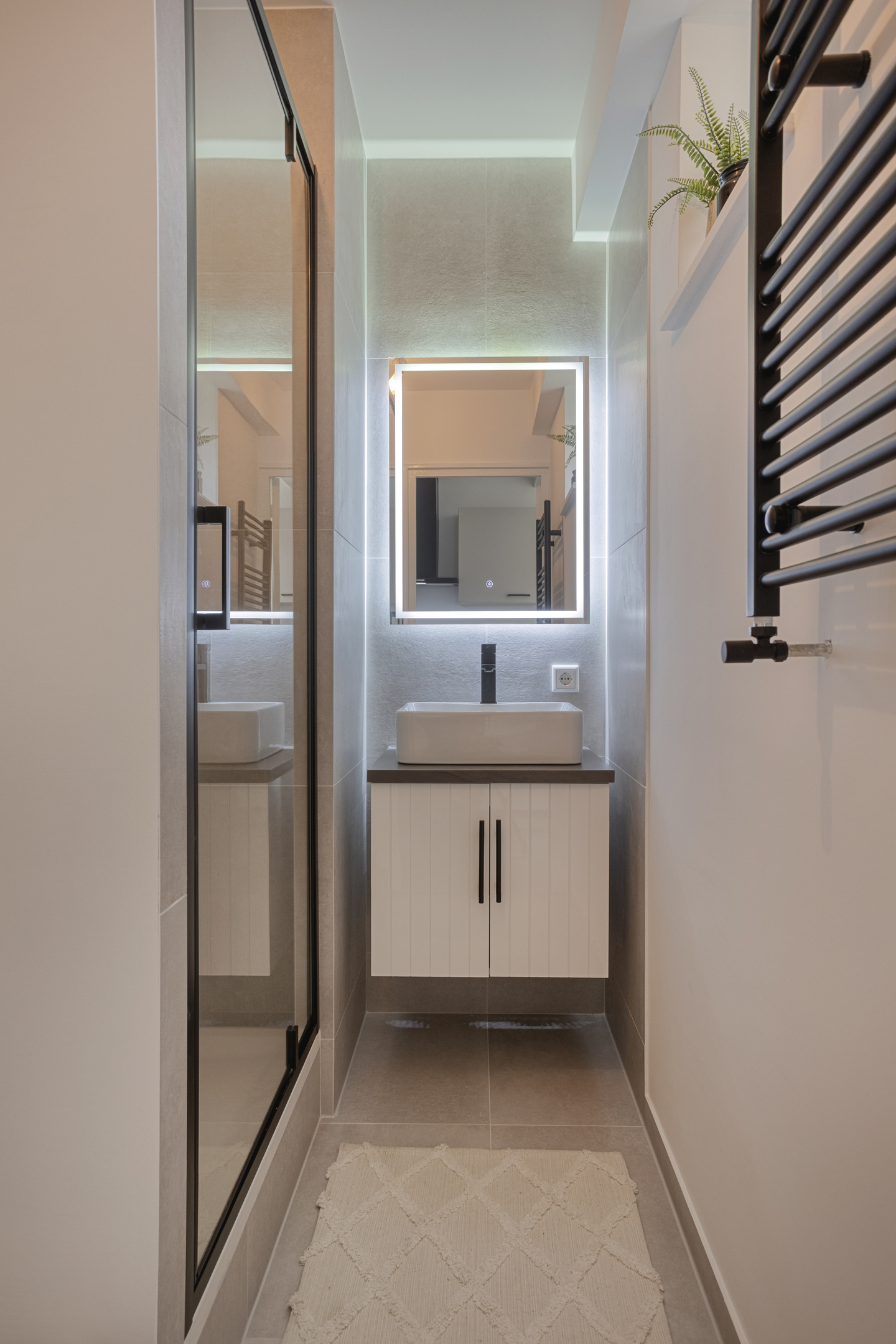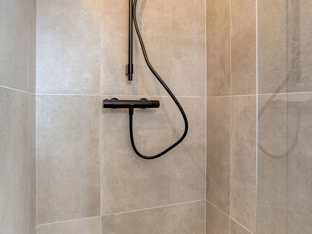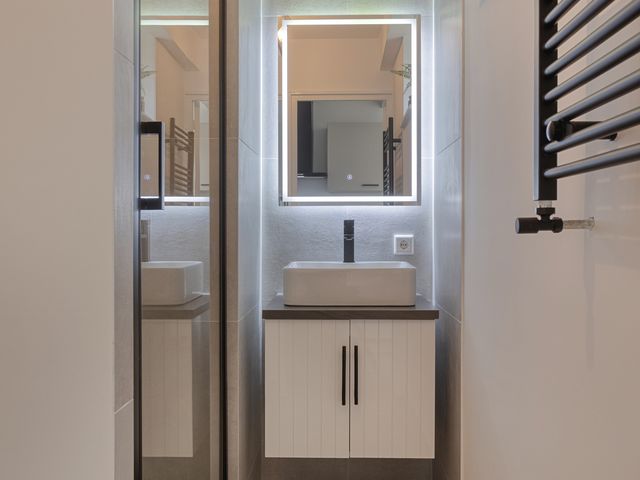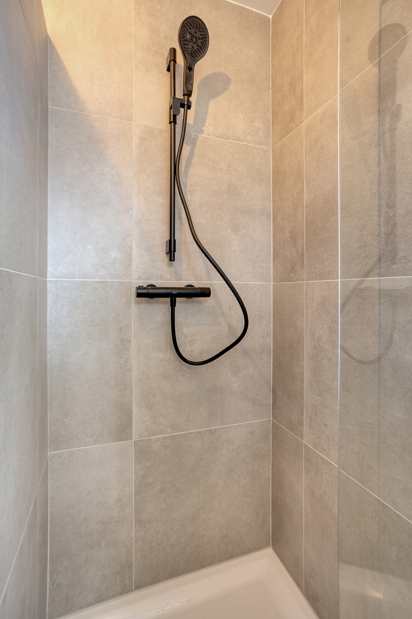 De vernieuwde badkamer is deels betegeld en voorzien van een wastafelmeubel met wastafel, designradiator en douchecabine met thermostaankraan. Tevens is hier de wasmachine-/drogeraansluiting te vinden.