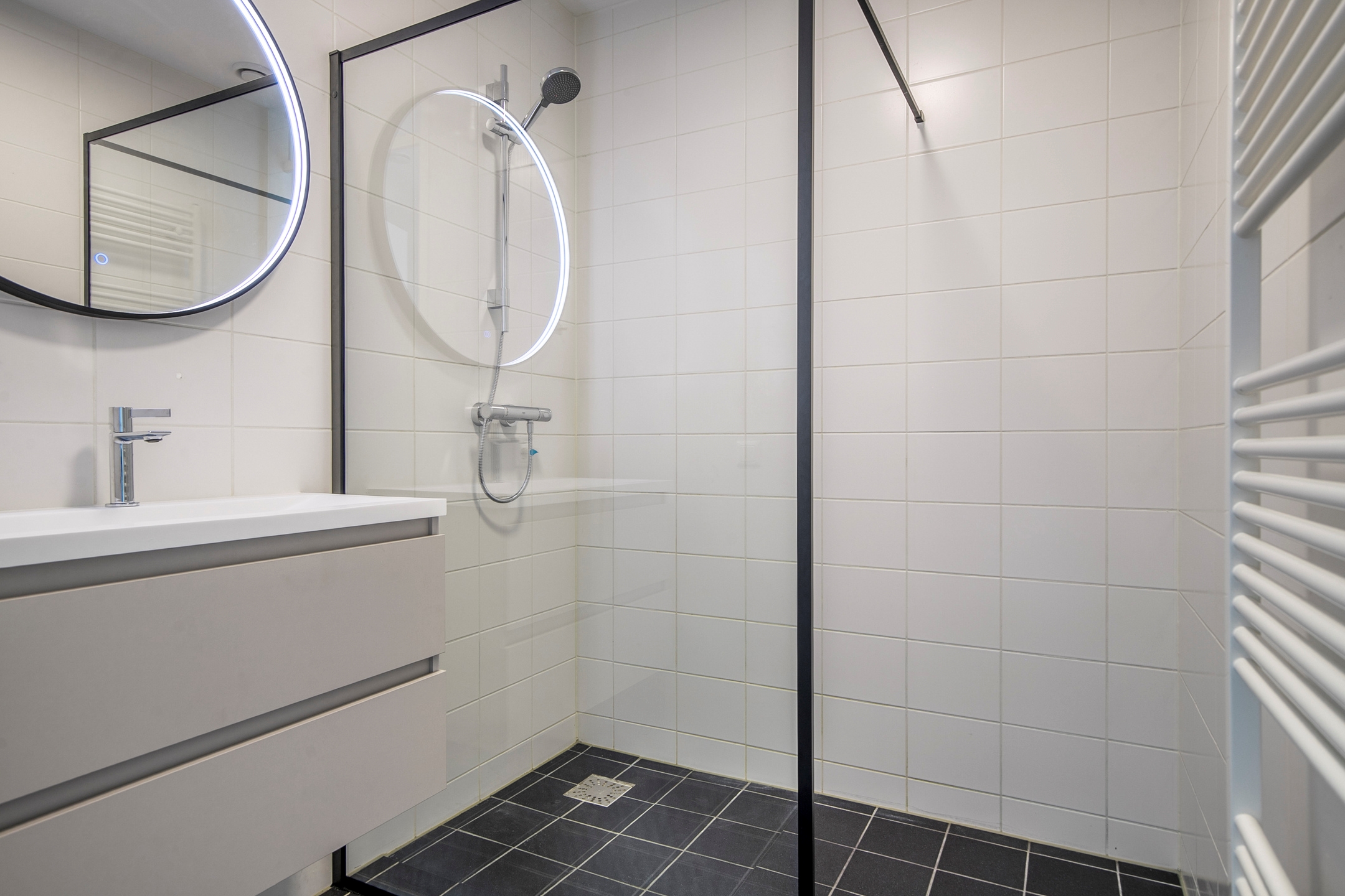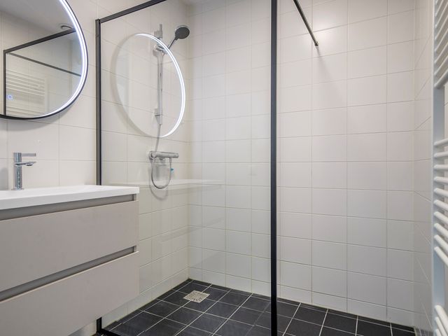 De badkamer is voorzien van een inloopdouche, een wastafel in een badkamermeubel en verlichte spiegel. De badkamer is geheel betegeld.