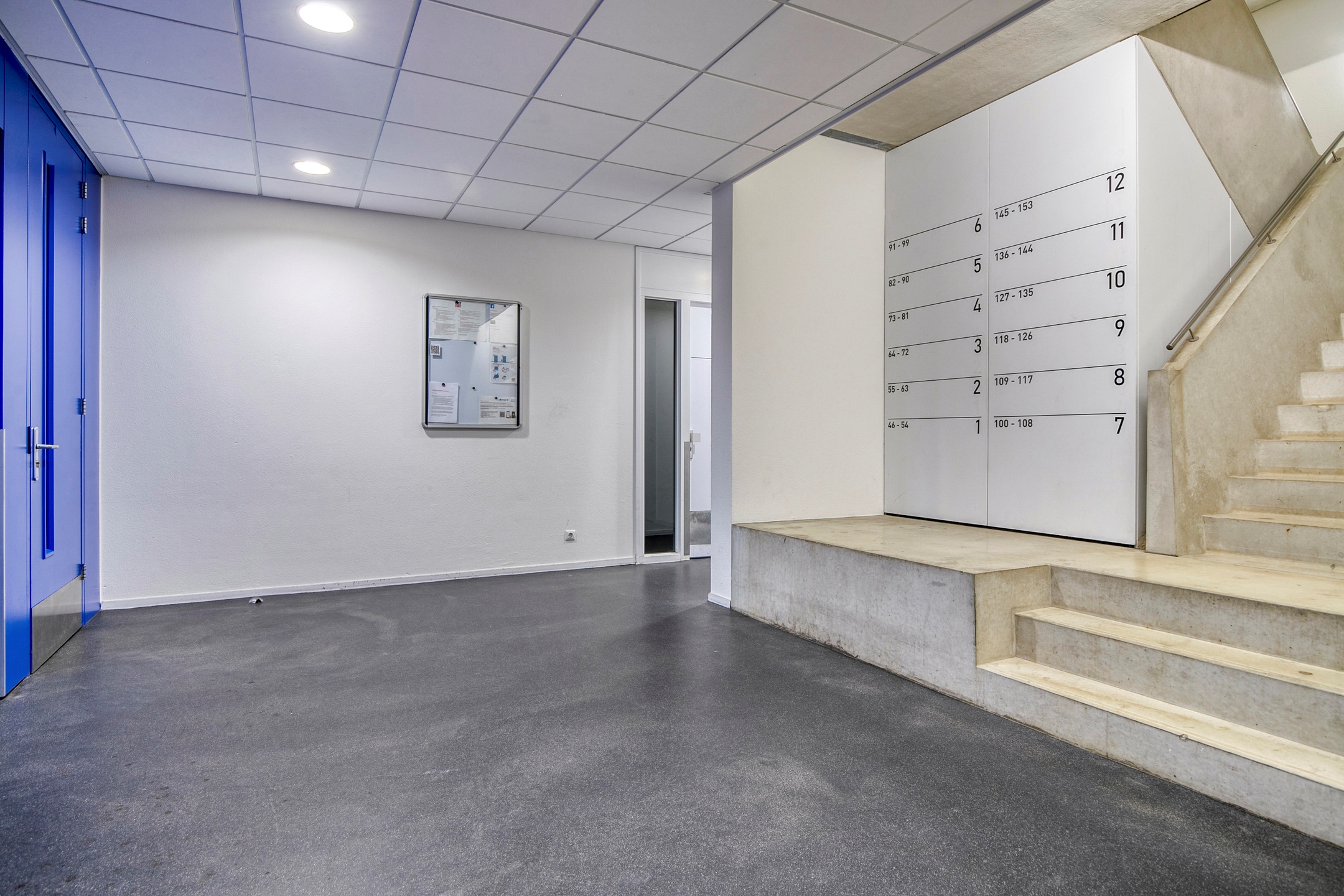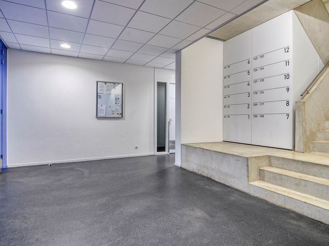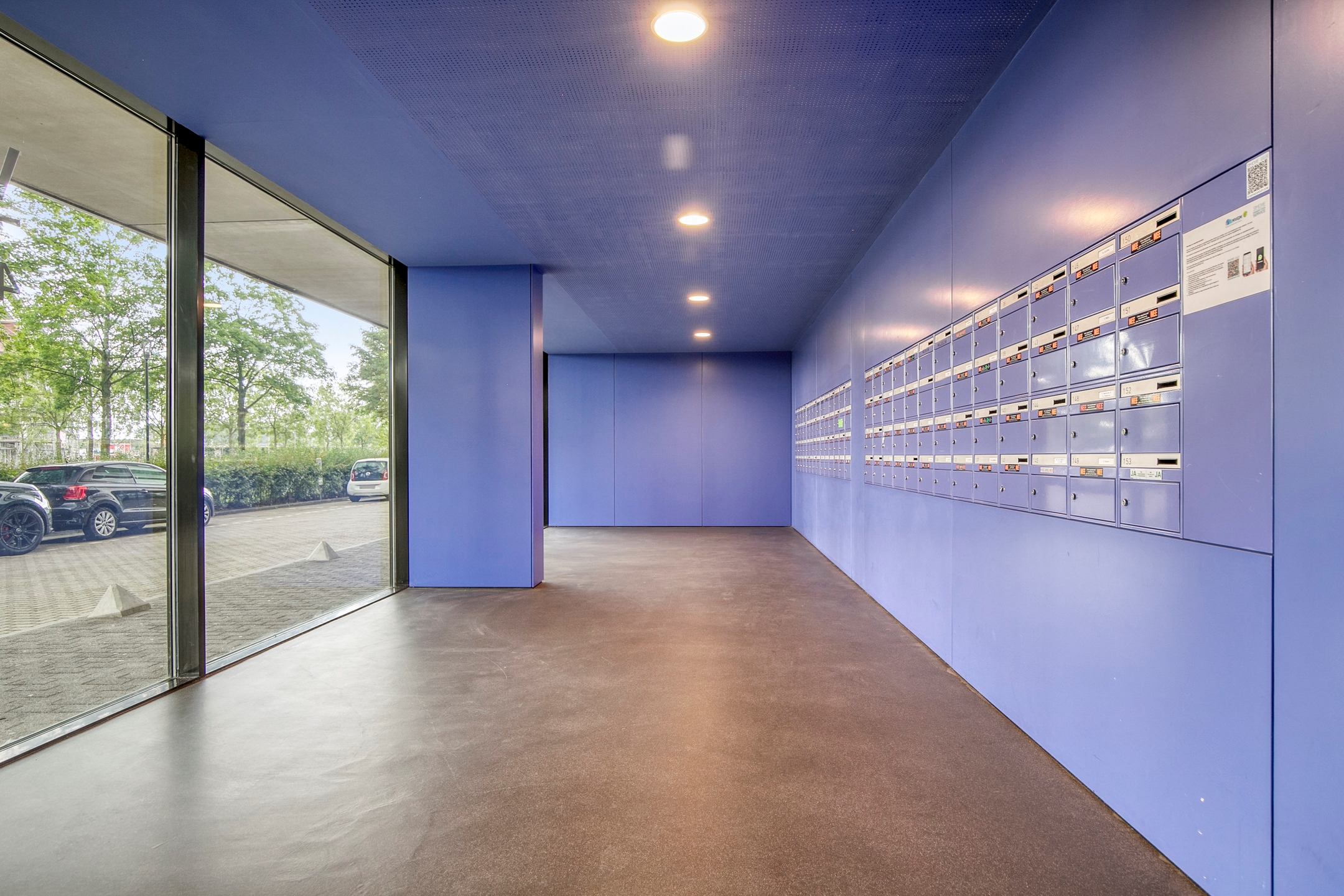 Centrale hal met een bellentableau en intercominstallatie, de brievenbussen, toegang tot de liften en het trappenhuis.