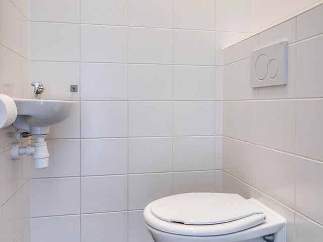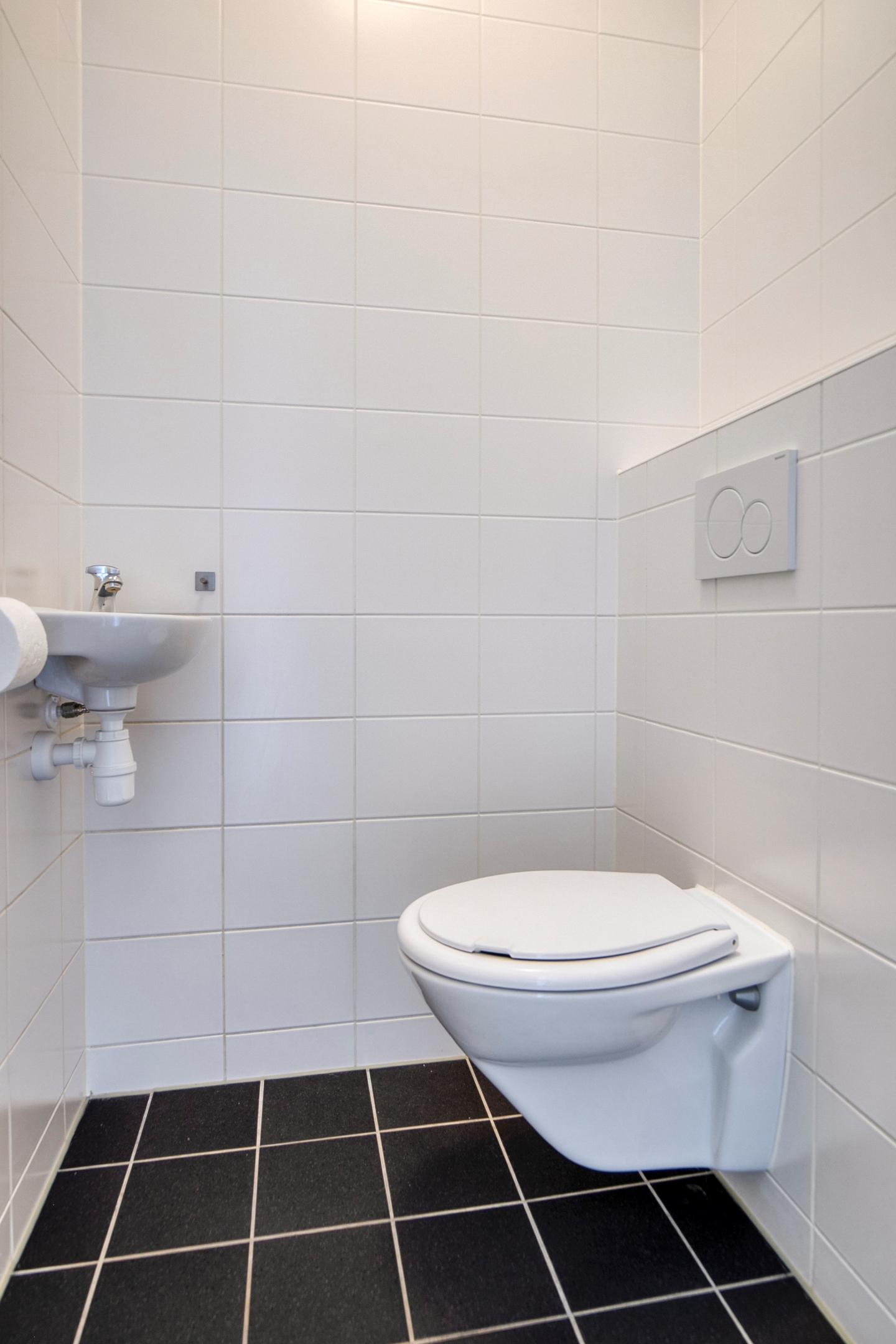 De toiletruimte voorzien van een wandcloset en een fonteintje, de vloer is afgewerkt met vloertegels en de wanden zijn geheel betegeld.