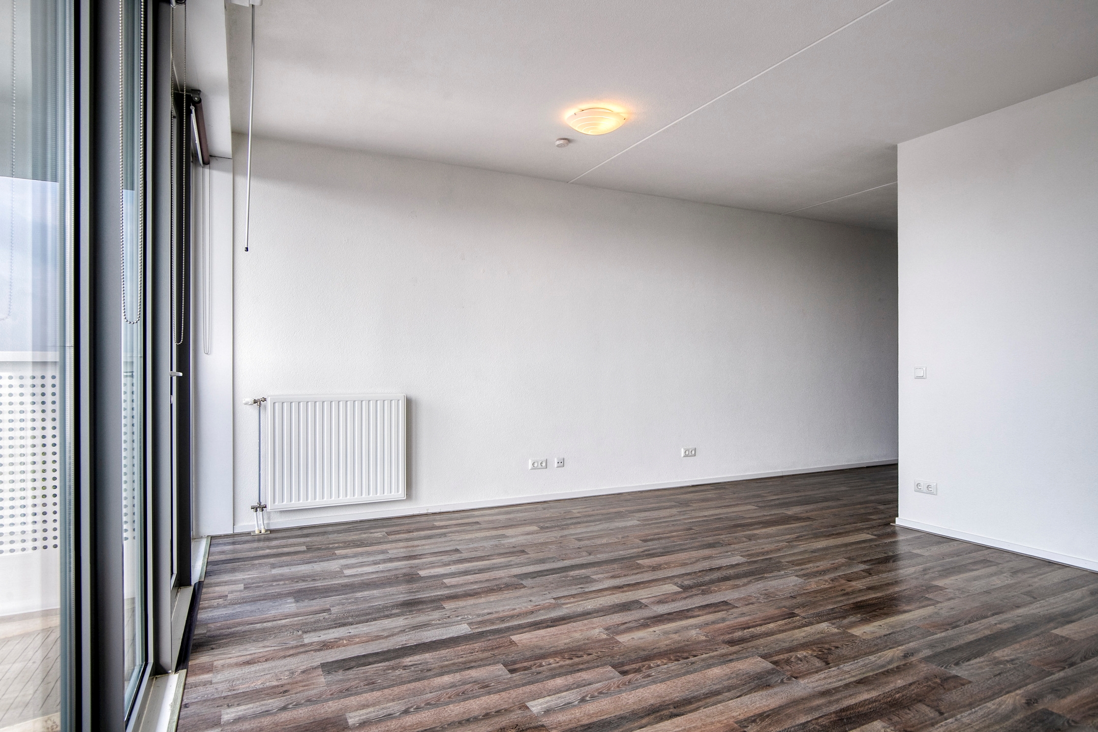 Dankzij de royale glazen pui geniet de woonkamer van een aangename hoeveelheid daglicht. De gestucte wanden zorgen voor een moderne uitstraling en via een deur is er toegang tot het ruime balkon.