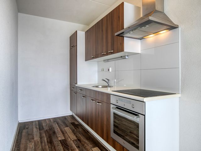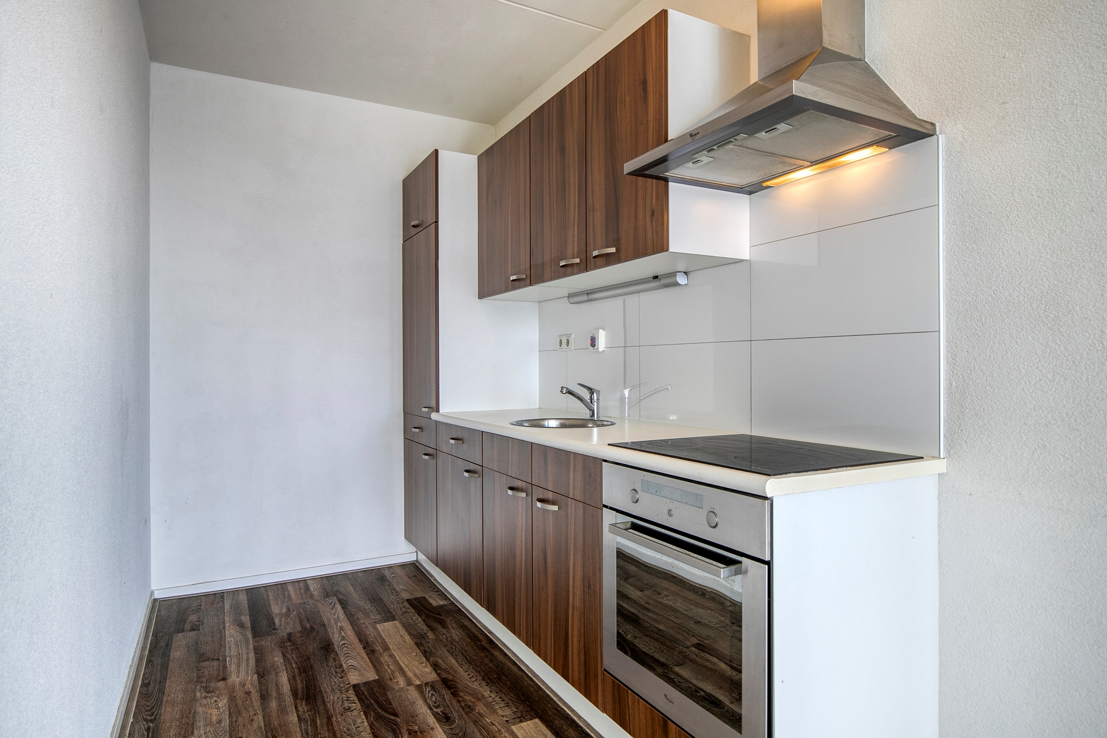 De open keuken is voorzien van keukenkasten en is uitgerust met de volgende inbouwapparatuur; 4-pits elektrische kookplaat, rvs afzuigkap, oven en een koelkast.