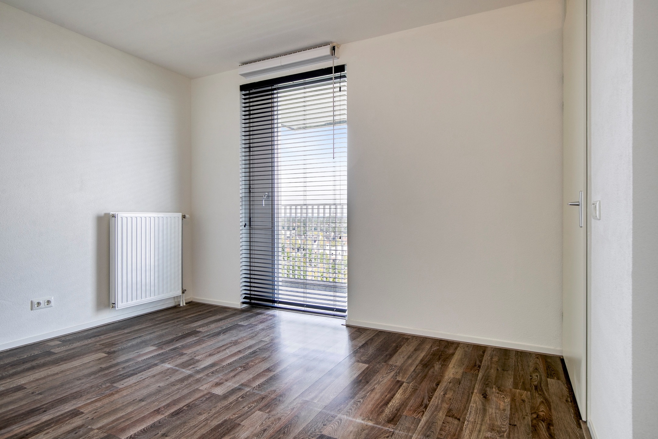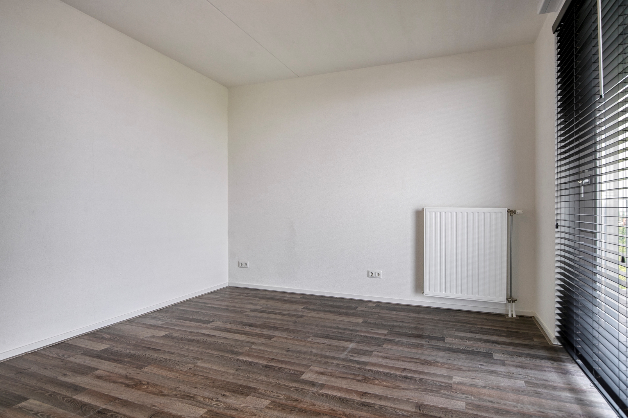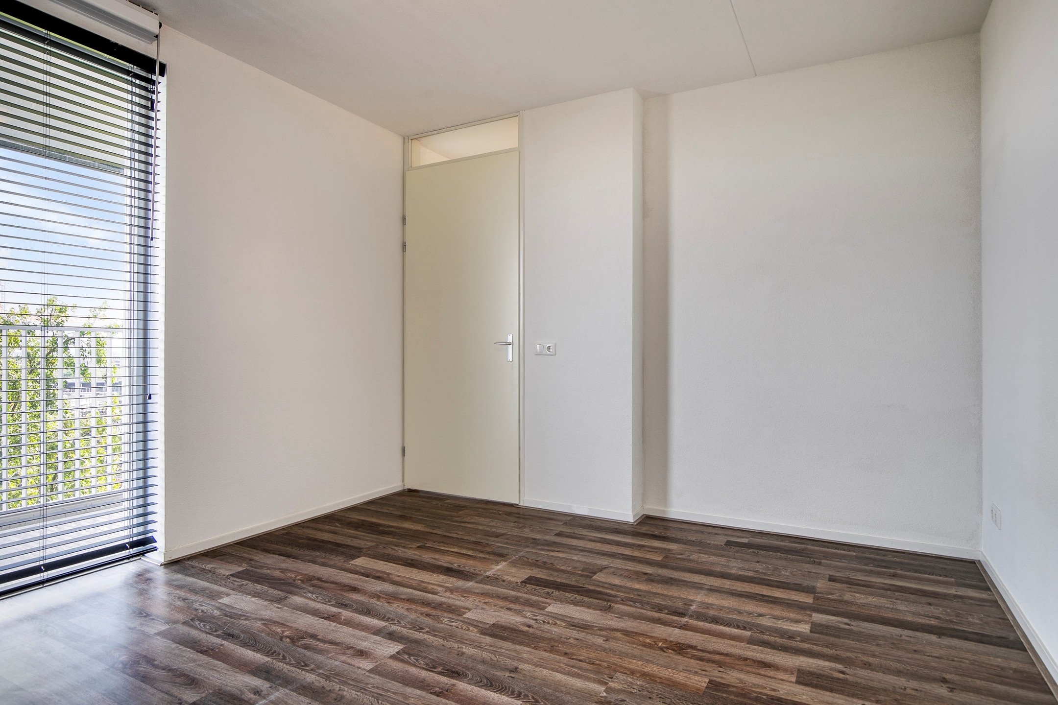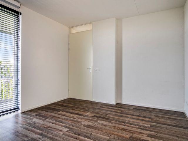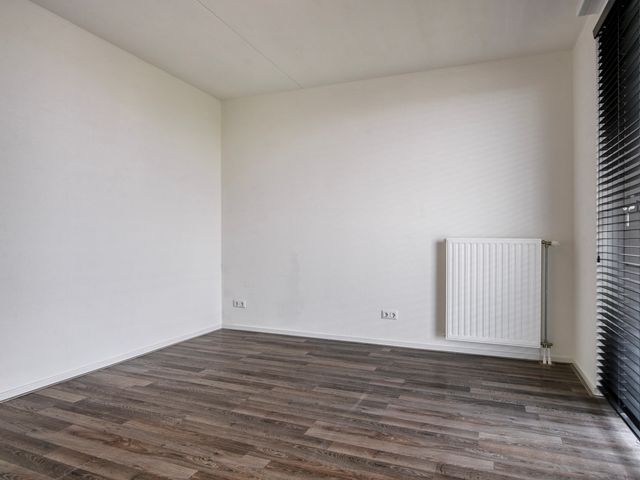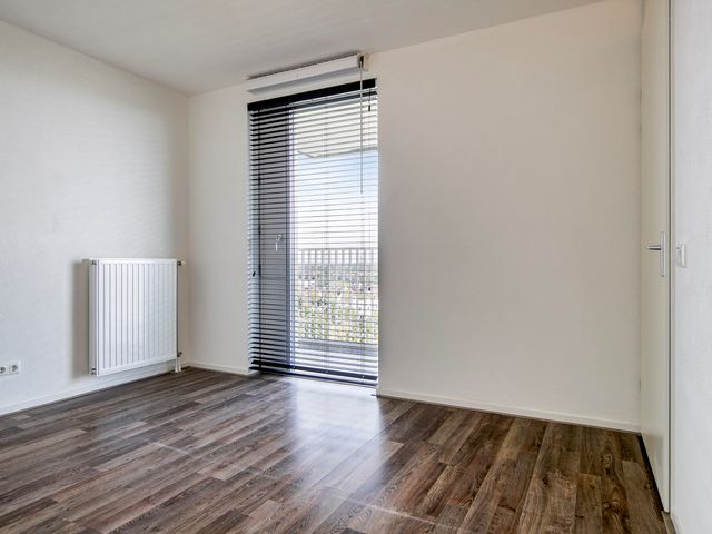De ruime en lichte slaapkamer is voorzien van een laminaatvloer en de wanden zijn voorzien van stucwerk.