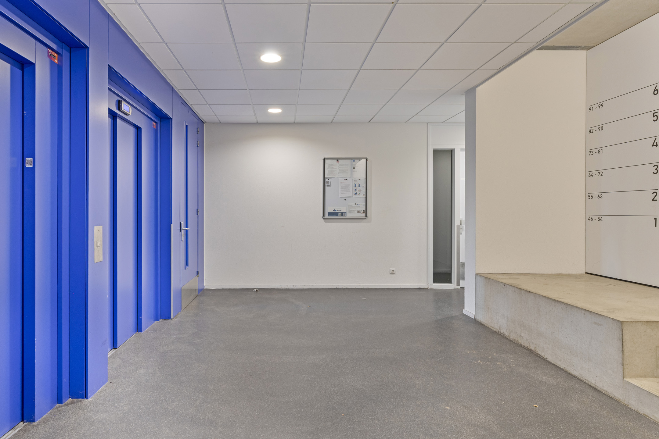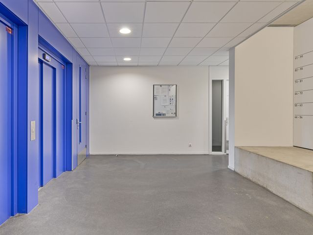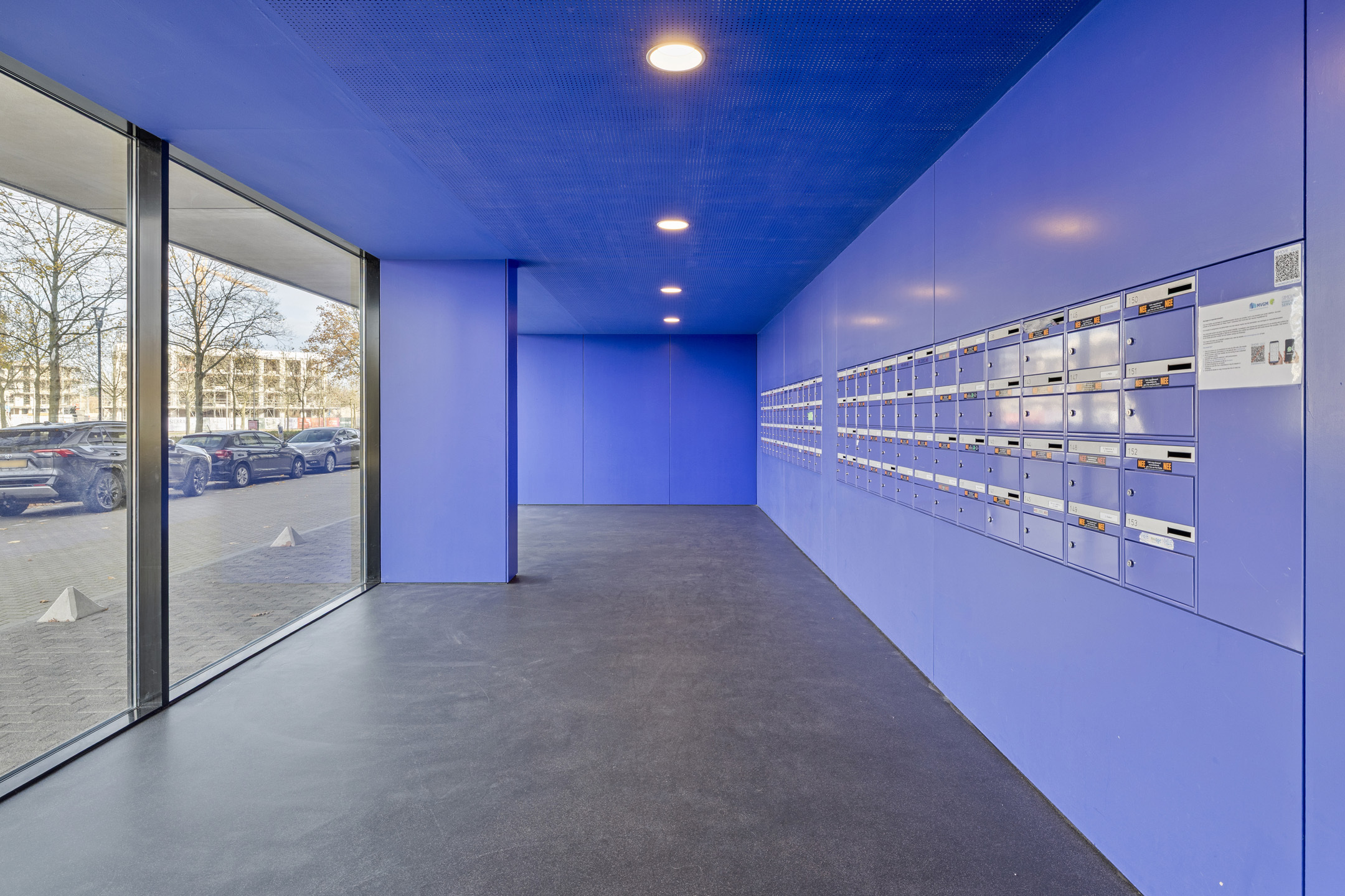 Centrale hal met een bellentableau en intercominstallatie, de brievenbussen, toegang tot de liften en het trappenhuis.