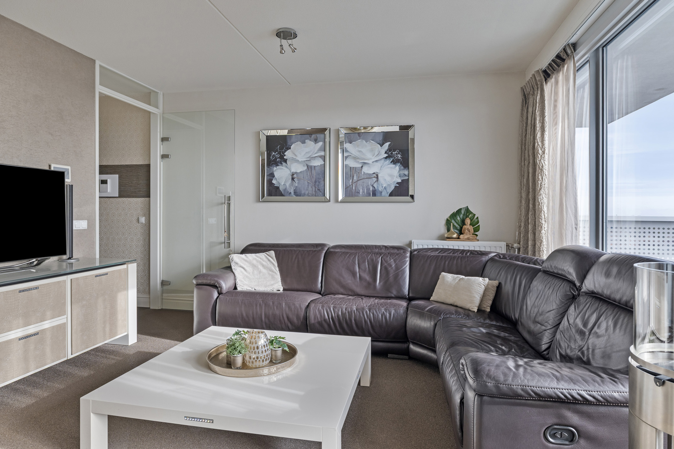 Vanuit de hal leid een glazen deur je naar de lichte woonkamer. Dankzij de grote glazen pui geniet de ruimte van volop daglicht en heb je direct toegang tot het ruime balkon.