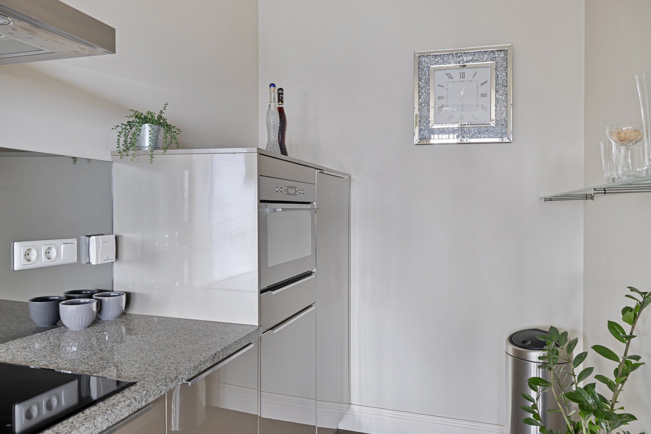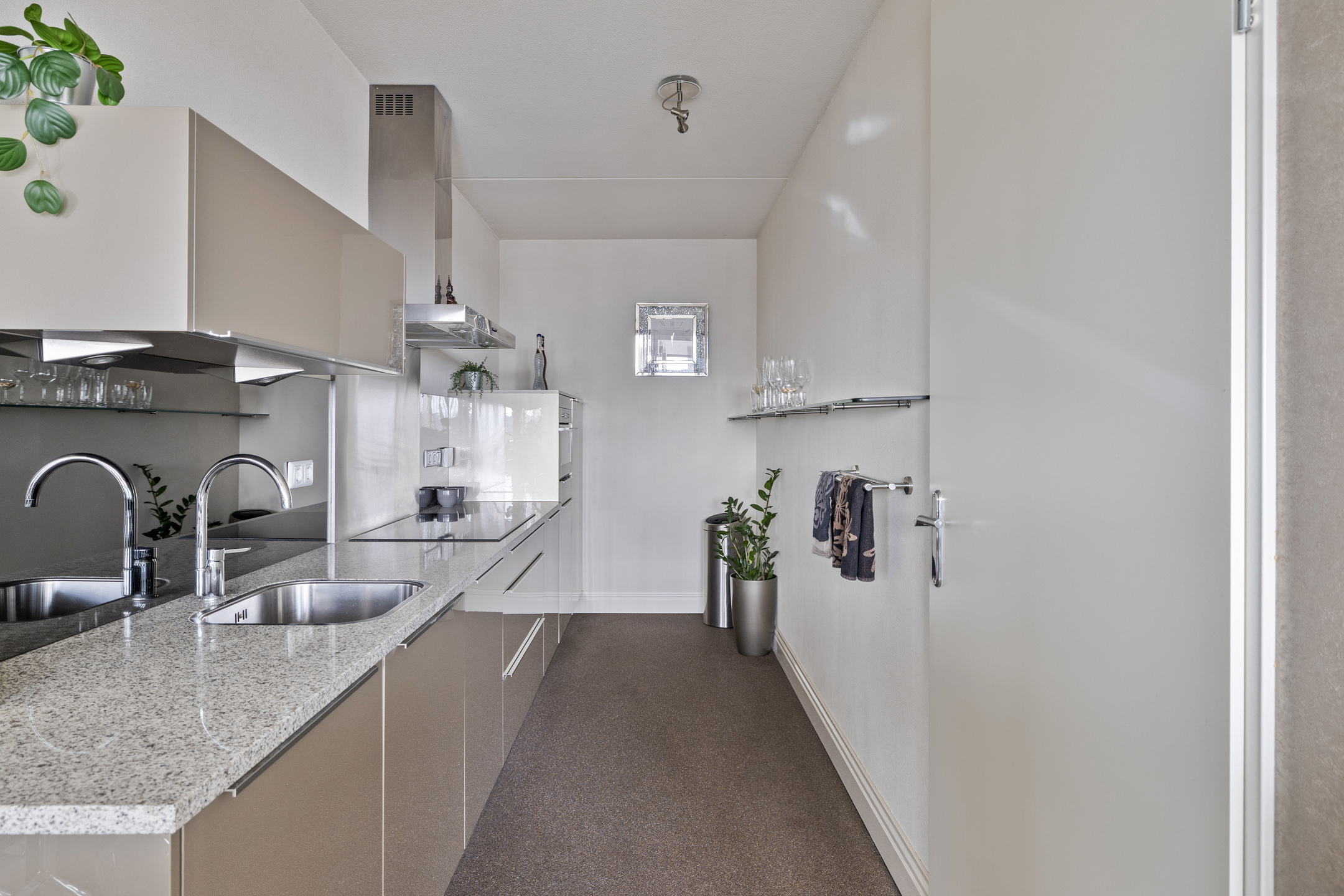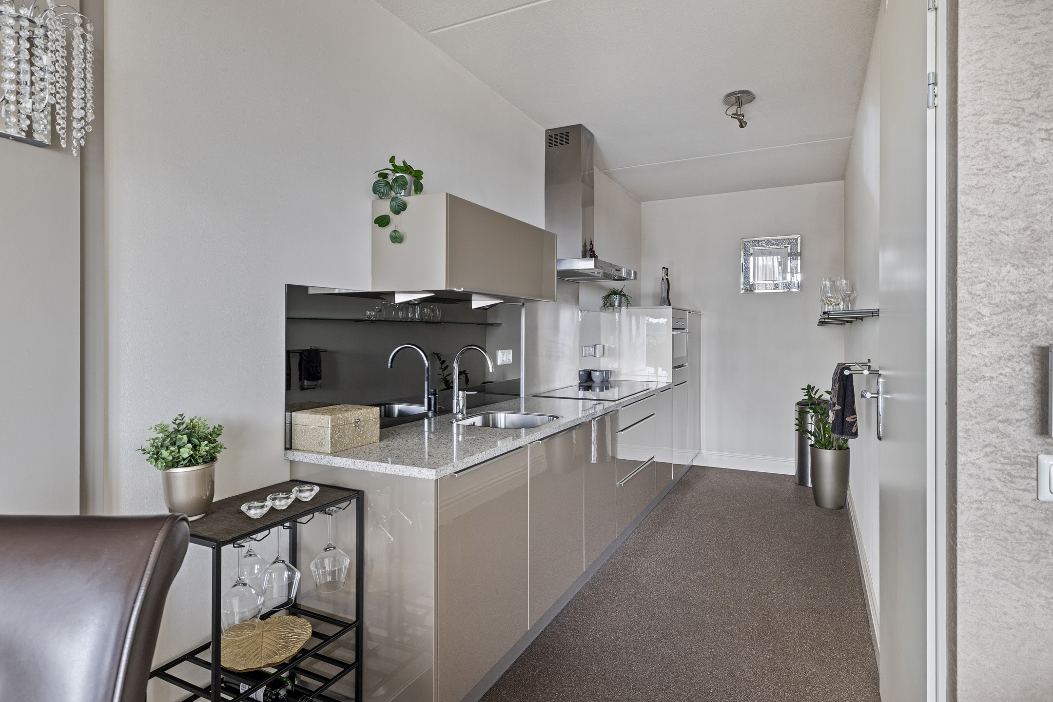 De open keuken is voorzien van meerdere onderkasten en een bovenkast. De keuken is uitgerust met de volgende inbouwapparatuur; 4-pits AEG inductiekookplaat met RVS afzuigkap, combi-oven, koelkast en vriezer.