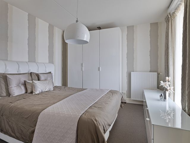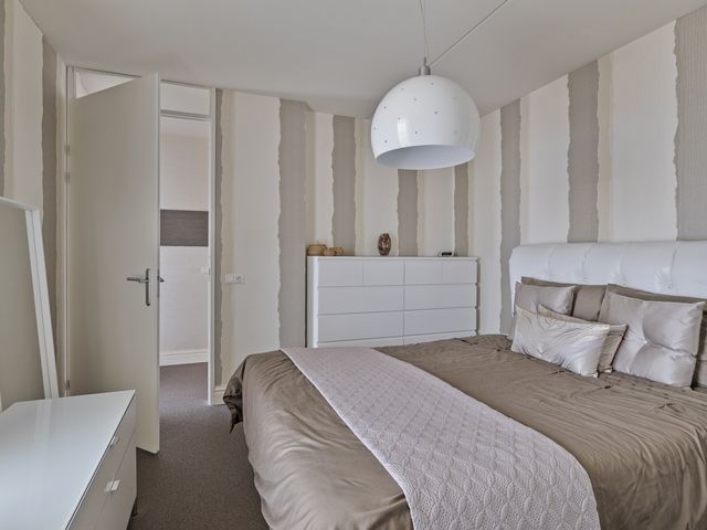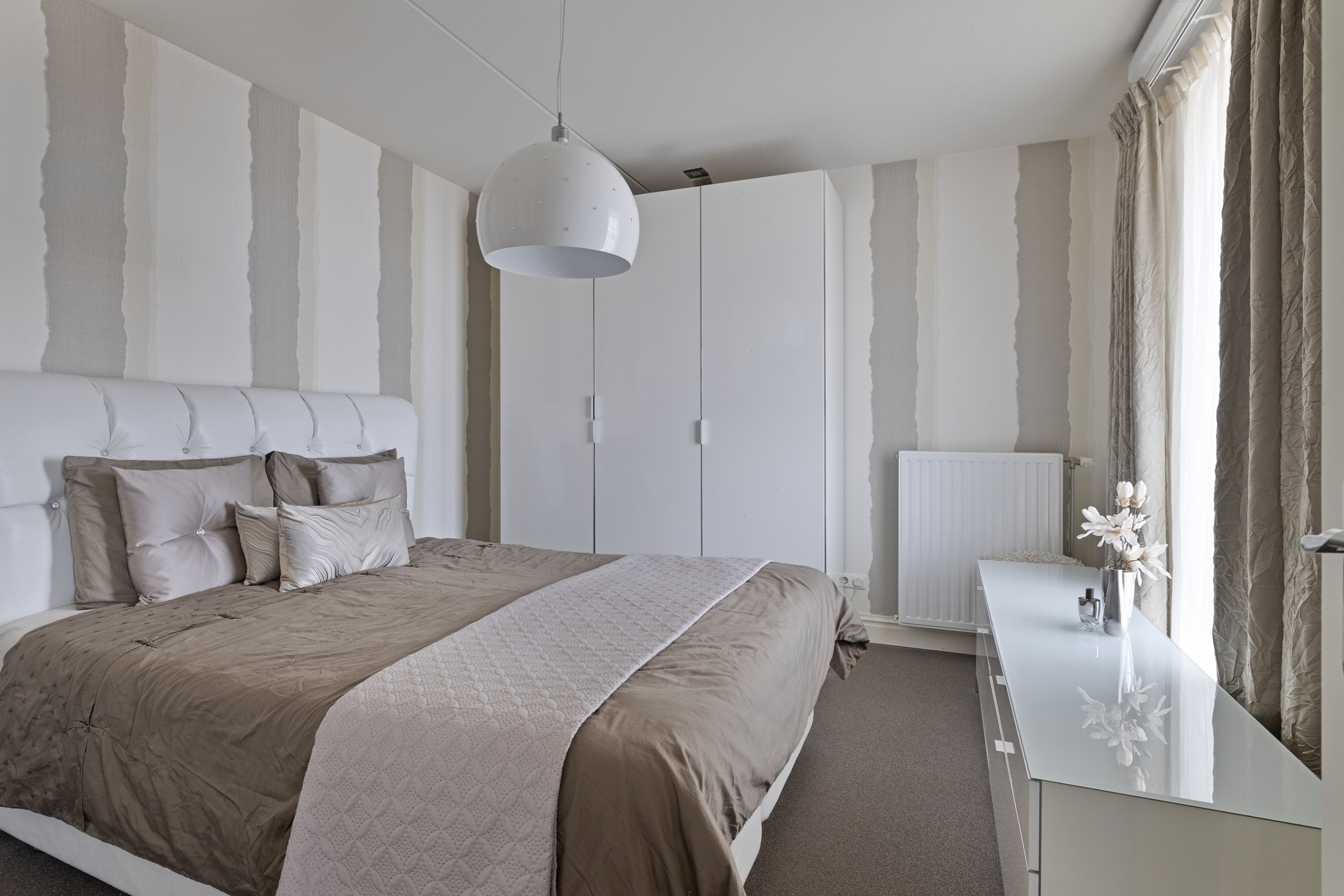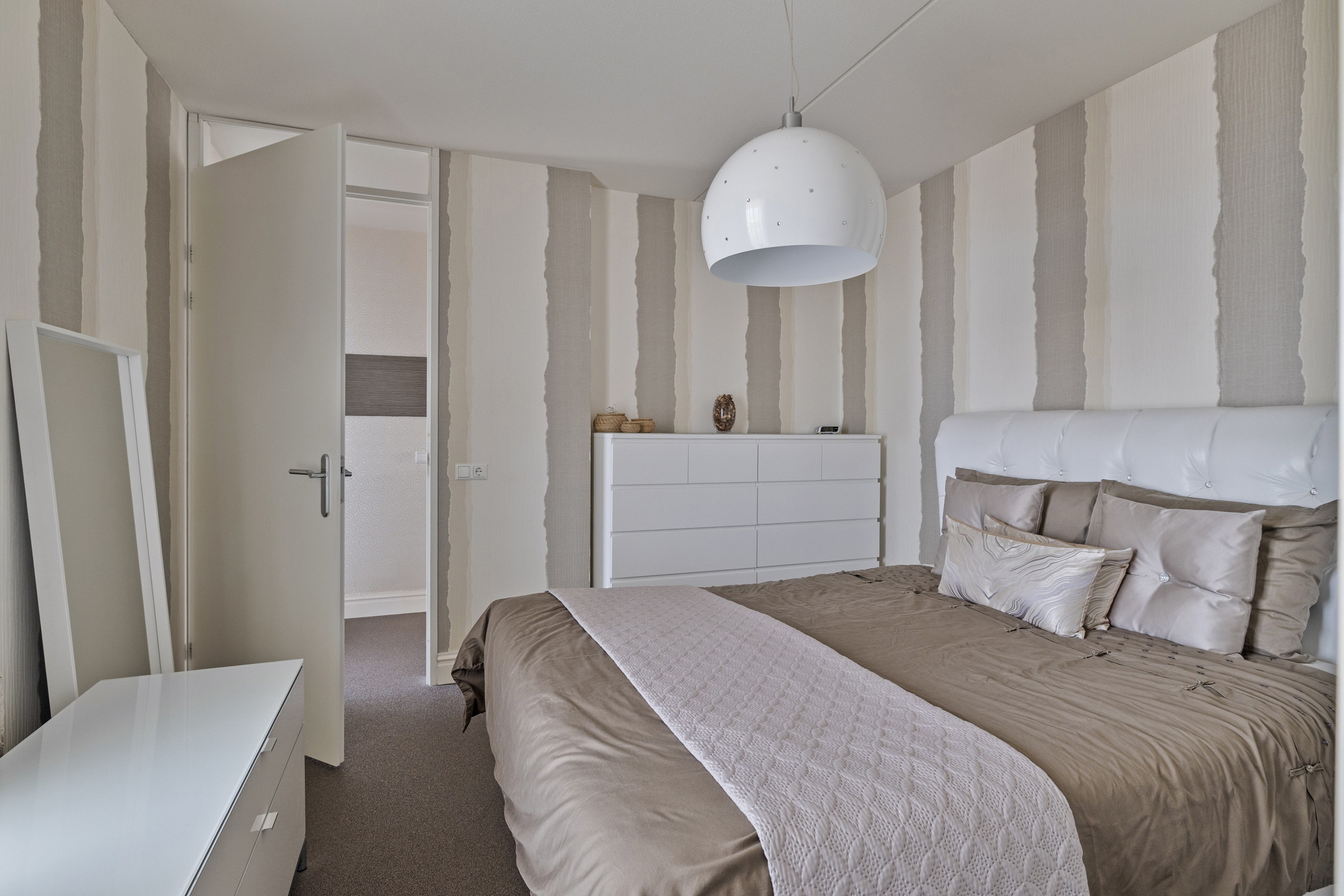 Vanuit de entree betreedt je de royale en lichte slaapkamer. De wanden van deze slaapkamer zijn afgewerkt met behang.