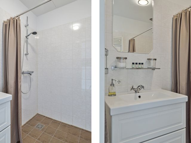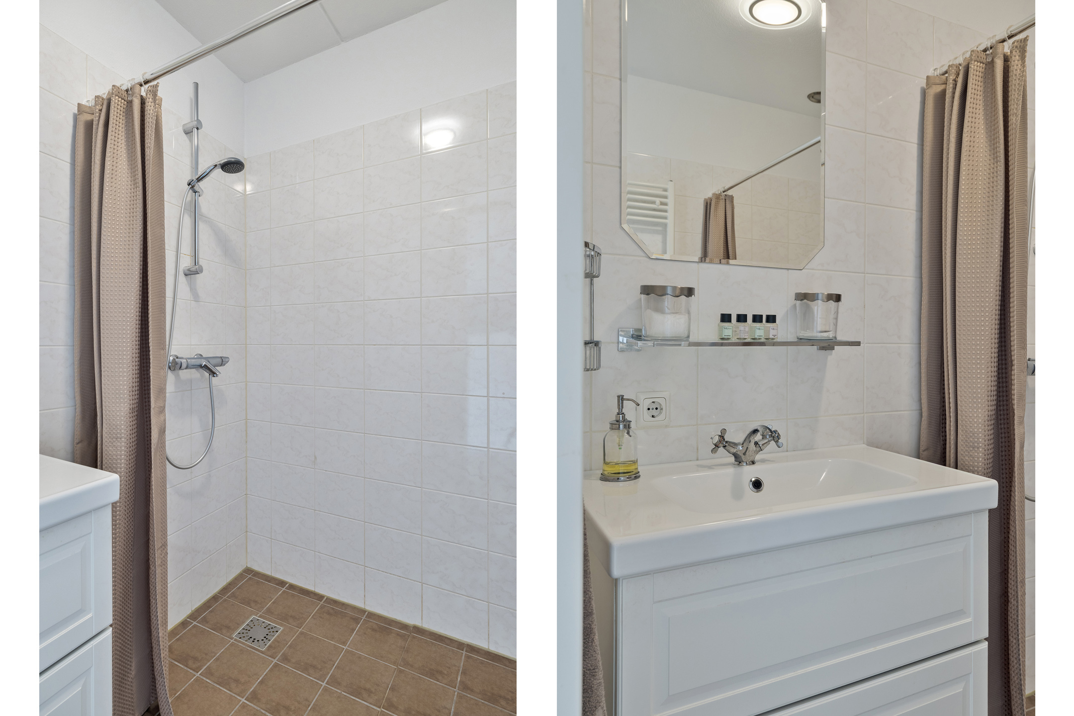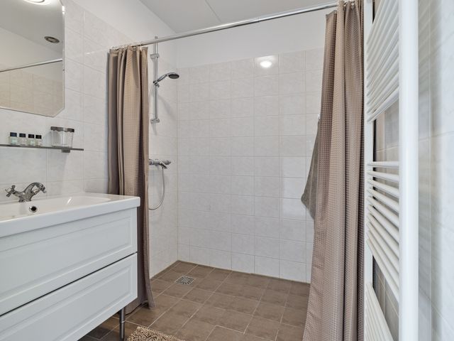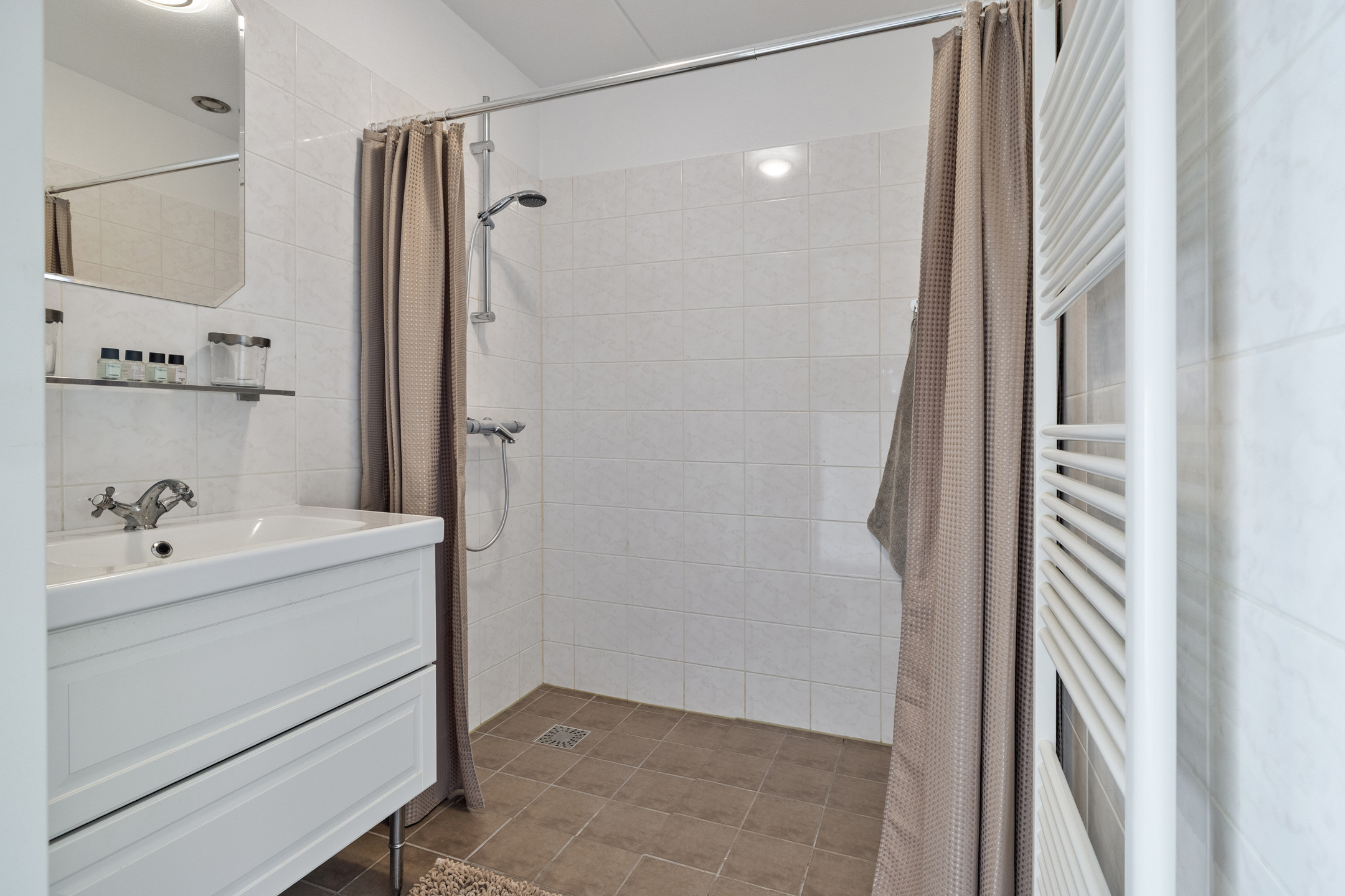 Vanuit de entree is tevens de badkamer te bereiken. Deze badkamer is voorzien van een ruime inloopdouche en een wastafel in een badkamermeubel. De badkamer is nagenoeg volledig betegeld.