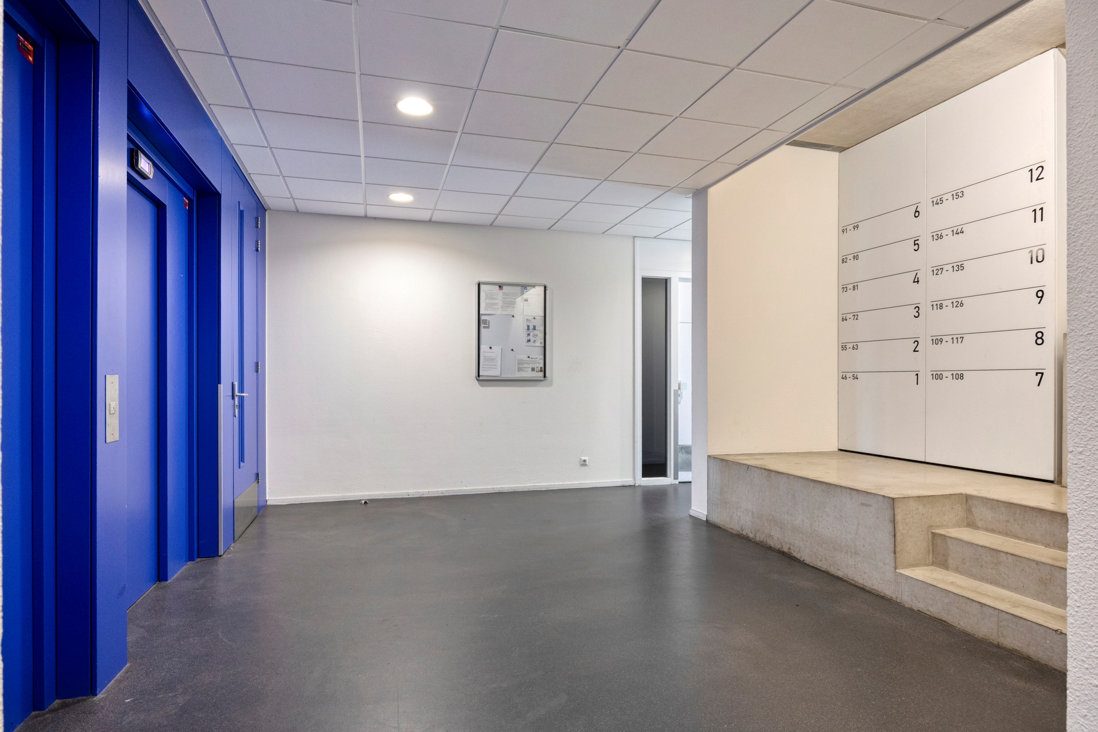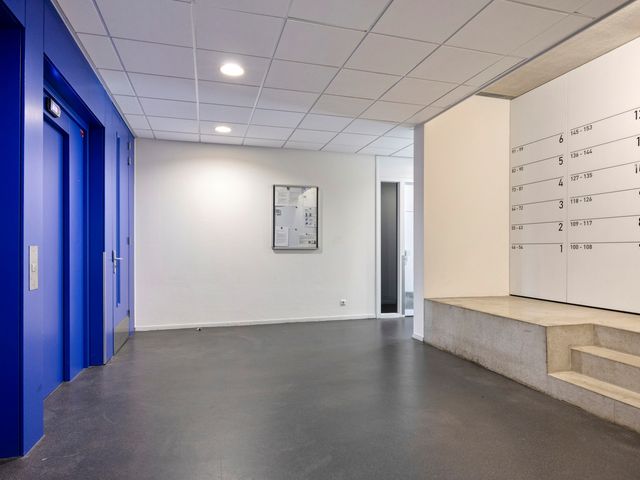 Centrale hal met een bellentableau en intercominstallatie, de brievenbussen, toegang tot de liften en het trappenhuis.